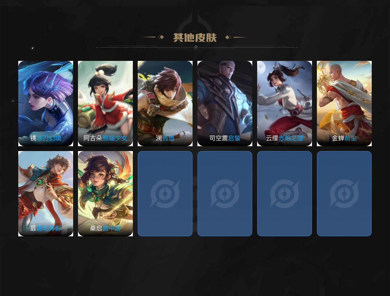 关羽冰锋战神,裴擒虎李小龙,上官婉儿梁祝,韩信逐梦之影,铠青龙志,百里玄策白虎志,花木兰瑞麟志,百里守约朱雀志,孙悟空大圣娶亲,露娜一生所爱,干将莫邪冰霜恋舞曲,孙悟空美猴王,孙悟空孙行者,澜愿照·九州拓,虞姬愿照·岁时盈,妲己愿照·众生和