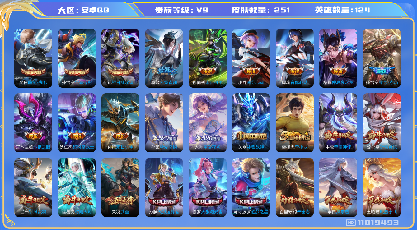 [11019493]【商品标题】:安卓Q-V9-最强王者段位-124英雄-251皮肤-3典藏-0珍品无双-0无双-0珍品传说-21传说-70史诗