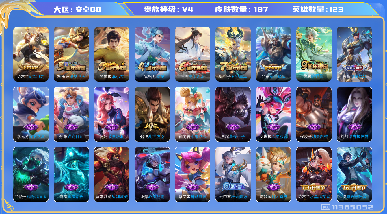 [11365052]【商品标题】:安卓Q-V4-至尊星耀III段位-123英雄-187皮肤-0典藏-0珍品无双-0无双-0珍品传说-3传说-36史诗
