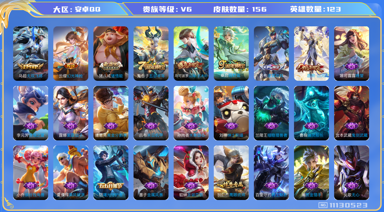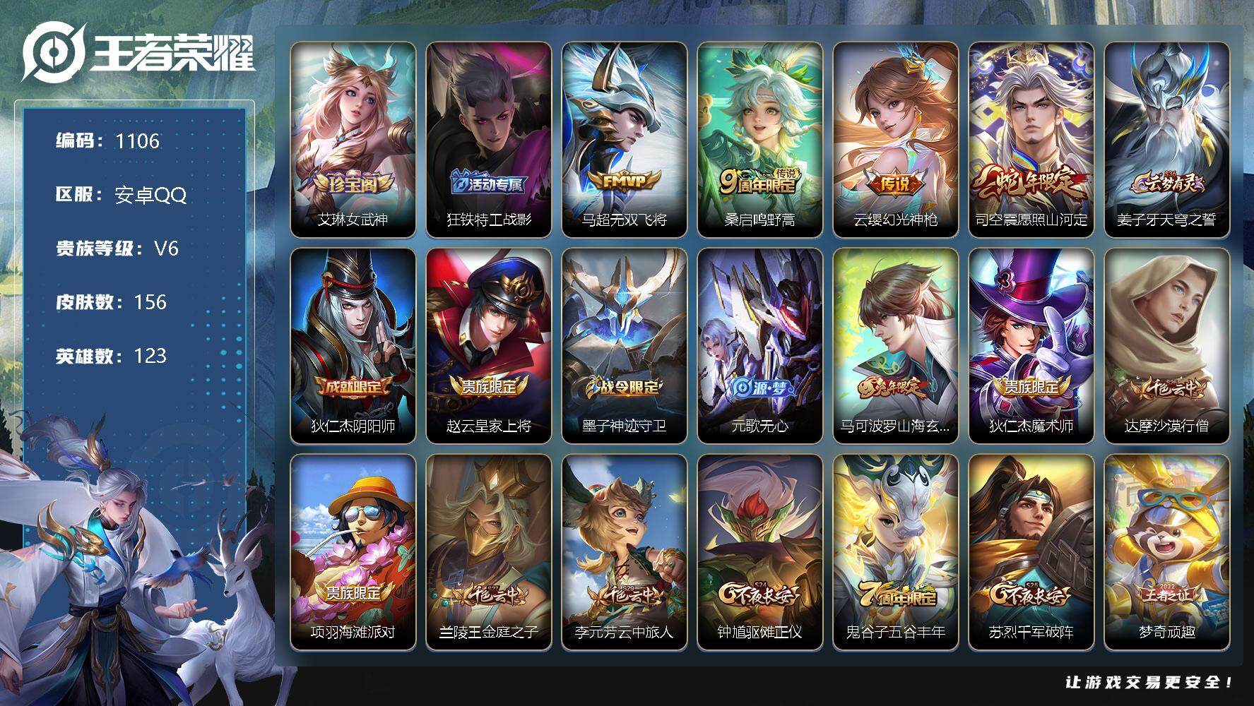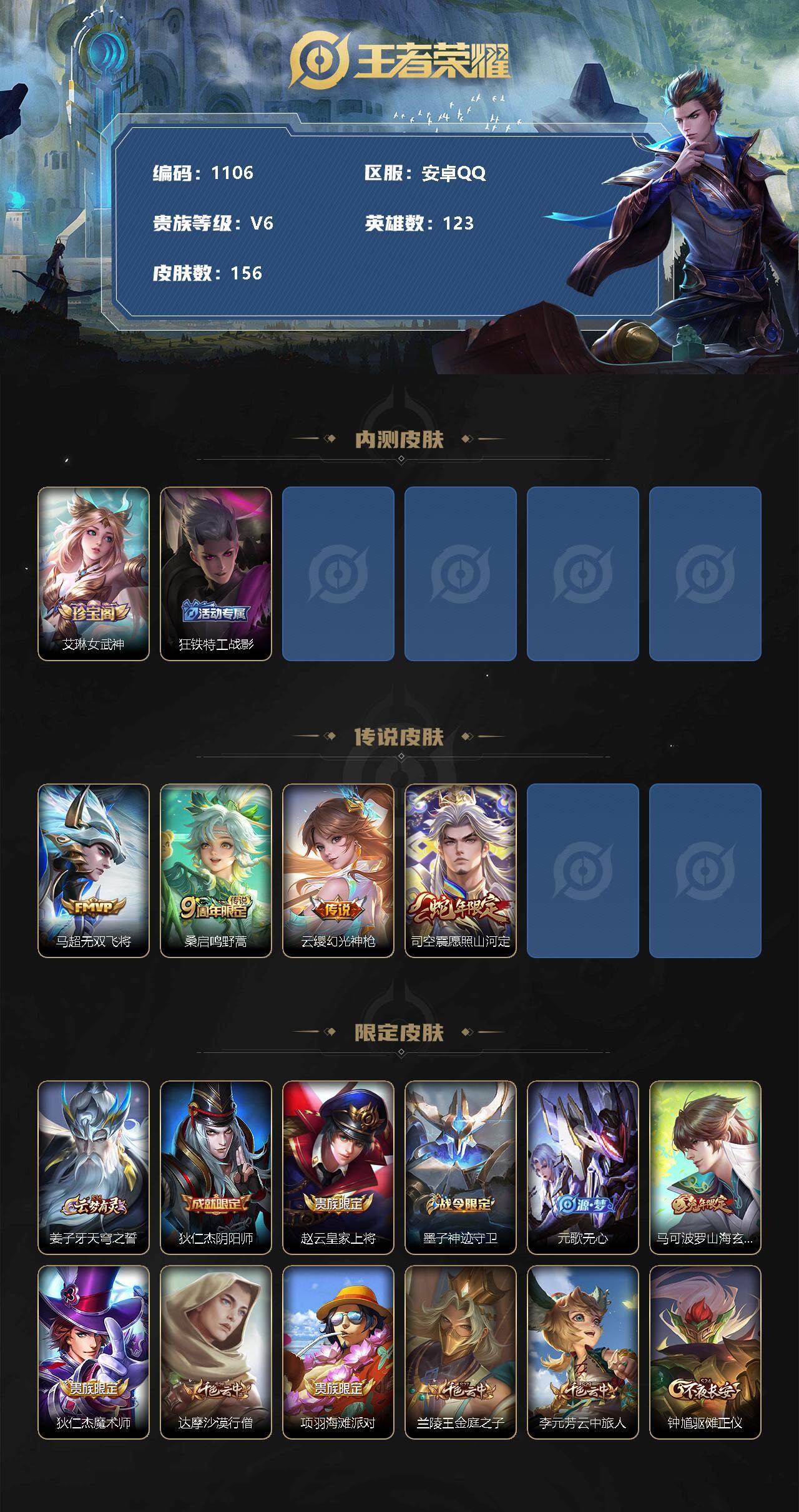 [11130523]【商品标题】:安卓Q-V6-最强王者段位-123英雄-156皮肤-0典藏-0珍品无双-0无双-0珍品传说-4传说-37史诗
