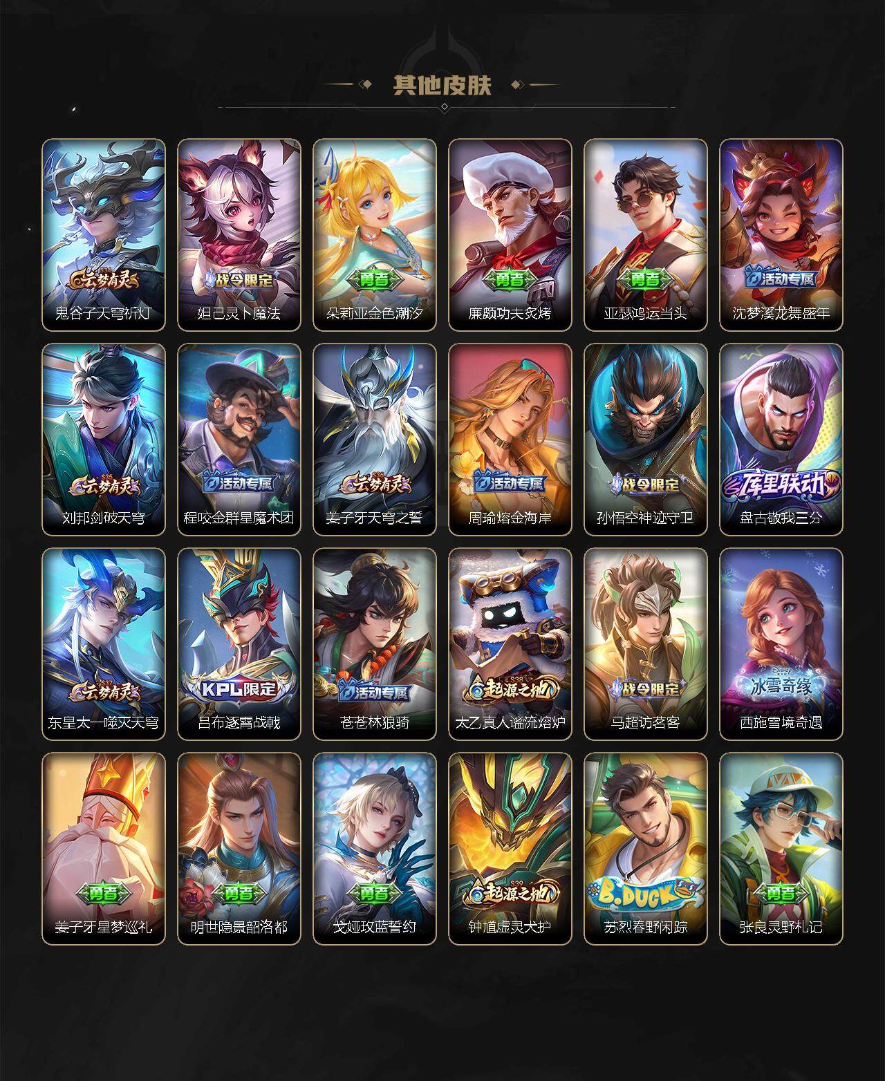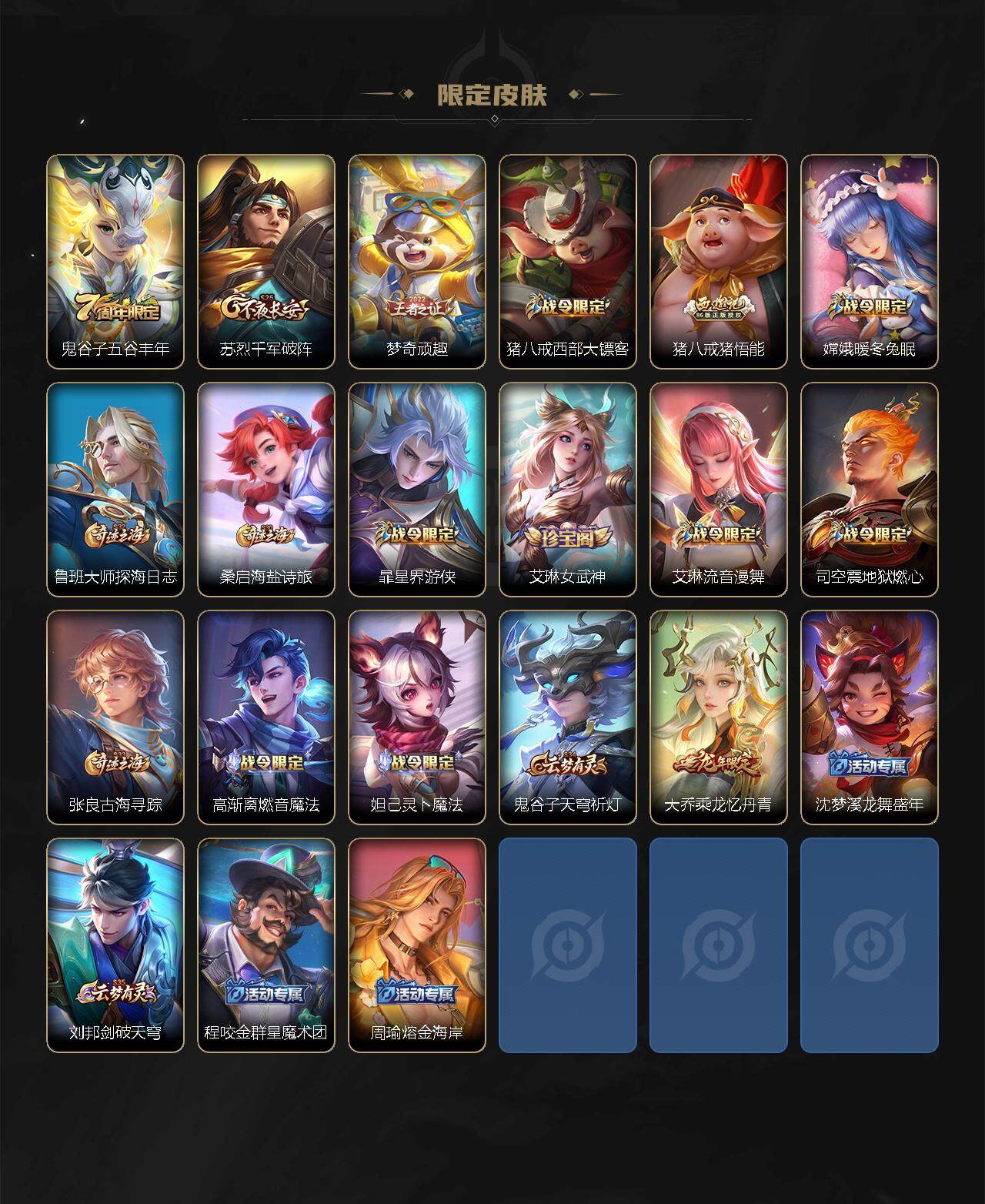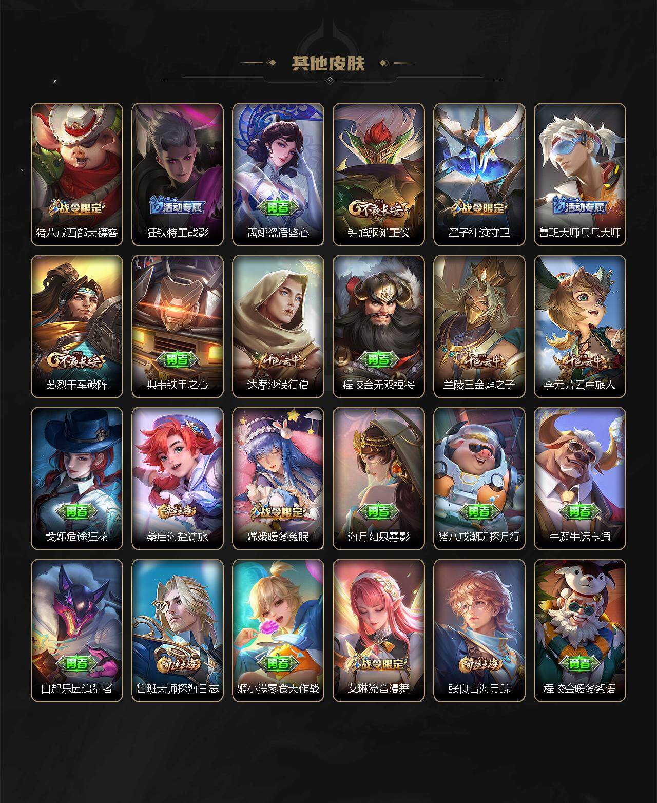 【限定皮肤】:姜子牙天穹之誓,狄仁杰阴阳师,赵云皇家上将,墨子神迹守卫,元歌无心,马可波罗山海玄木吟,狄仁杰魔术师,达摩沙漠行僧,项羽海滩派对,兰陵王金庭之子,李元芳云中旅人,钟馗驱傩正仪,鬼谷子五谷丰年,苏烈千军破阵,梦奇顽趣,猪八戒西部大镖客,猪八戒猪悟能,嫦娥暖冬兔眠,鲁班大师探海日志,桑启海盐诗旅,暃星界游侠,艾琳女武神,艾琳流音漫舞,司空震地狱燃心,张良古海寻踪,高渐离燃音魔法,妲己灵卜魔法,鬼谷子天穹祈灯,大乔乘龙忆丹青,沈梦溪龙舞盛年,刘邦剑破天穹,程咬金群星魔术团,周瑜熔金海岸