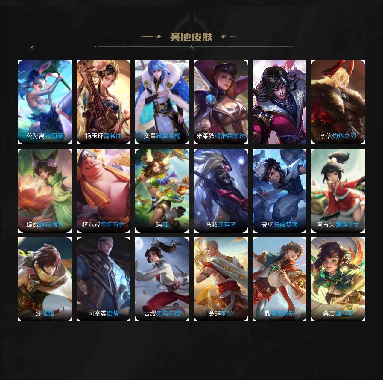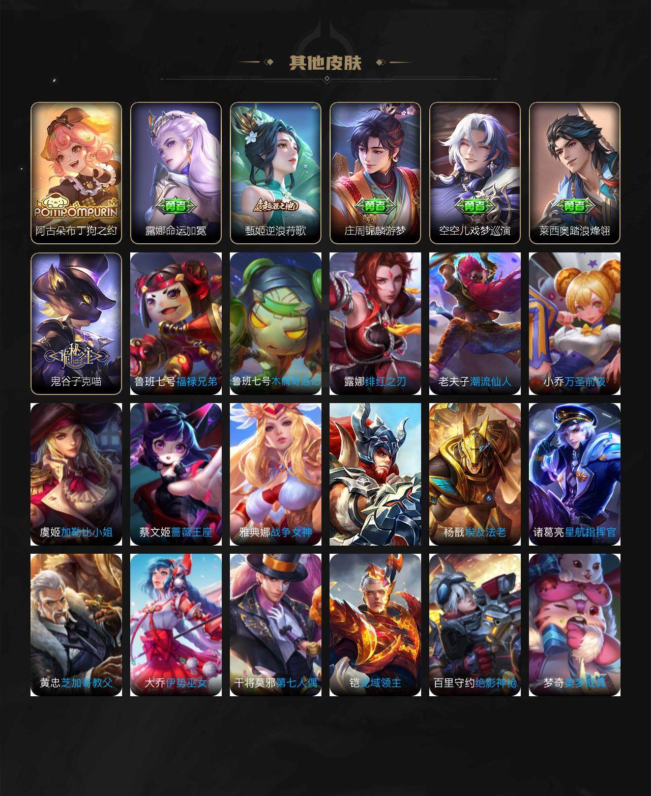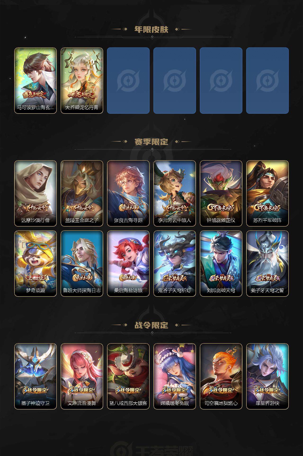 【限定皮肤】:姜子牙天穹之誓,狄仁杰阴阳师,赵云皇家上将,墨子神迹守卫,元歌无心,马可波罗山海玄木吟,狄仁杰魔术师,达摩沙漠行僧,项羽海滩派对,兰陵王金庭之子,李元芳云中旅人,钟馗驱傩正仪,鬼谷子五谷丰年,苏烈千军破阵,梦奇顽趣,猪八戒西部大镖客,猪八戒猪悟能,嫦娥暖冬兔眠,鲁班大师探海日志,桑启海盐诗旅,暃星界游侠,艾琳女武神,艾琳流音漫舞,司空震地狱燃心,张良古海寻踪,高渐离燃音魔法,妲己灵卜魔法,鬼谷子天穹祈灯,大乔乘龙忆丹青,沈梦溪龙舞盛年,刘邦剑破天穹,程咬金群星魔术团,周瑜熔金海岸