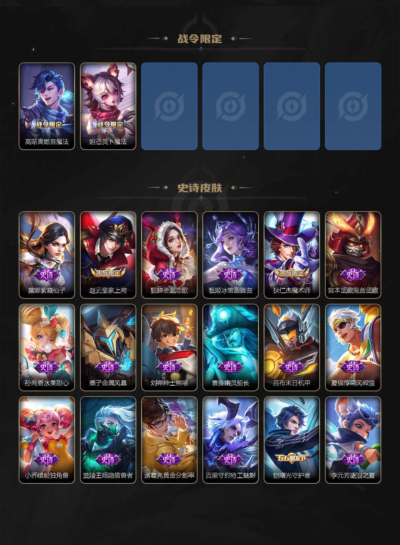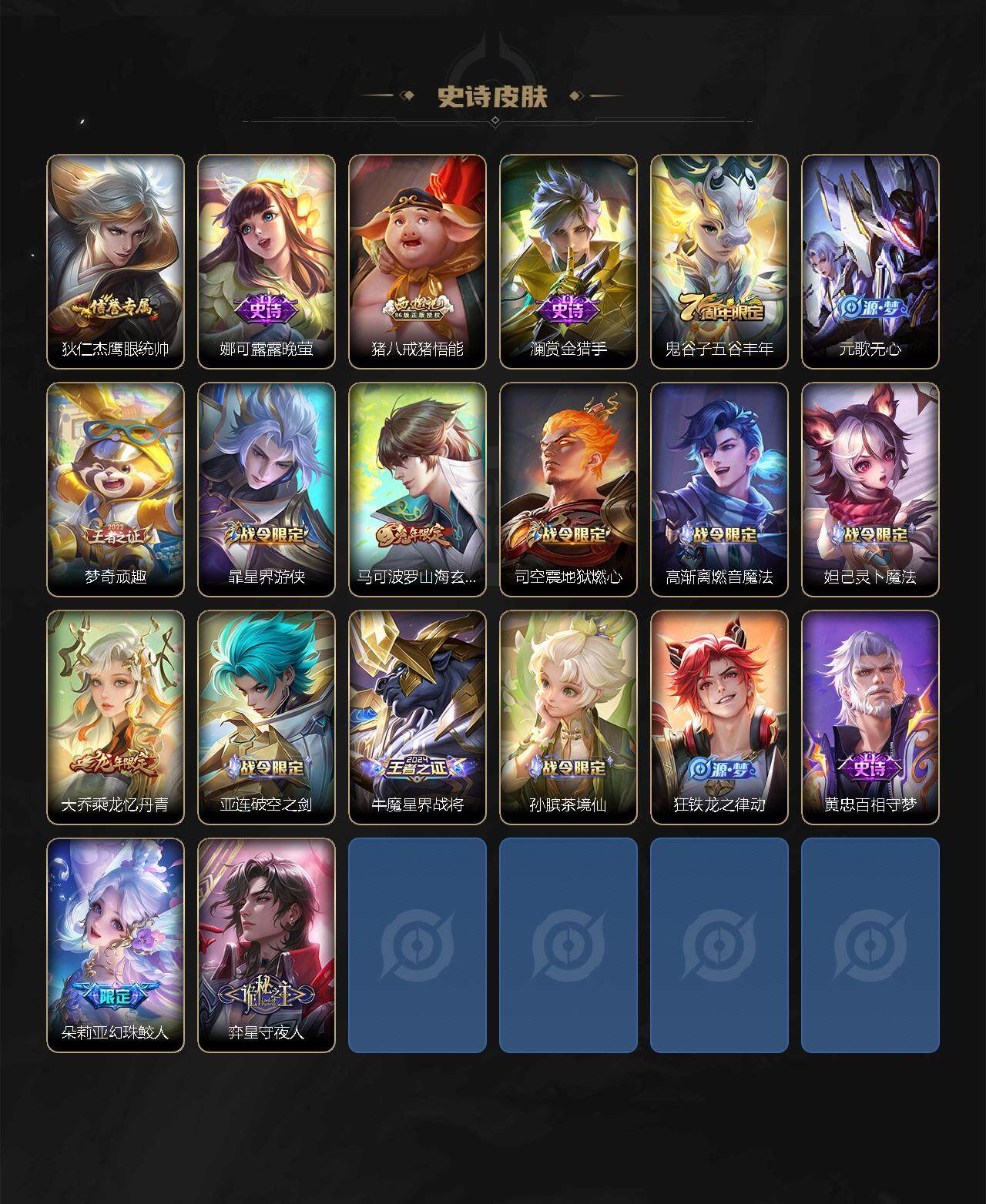 【史诗皮肤】:露娜紫霞仙子,赵云皇家上将,貂蝉圣诞恋歌,甄姬冰雪圆舞曲,狄仁杰魔术师,宫本武藏鬼剑武藏,孙尚香水果甜心,墨子金属风暴,刘禅绅士熊喵,曹操幽灵船长,吕布末日机甲,夏侯惇乘风破浪,小乔缤纷独角兽,兰陵王暗隐猎兽者,诸葛亮黄金分割率,百里守约特工魅影,铠曙光守护者,李元芳逐浪之夏,狄仁杰鹰眼统帅,娜可露露晚萤,猪八戒猪悟能,澜赏金猎手,鬼谷子五谷丰年,元歌无心,梦奇顽趣,暃星界游侠,马可波罗山海玄木吟,司空震地狱燃心,妲己灵卜魔法,高渐离燃音魔法,大乔乘龙忆丹青,亚连破空之剑,牛魔星界战将,孙膑茶境仙,狂铁龙之律动,黄忠百相守梦,朵莉亚幻珠鲛人,弈星守夜人