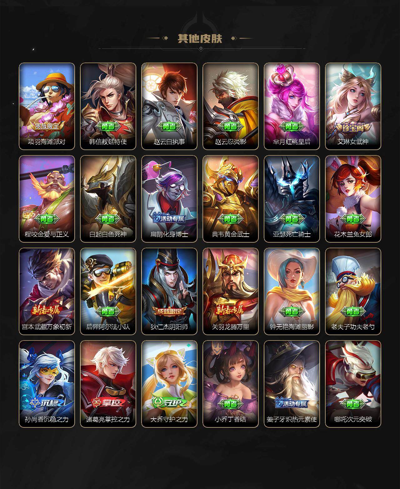 【其他皮肤】:项羽海滩派对,韩信教廷特使,赵云白执事,赵云忍炎影,芈月红桃皇后,艾琳女武神,程咬金爱与正义,白起白色死神,扁鹊化身博士,典韦黄金武士,亚瑟死亡骑士,花木兰兔女郎,宫本武藏万象初新,后羿阿尔法小队,狄仁杰阴阳师,关羽龙腾万里,钟无艳海滩丽影,老夫子功夫老勺,孙尚香沉稳之力,诸葛亮掌控之力,大乔守护之力