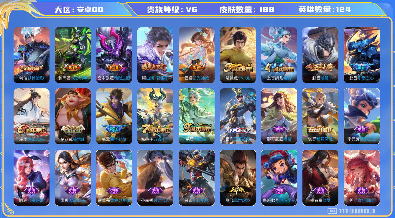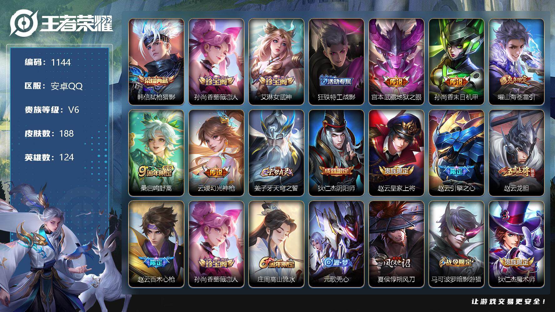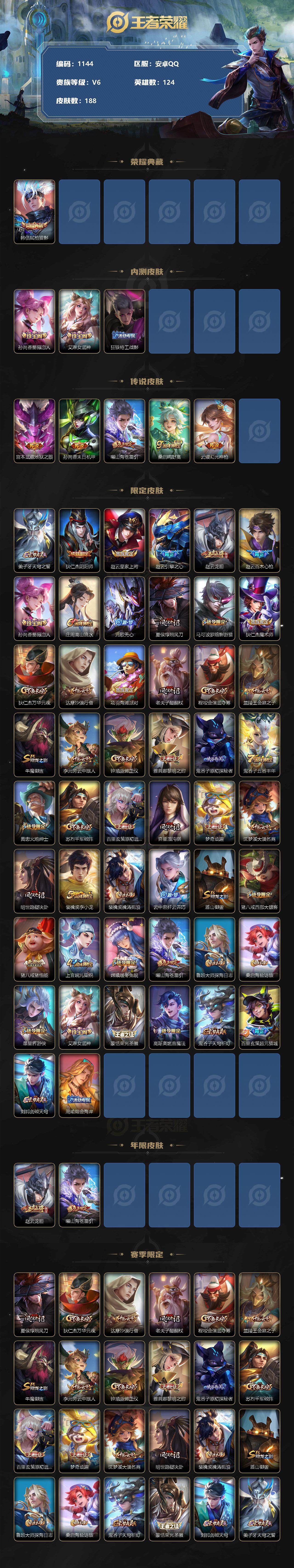 [11131803]【商品标题】:安卓Q-V4-永恒钻石I段位-124英雄-188皮肤-1典藏-0珍品无双-0无双-0珍品传说-5传说-61史诗