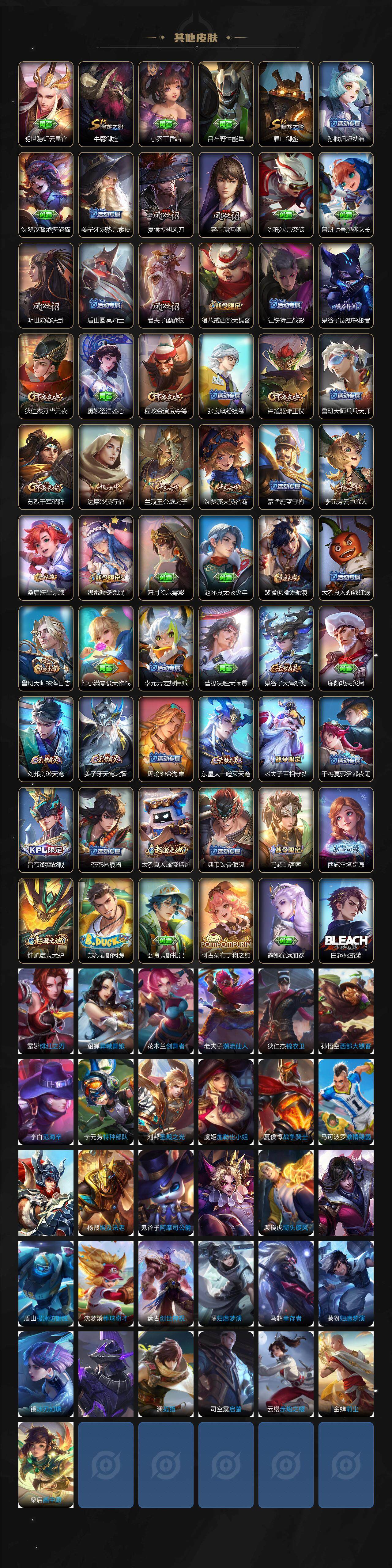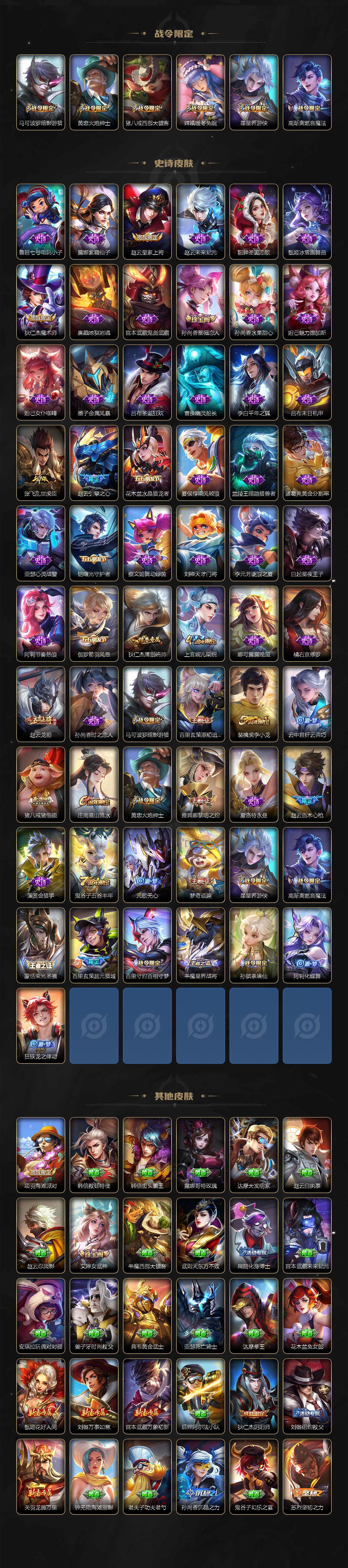 【限定皮肤】:姜子牙天穹之誓,狄仁杰阴阳师,赵云皇家上将,赵云引擎之心,赵云龙胆,赵云百木心枪,孙尚香蔷薇恋人,庄周高山流水,元歌无心,夏侯惇朔风刀,马可波罗暗影游猎,狄仁杰魔术师,狄仁杰万华元夜,达摩沙漠行僧,项羽海滩派对,老夫子醍醐杖,程咬金演武夺筹,兰陵王金庭之子,牛魔御旌,李元芳云中旅人,钟馗驱傩正仪,雅典娜黎明之约,鬼谷子原初探秘者,鬼谷子五谷丰年,黄忠火炮绅士,苏烈千军破阵,百里玄策原初追逐者,弈星混沌棋,梦奇顽趣,沈梦溪大漠名商,明世隐疑决卦,裴擒虎李小龙,裴擒虎擒涛扼浪,云中君纤云弄巧,盾山御銮,猪八戒西部大镖客,猪八戒猪悟能,上官婉儿梁祝,嫦娥暖冬兔眠,曜山海苍雷引,鲁班大师探海日志,桑启海盐诗旅,暃星界游侠,艾琳女武神,蒙恬荣光圣徽,高渐离燃音魔法,鬼谷子天穹祈灯,百里玄策超元猎域,刘邦剑破天穹,周瑜熔金海岸