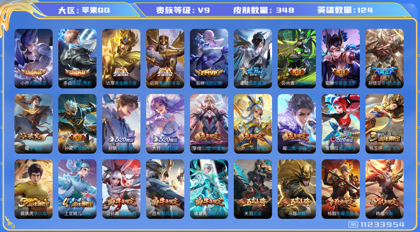 [11233954]【商品标题】:苹果Q-V9-永恒钻石V段位-124英雄-348皮肤-2典藏-0珍品无双-0无双-0珍品传说-34传说-115史诗