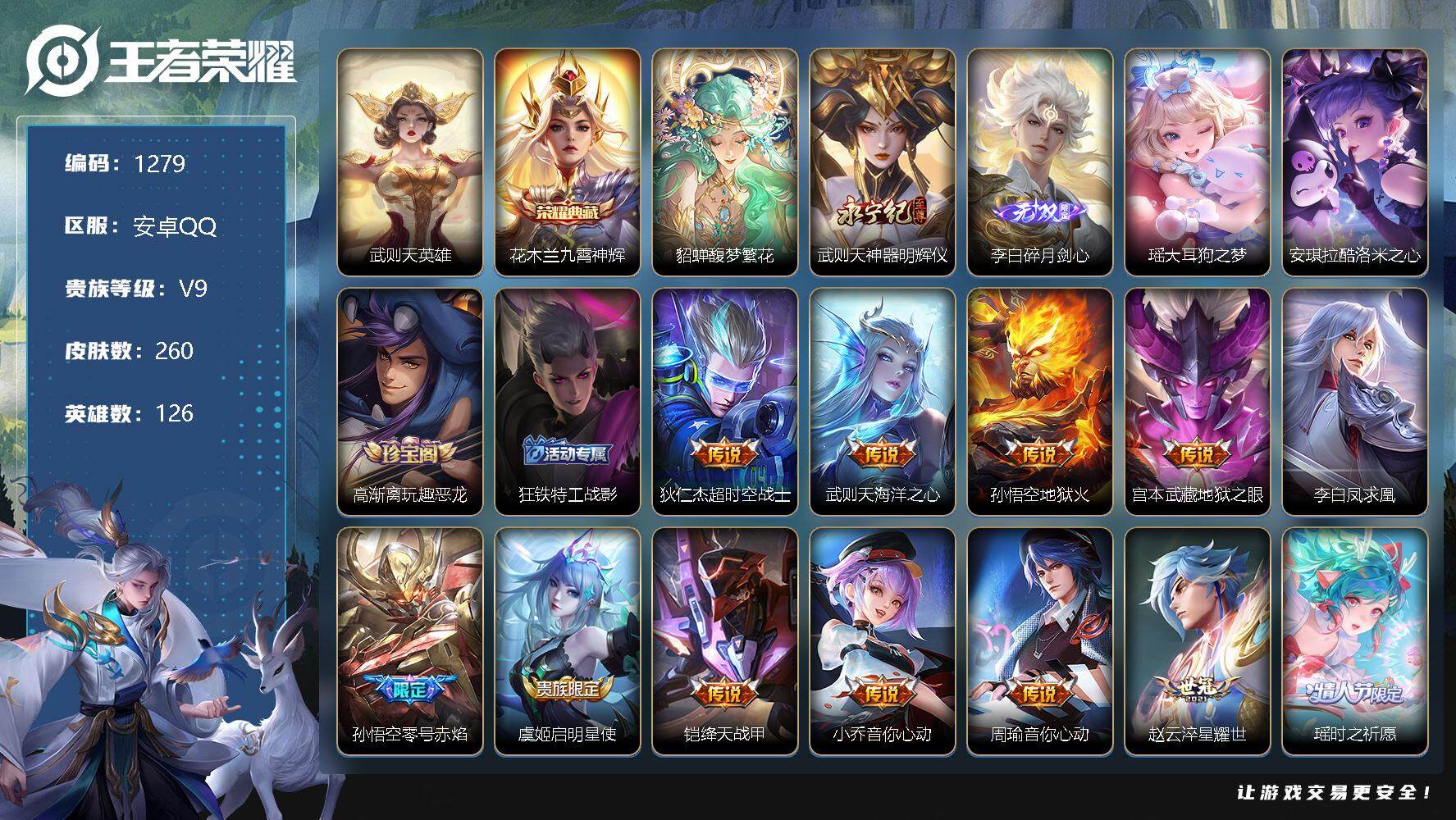 [11363554]【商品标题】:安卓Q-V9-最强王者段位-126英雄-260皮肤-1典藏-1珍品无双-2无双-2珍品传说-16传说-59史诗