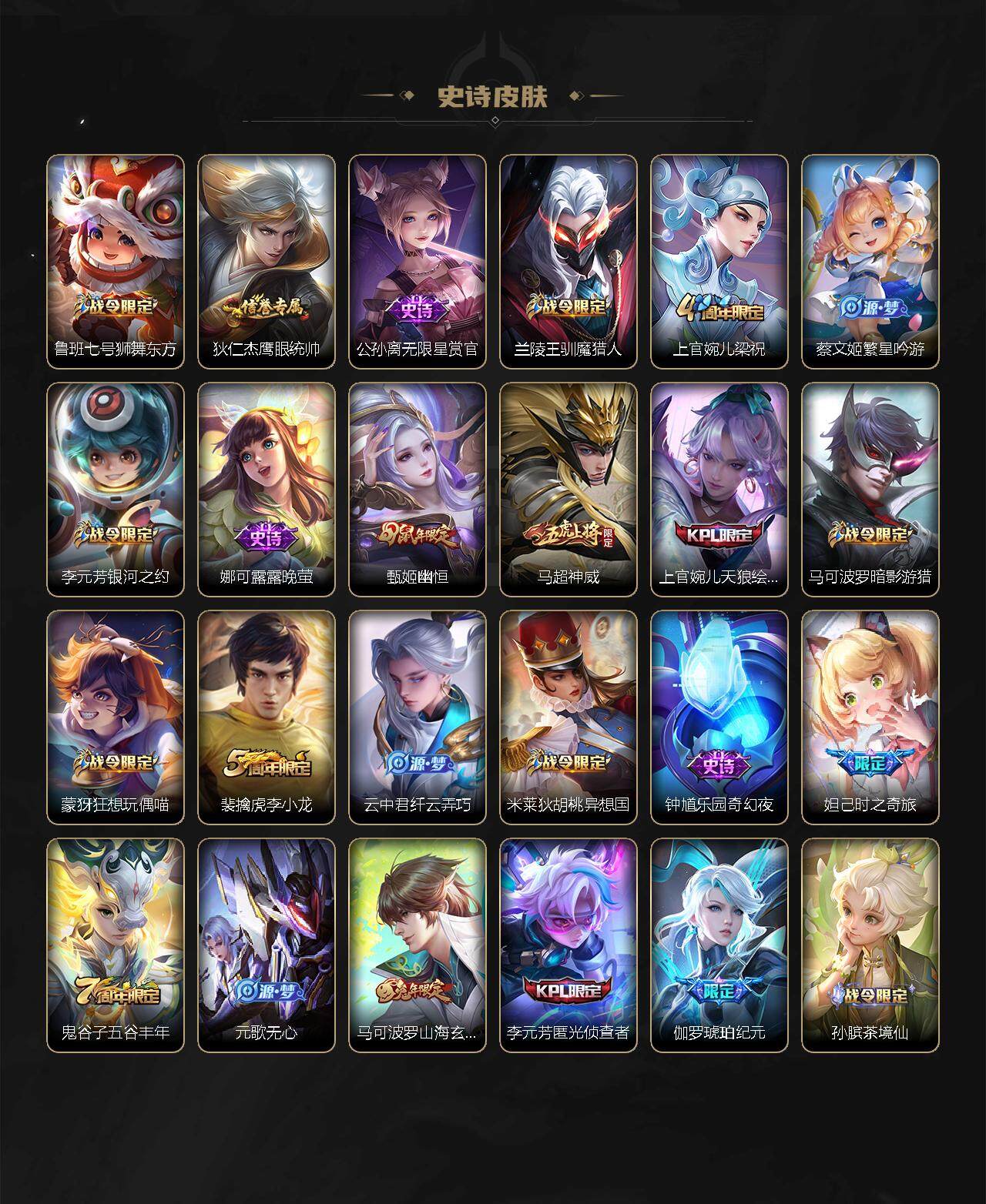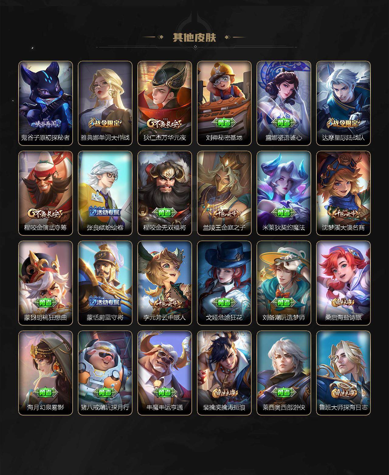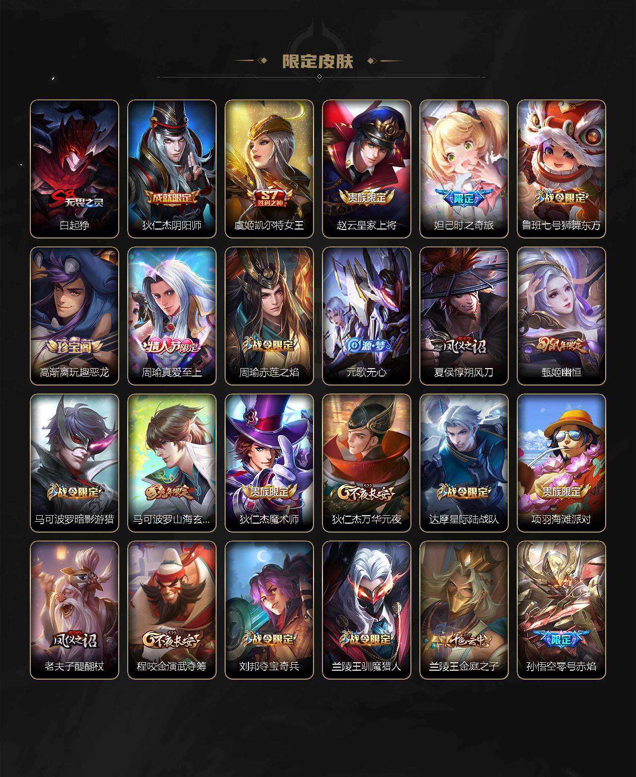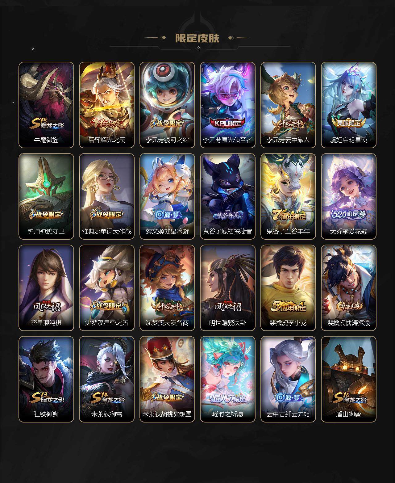 【限定皮肤】:白起狰,狄仁杰阴阳师,虞姬凯尔特女王,赵云皇家上将,妲己时之奇旅,鲁班七号狮舞东方,高渐离玩趣恶龙,周瑜真爱至上,周瑜赤莲之焰,元歌无心,夏侯惇朔风刀,甄姬幽恒,马可波罗暗影游猎,马可波罗山海玄木吟,狄仁杰魔术师,狄仁杰万华元夜,达摩星际陆战队,项羽海滩派对,老夫子醍醐杖,程咬金演武夺筹,刘邦夺宝奇兵,兰陵王驯魔猎人,兰陵王金庭之子,孙悟空零号赤焰,牛魔御旌,后羿辉光之辰,李元芳银河之约,李元芳匿光侦查者,李元芳云中旅人,虞姬启明星使,钟馗神迹守卫,雅典娜单词大作战,蔡文姬繁星吟游,鬼谷子原初探秘者,鬼谷子五谷丰年,大乔挚爱花嫁,弈星混沌棋,沈梦溪星空之诺,沈梦溪大漠名商,明世隐疑决卦,裴擒虎李小龙,裴擒虎擒涛扼浪,狂铁御狮,米莱狄御霄,米莱狄胡桃异想国,瑶时之祈愿,云中君纤云弄巧,盾山御銮,孙策挚爱之约,猪八戒西部大镖客,上官婉儿梁祝,上官婉儿天狼绘梦者,西施玲珑珍味,蒙犽狂想玩偶喵,鲁班大师探海日志,桑启海盐诗旅,夏洛特浮生妄,艾琳流音漫舞,张良古海寻踪,鬼谷子天穹祈灯,李白碎月剑心,伽罗琥珀纪元