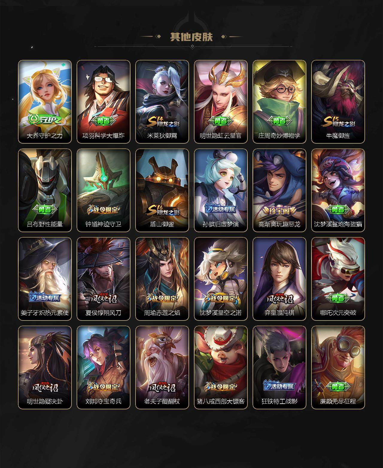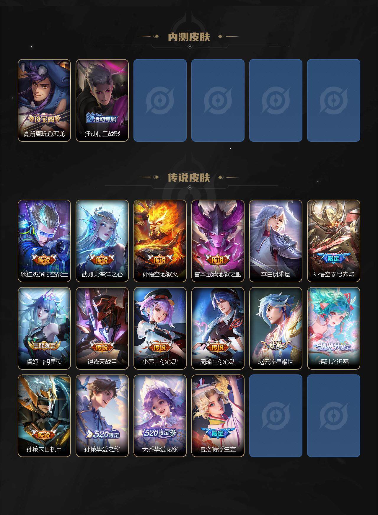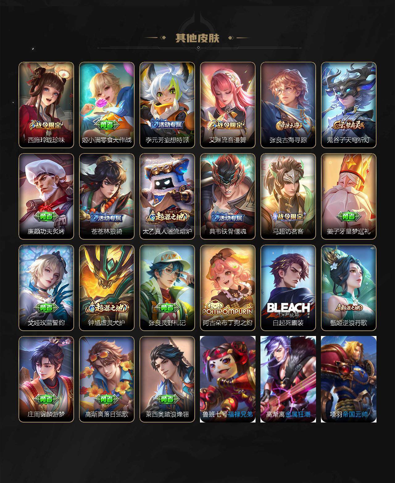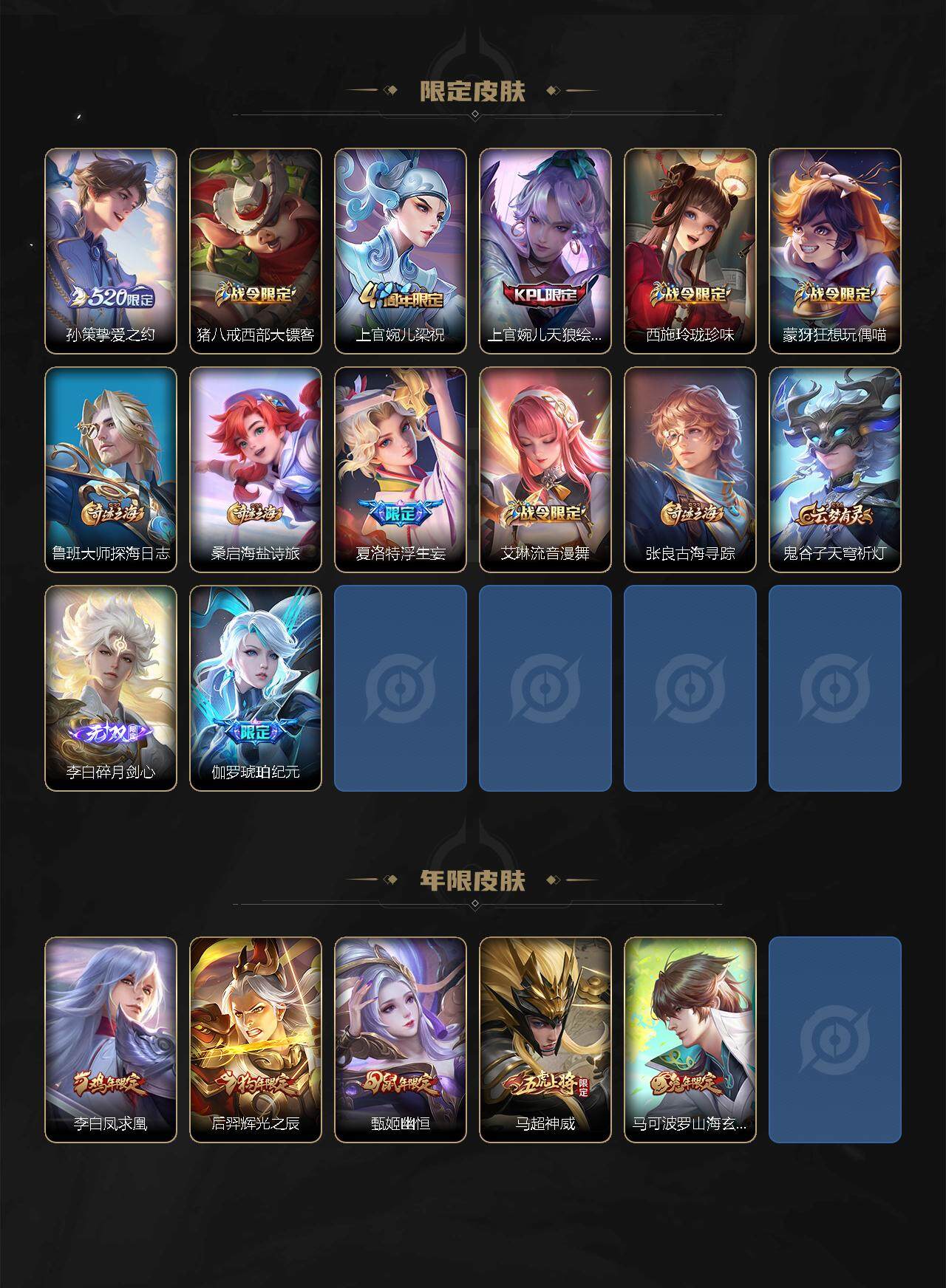 【限定皮肤】:白起狰,狄仁杰阴阳师,虞姬凯尔特女王,赵云皇家上将,妲己时之奇旅,鲁班七号狮舞东方,高渐离玩趣恶龙,周瑜真爱至上,周瑜赤莲之焰,元歌无心,夏侯惇朔风刀,甄姬幽恒,马可波罗暗影游猎,马可波罗山海玄木吟,狄仁杰魔术师,狄仁杰万华元夜,达摩星际陆战队,项羽海滩派对,老夫子醍醐杖,程咬金演武夺筹,刘邦夺宝奇兵,兰陵王驯魔猎人,兰陵王金庭之子,孙悟空零号赤焰,牛魔御旌,后羿辉光之辰,李元芳银河之约,李元芳匿光侦查者,李元芳云中旅人,虞姬启明星使,钟馗神迹守卫,雅典娜单词大作战,蔡文姬繁星吟游,鬼谷子原初探秘者,鬼谷子五谷丰年,大乔挚爱花嫁,弈星混沌棋,沈梦溪星空之诺,沈梦溪大漠名商,明世隐疑决卦,裴擒虎李小龙,裴擒虎擒涛扼浪,狂铁御狮,米莱狄御霄,米莱狄胡桃异想国,瑶时之祈愿,云中君纤云弄巧,盾山御銮,孙策挚爱之约,猪八戒西部大镖客,上官婉儿梁祝,上官婉儿天狼绘梦者,西施玲珑珍味,蒙犽狂想玩偶喵,鲁班大师探海日志,桑启海盐诗旅,夏洛特浮生妄,艾琳流音漫舞,张良古海寻踪,鬼谷子天穹祈灯,李白碎月剑心,伽罗琥珀纪元