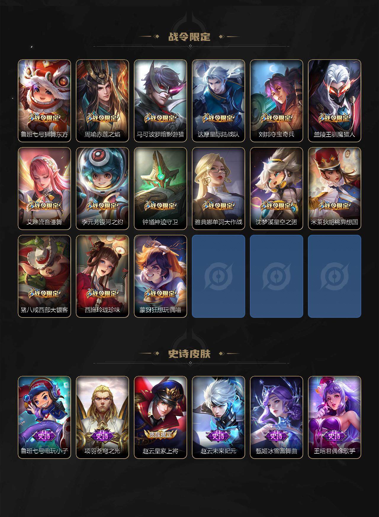【战令限定】:鲁班七号狮舞东方,周瑜赤莲之焰,马可波罗暗影游猎,达摩星际陆战队,刘邦夺宝奇兵,兰陵王驯魔猎人,艾琳流音漫舞,李元芳银河之约,钟馗神