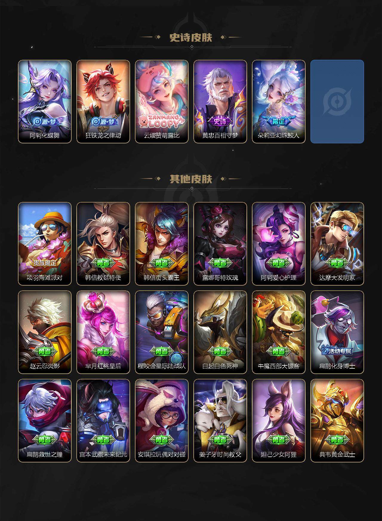 裴擒虎李小龙,上官婉儿梁祝,马超神威,后羿辉光之辰,甄姬幽恒,上官婉儿天狼绘梦者,周瑜真爱至上,瑶时之祈愿,妲己时之奇旅,马可波罗山海·玄木吟
