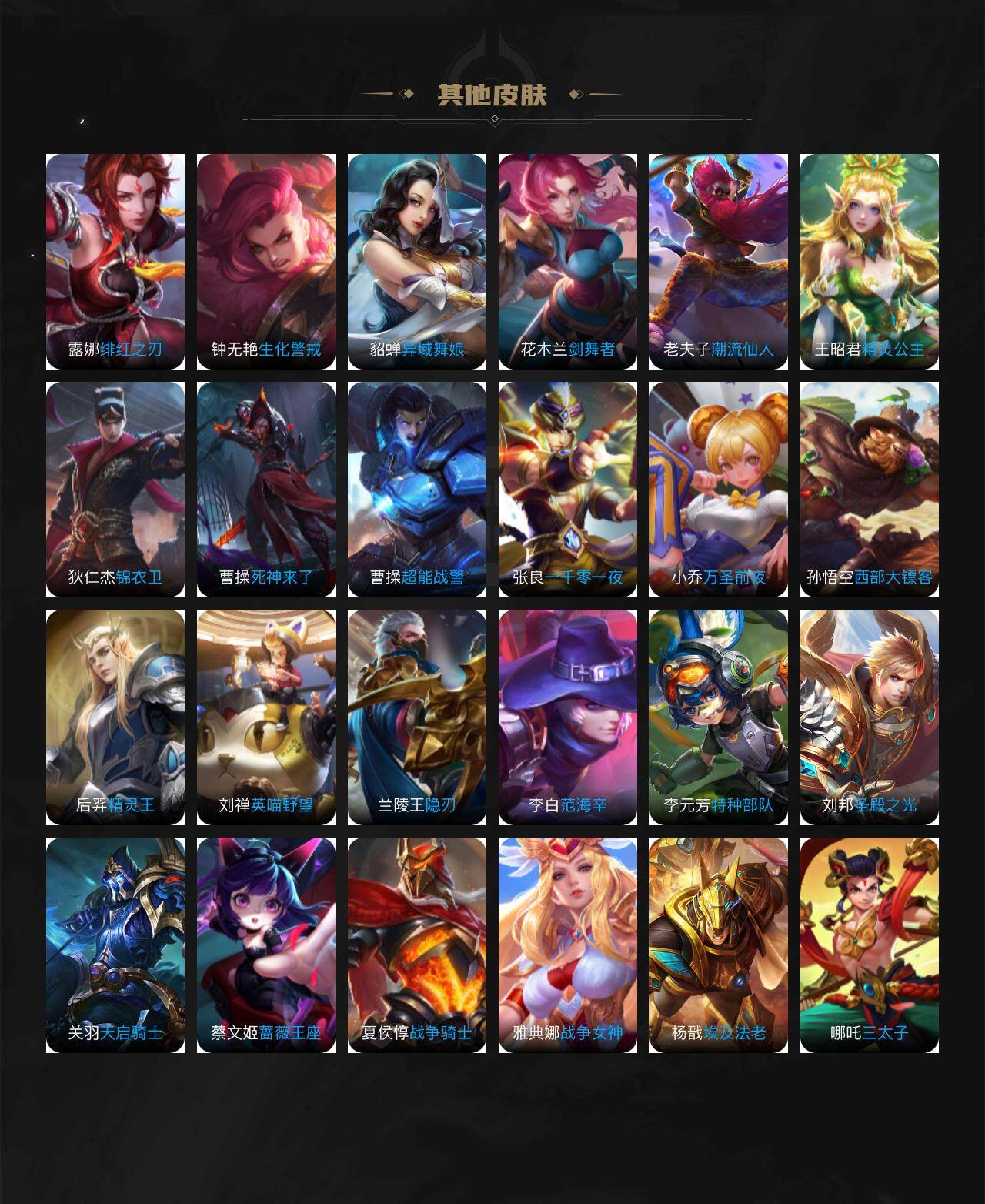 娜可露露晚萤,李元芳逐浪之夏,公孙离无限星赏官,孙策猫狗日记,阿轲节奏热浪,诸葛亮黄金分割率,王昭君偶像歌手,项羽苍穹之光,吕布末日机甲,鲁班七号电玩小子,嬴政摇滚巨星,白起星夜王子,程咬金功夫厨神,刘邦德古拉伯爵,曹操幽灵船长,宫本武藏鬼剑武藏,亚瑟心灵战警,钟馗乐园奇幻夜,廉颇地狱岩魂,小乔缤纷独角兽,夏侯惇乘风破浪,花木兰水晶猎龙者,墨子金属风暴,吕布圣诞狂欢,李白千年之狐,李元芳匿光侦查者,伽罗琥珀纪元