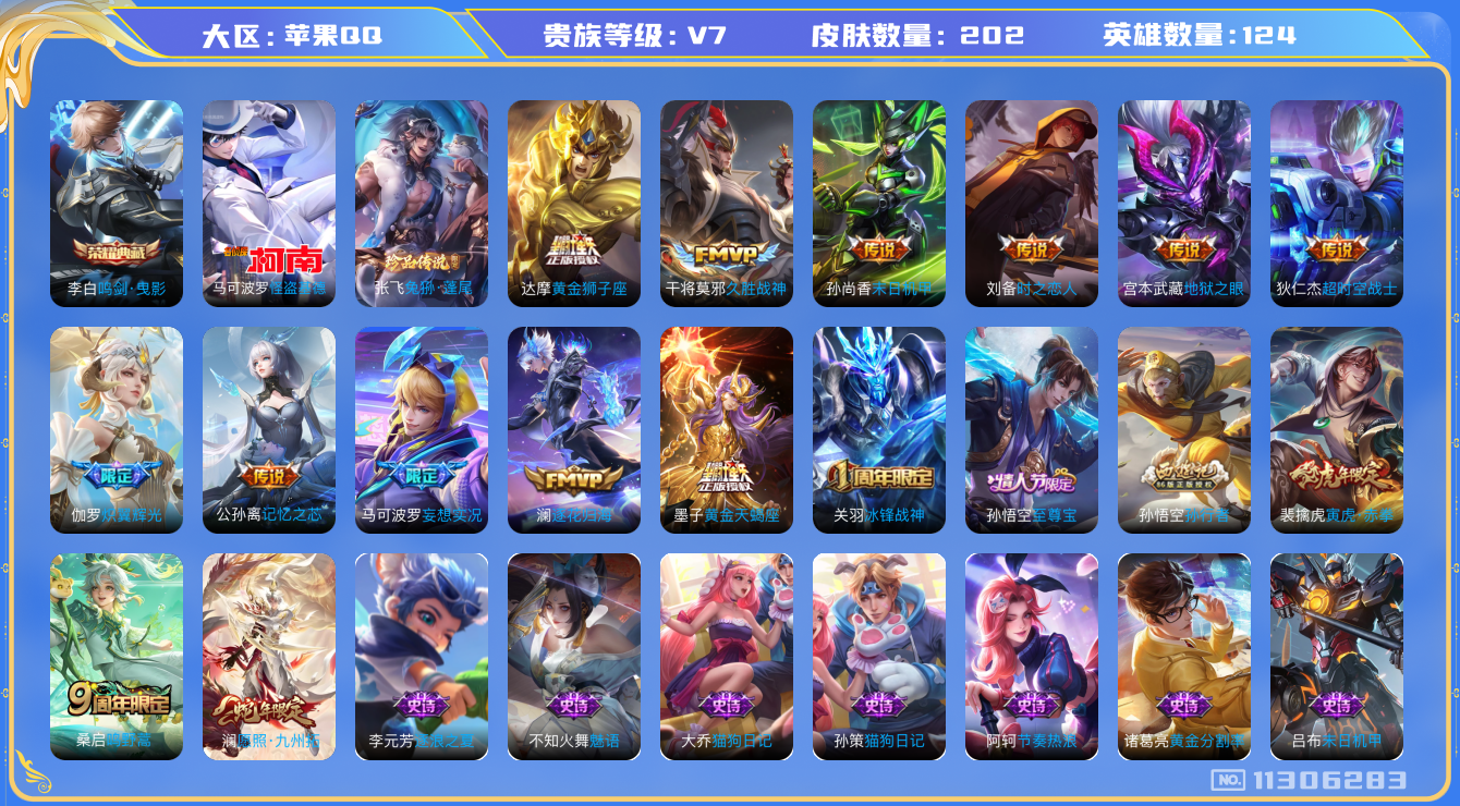 [11306283]【商品标题】:苹果Q-V7-最强王者段位-124英雄-202皮肤-1典藏-0珍品无双-0无双-2珍品传说-14传说-54史诗