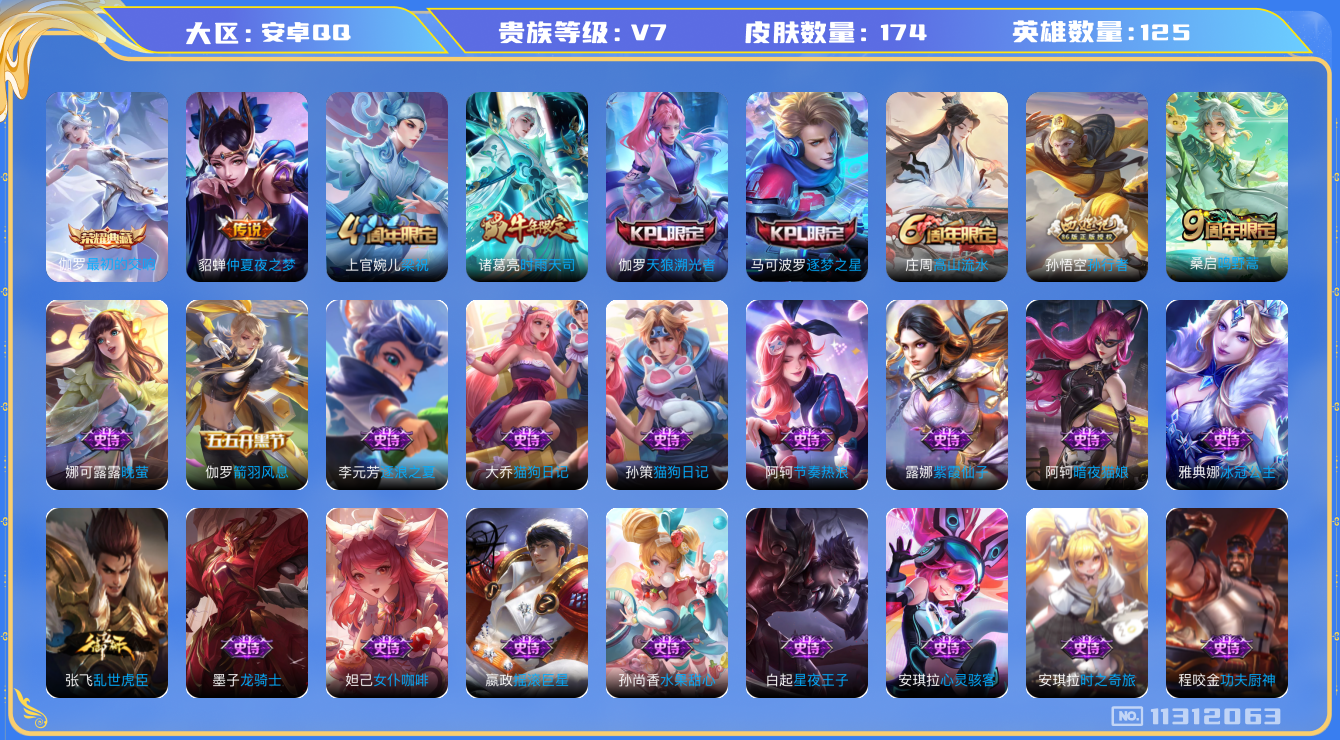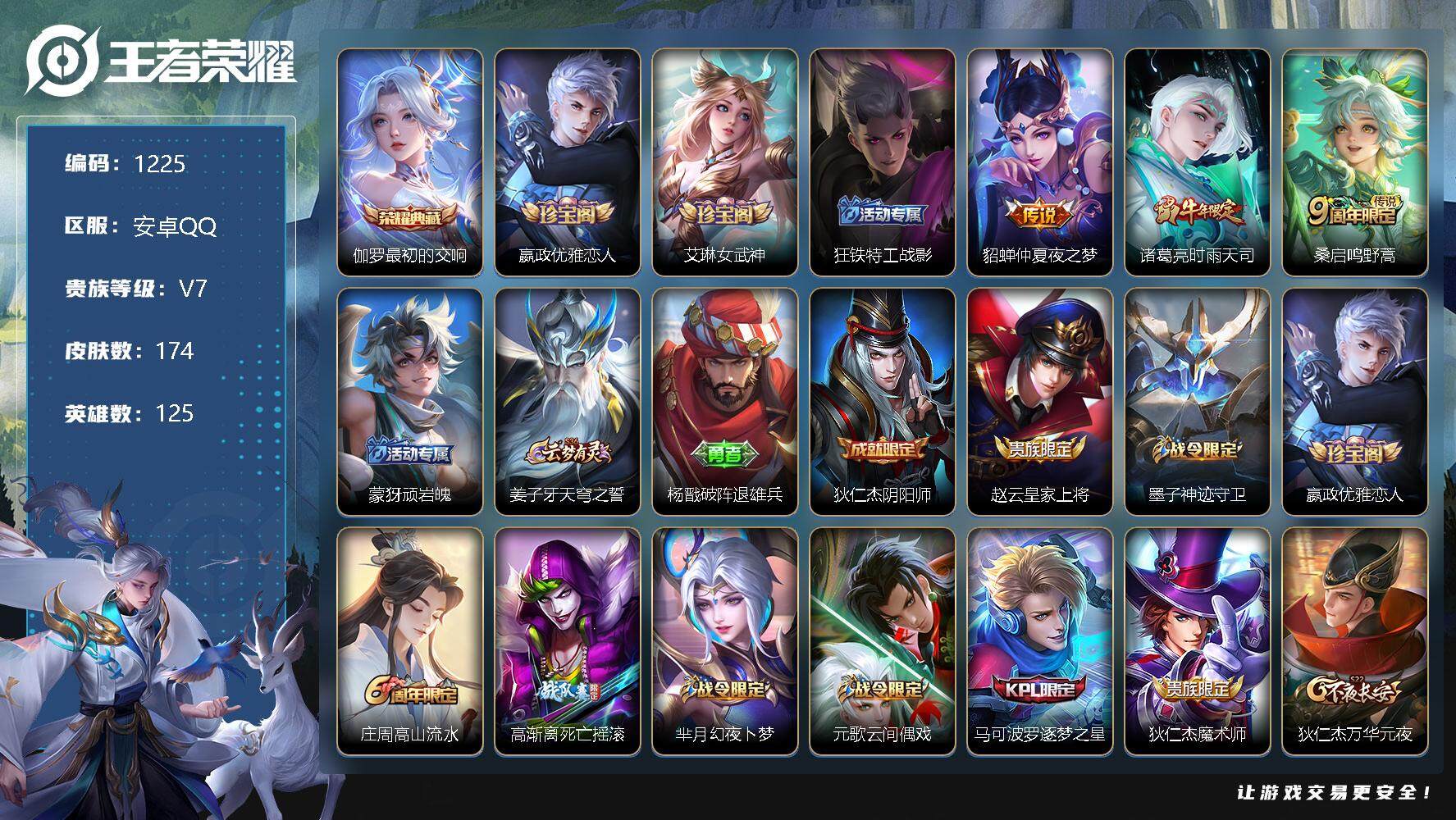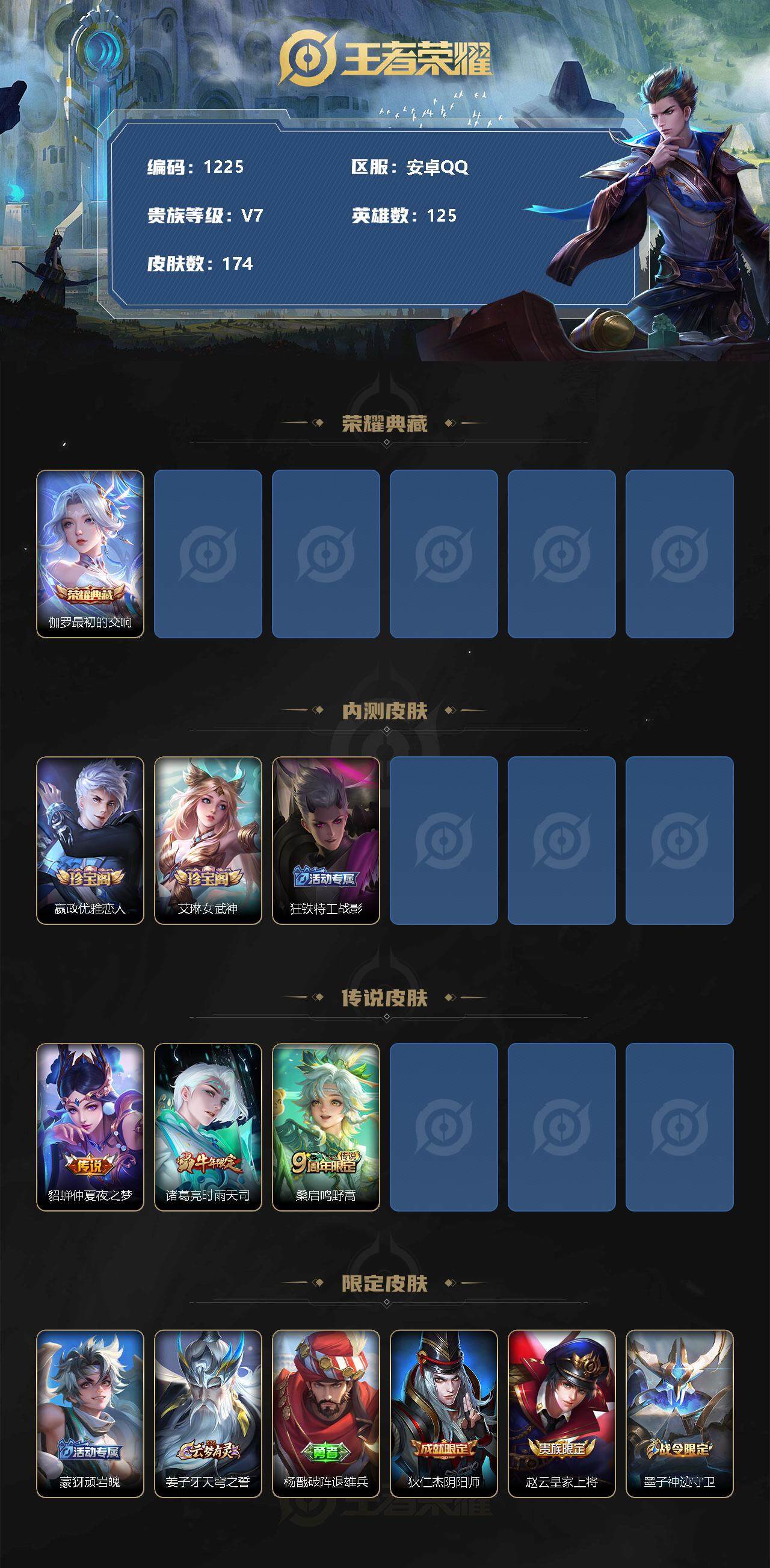 [11312063]【商品标题】:安卓Q-V3-至尊星耀II段位-125英雄-174皮肤-1典藏-0珍品无双-0无双-0珍品传说-3传说-57史诗