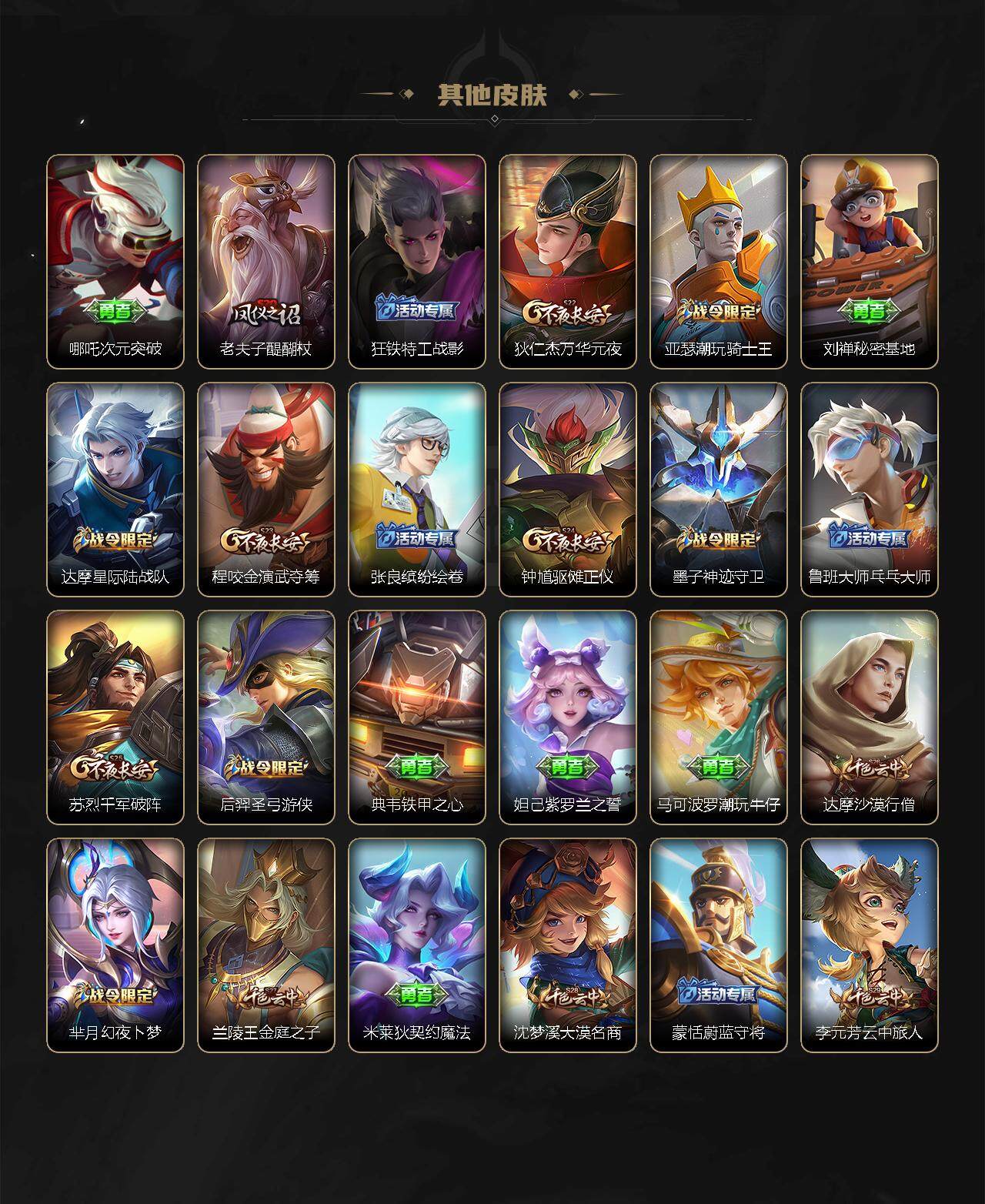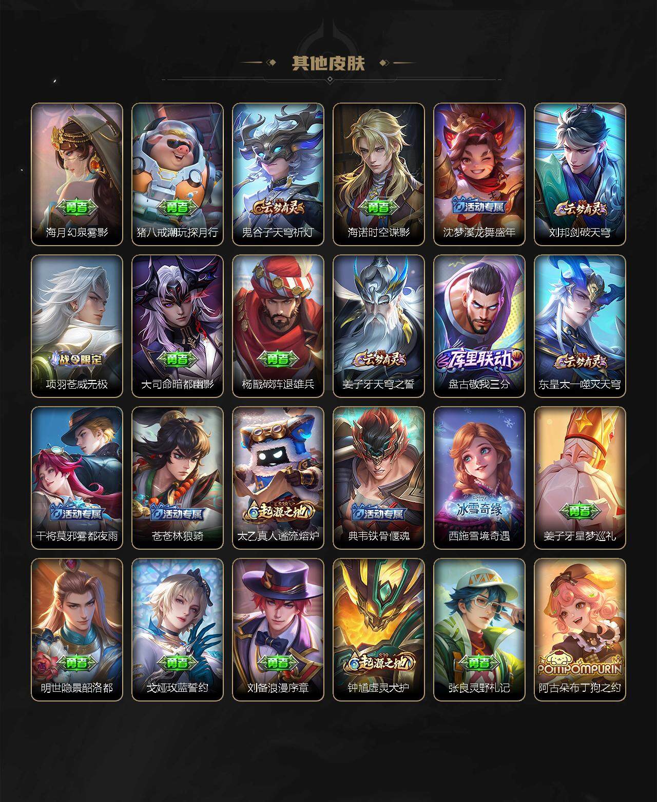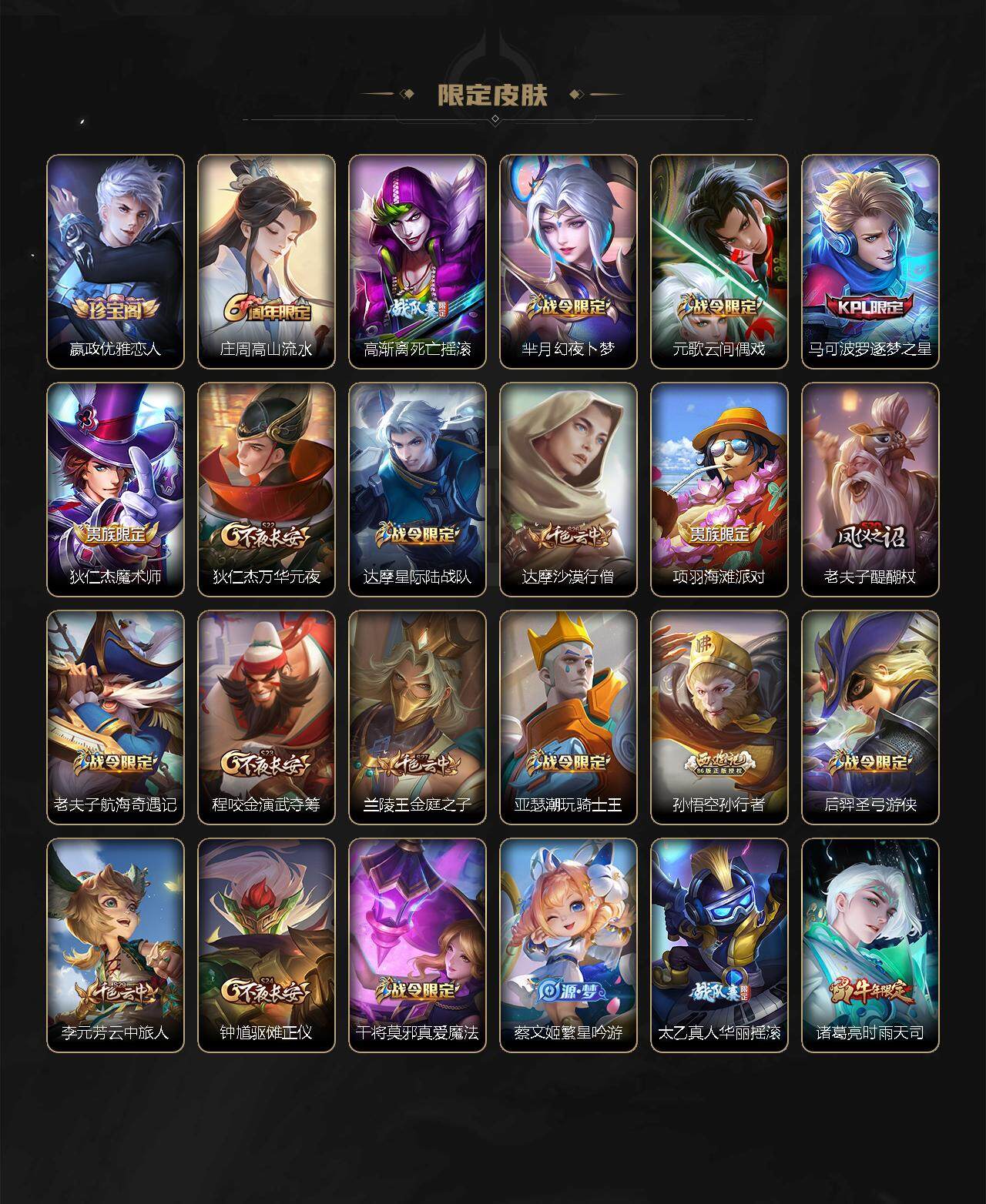【限定皮肤】:蒙犽顽岩魄,姜子牙天穹之誓,杨戬破阵退雄兵,狄仁杰阴阳师,赵云皇家上将,墨子神迹守卫,嬴政优雅恋人,庄周高山流水,高渐离死亡摇滚,芈月幻夜卜梦,元歌云间偶戏,马可波罗逐梦之星,狄仁杰魔术师,狄仁杰万华元夜,达摩星际陆战队,达摩沙漠行僧,项羽海滩派对,老夫子醍醐杖,老夫子航海奇遇记,程咬金演武夺筹,兰陵王金庭之子,亚瑟潮玩骑士王,孙悟空孙行者,后羿圣弓游侠,李元芳云中旅人,钟馗驱傩正仪,干将莫邪真爱魔法,蔡文姬繁星吟游,太乙真人华丽摇滚,诸葛亮时雨天司,黄忠火炮绅士,苏烈千军破阵,梦奇顽趣,沈梦溪大漠名商,米莱狄胡桃异想国,伽罗天狼溯光者,上官婉儿梁祝,艾琳女武神,鬼谷子天穹祈灯,沈梦溪龙舞盛年,刘邦剑破天穹,镜青焰无极,项羽苍威无极