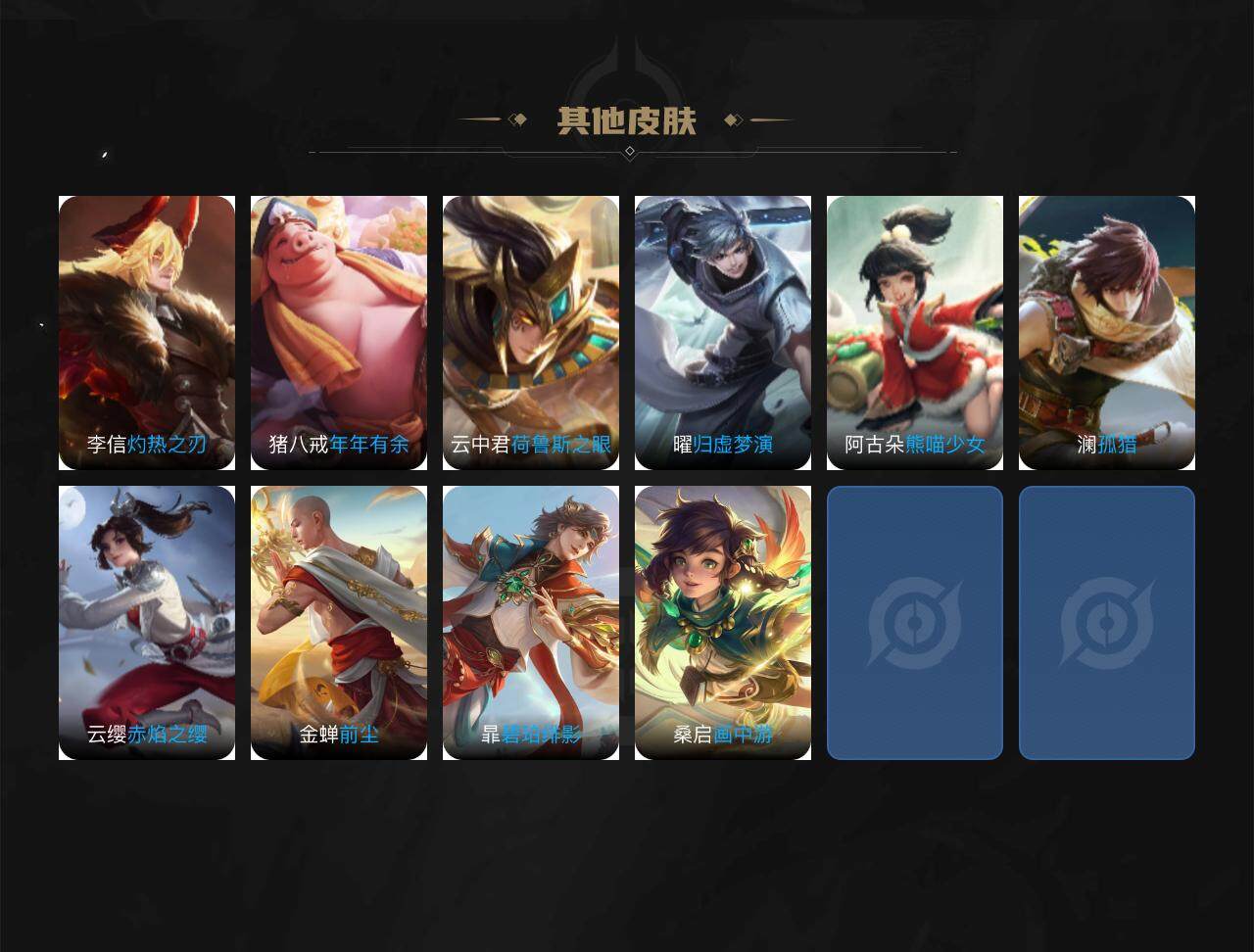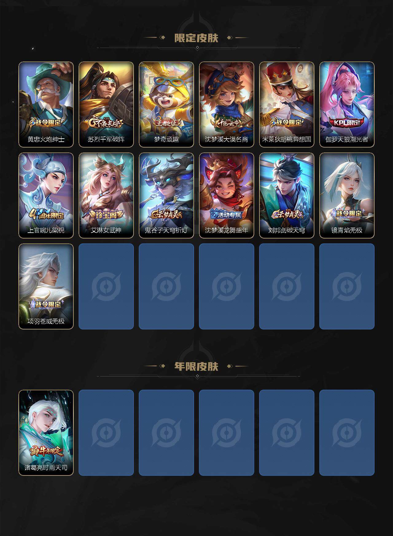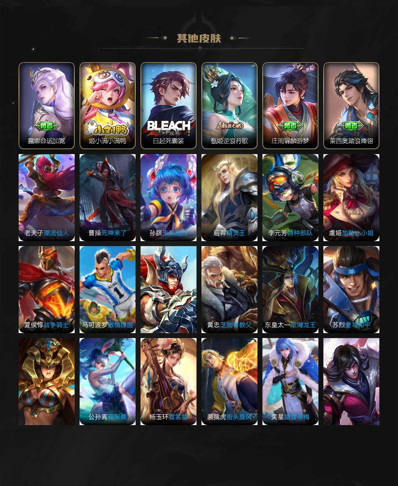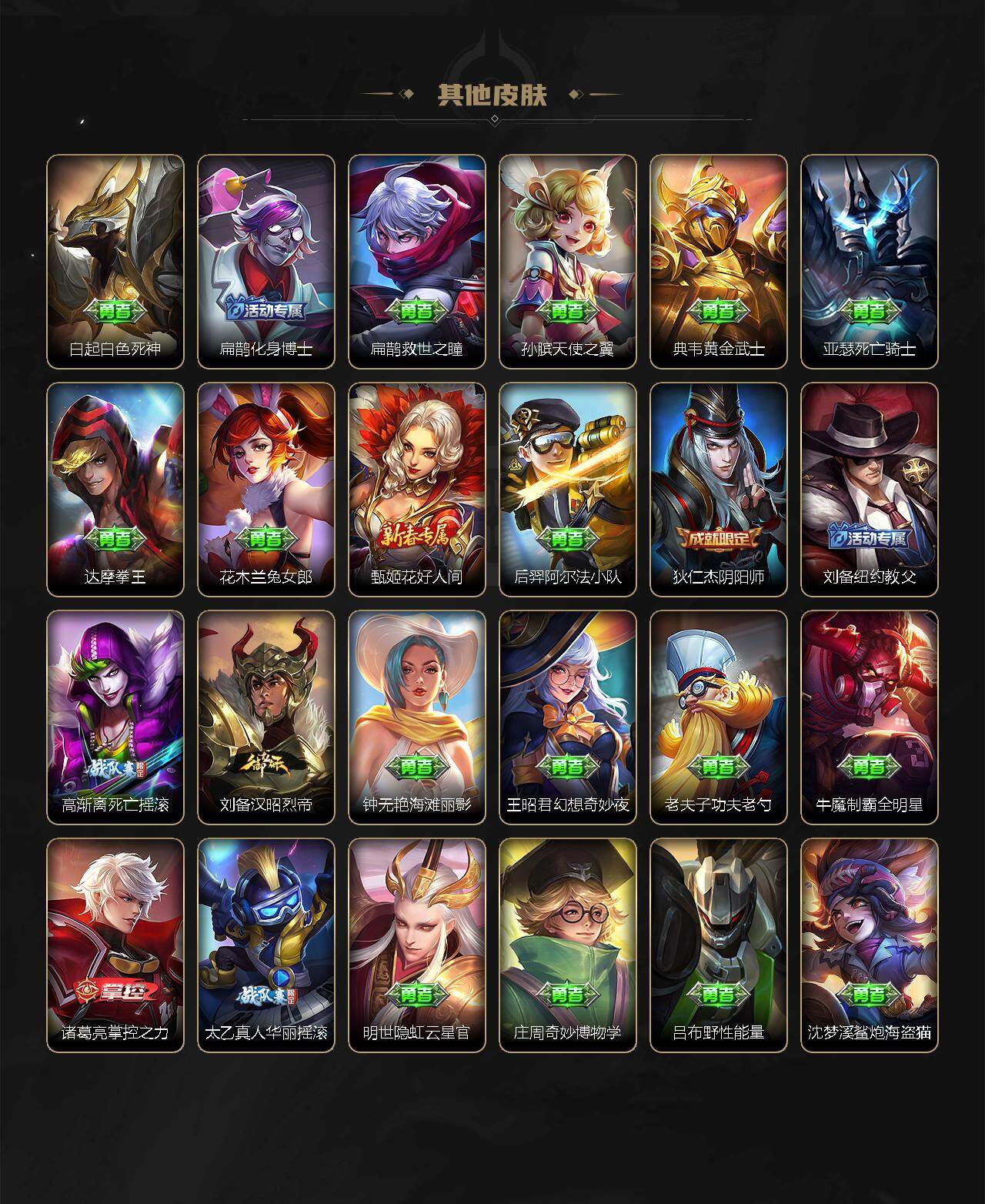 【限定皮肤】:蒙犽顽岩魄,姜子牙天穹之誓,杨戬破阵退雄兵,狄仁杰阴阳师,赵云皇家上将,墨子神迹守卫,嬴政优雅恋人,庄周高山流水,高渐离死亡摇滚,芈月幻夜卜梦,元歌云间偶戏,马可波罗逐梦之星,狄仁杰魔术师,狄仁杰万华元夜,达摩星际陆战队,达摩沙漠行僧,项羽海滩派对,老夫子醍醐杖,老夫子航海奇遇记,程咬金演武夺筹,兰陵王金庭之子,亚瑟潮玩骑士王,孙悟空孙行者,后羿圣弓游侠,李元芳云中旅人,钟馗驱傩正仪,干将莫邪真爱魔法,蔡文姬繁星吟游,太乙真人华丽摇滚,诸葛亮时雨天司,黄忠火炮绅士,苏烈千军破阵,梦奇顽趣,沈梦溪大漠名商,米莱狄胡桃异想国,伽罗天狼溯光者,上官婉儿梁祝,艾琳女武神,鬼谷子天穹祈灯,沈梦溪龙舞盛年,刘邦剑破天穹,镜青焰无极,项羽苍威无极