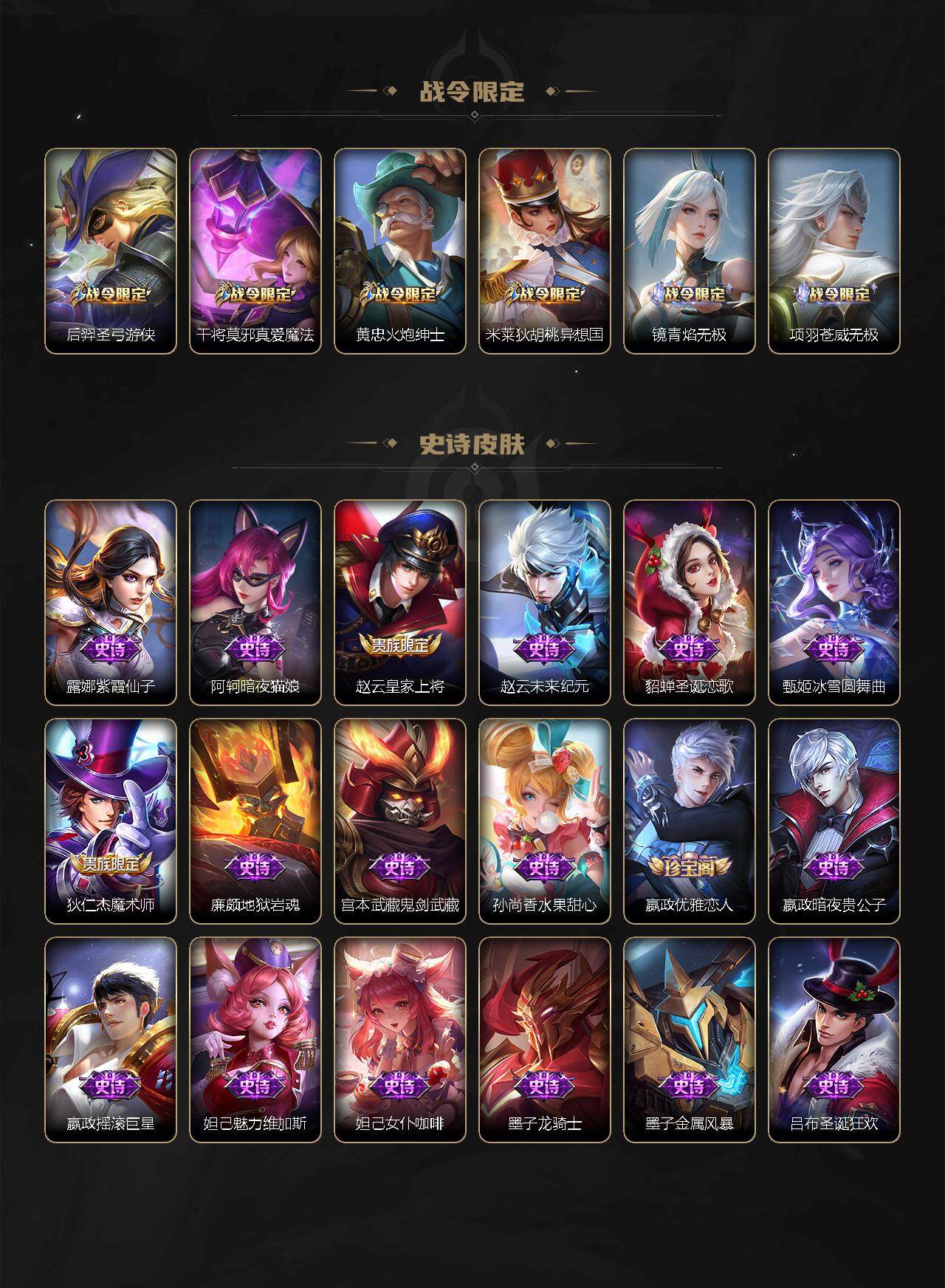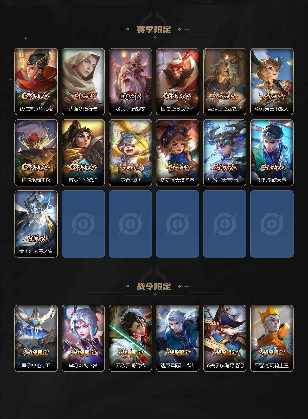 【战令限定】:墨子神迹守卫,芈月幻夜卜梦,元歌云间偶戏,达摩星际陆战队,老夫子航海奇遇记,亚瑟潮玩骑士王,后羿圣弓游侠,干将莫邪真爱魔法,黄忠火炮绅士,米莱狄胡桃异想国,镜青焰无极,项羽苍威无极