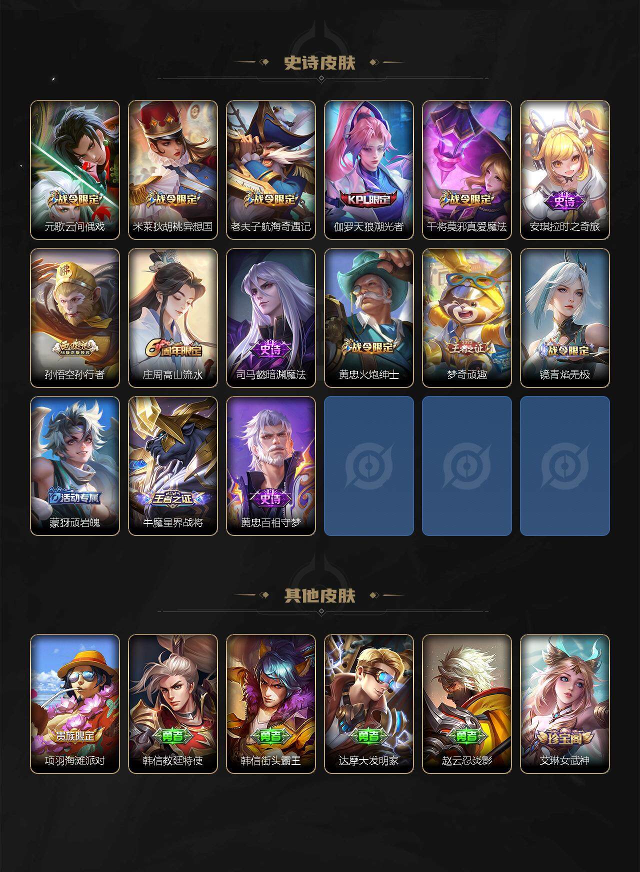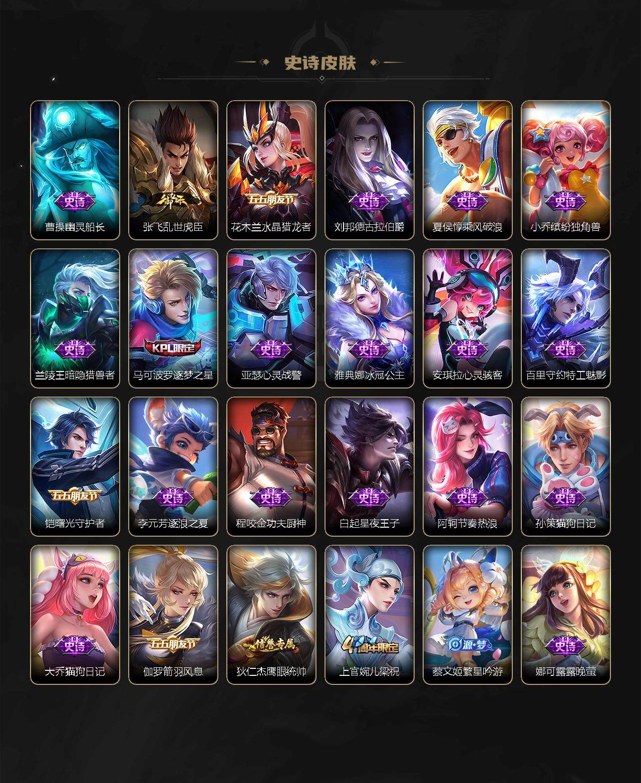 【史诗皮肤】:露娜紫霞仙子,阿轲暗夜猫娘,赵云皇家上将,赵云未来纪元,貂蝉圣诞恋歌,甄姬冰雪圆舞曲,狄仁杰魔术师,廉颇地狱岩魂,宫本武藏鬼剑武藏,孙尚香水果甜心,嬴政优雅恋人,嬴政暗夜贵公子,嬴政摇滚巨星,妲己魅力维加斯,妲己女仆咖啡,墨子龙骑士,墨子金属风暴,吕布圣诞狂欢,曹操幽灵船长,张飞乱世虎臣,花木兰水晶猎龙者,刘邦德古拉伯爵,夏侯惇乘风破浪,小乔缤纷独角兽,兰陵王暗隐猎兽者,马可波罗逐梦之星,亚瑟心灵战警,雅典娜冰冠公主,安琪拉心灵骇客,百里守约特工魅影,铠曙光守护者,李元芳逐浪之夏,程咬金功夫厨神,白起星夜王子,阿轲节奏热浪,孙策猫狗日记,大乔猫狗日记,伽罗箭羽风息,狄仁杰鹰眼统帅,上官婉儿梁祝,蔡文姬繁星吟游,娜可露露