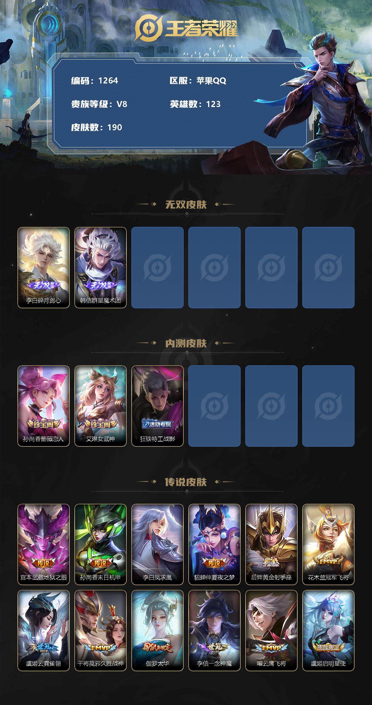 - [11796232]V10 9典藏 5无双 6珍品传说 72传说 126英雄 552皮肤 典藏英雄武则天 可修改实名 嬴政小国标 虞姬小国标 不知火舞小国标 优质装备:天鹅之梦(小乔典藏),星空梦想(太空人),无限飓风号(高达),杀手不太冷,大秦宣太后,鸣剑·曳影,九霄神辉(木兰典藏),幻阙歌(貂蝉典藏),碎月剑心(李白无双),神鉴启示录,花合斗,离恨烟(公孙离无双),器灵·螭龙剑,天机白泽,江户川柯南,怪盗基德,酷洛米之心,朽木白哉,黑崎一护,黄金狮子座,黄金射手座,冠军飞将,云鹰飞将(小将军),绛天战甲(鸡嘴战神),黄金白羊座,猫影幻舞,久胜战神,炽阳神光,一念神魔,云霓雀翎,末日机甲-孙尚香(绿蚂蚱),地狱火,仲夏夜之梦(大飞蛾),音你心动-小乔,零号·赤焰,海洋之心,地狱之眼,飞鸢探春,音你心动-周瑜,胖达荣荣,李逍遥,乞巧织情,时之恋人-刘备(电焊工),游龙清影(小青龙),淬星耀世,超时空战士-狄仁杰,遇见胡旋,挚爱花嫁,无双飞将,音你闪耀(rap皮),碎云,神器·狴犴令,记忆之芯(机甲兔),妄想实况,惊梅引,鲁班七号-时之奇旅,霜月吟,澜逐花归海,艾琳觅芳踪,诡秘之主,涂山容容 珍品传说:兔狲·蓬尾 传说皮:乘龙·问璇玑(孙尚香年限),乘龙·铭钟鼎(赵云年限),落雪白狼,九山相柳,云诺千山,祥瑞亨通,幻光神枪 珍宝阁皮:优雅恋人,蔷薇恋人,女武神 限定皮:愿照·九州拓(澜年限),愿照·福禄聚(蔡文姬年限),愿照·岁时盈(虞姬年限),愿照·山河定(司空震年限),愿照·众生和(妲己年限),愿照·千秋盛(女娲年限),逐霄战戟,映山客,陌上桑,鸣野蒿,至尊宝,白虎志(电光耗子),凤求凰(白切鸡),凤凰于飞,太华(伽罗年限),梅西,武陵仙君(小桃花),傲雪梅枪,寅虎·展翼(孙膑年限),白鹤梁神女,白晶晶,时雨天司(水龙头),神威(电光马子),飞衡(韩信年限),玄嵩(庄周年限),遇见飞天,高山流水,诗剑行,五谷丰年,青龙志(铠年限),冰锋战神,幽恒(沐浴露),武圣,天狼运算者,游园惊梦,梁祝,御风骁将(吕布年限),天狼狩猎者,逐梦之星,岱宗(典韦年限),天狼溯光者,天狼征服者,奔雷神使(牛魔年限),祈雪灵祝(雪兔子),天狼绘梦者,李小龙,逐梦之影,朱雀志(守约年限),永曜之星,辉光之辰,如梦令-嫦娥,如梦令-后羿,霸王别姬-虞姬,纯白花嫁,孙行者,一生所爱,大圣娶亲,天魔缭乱,