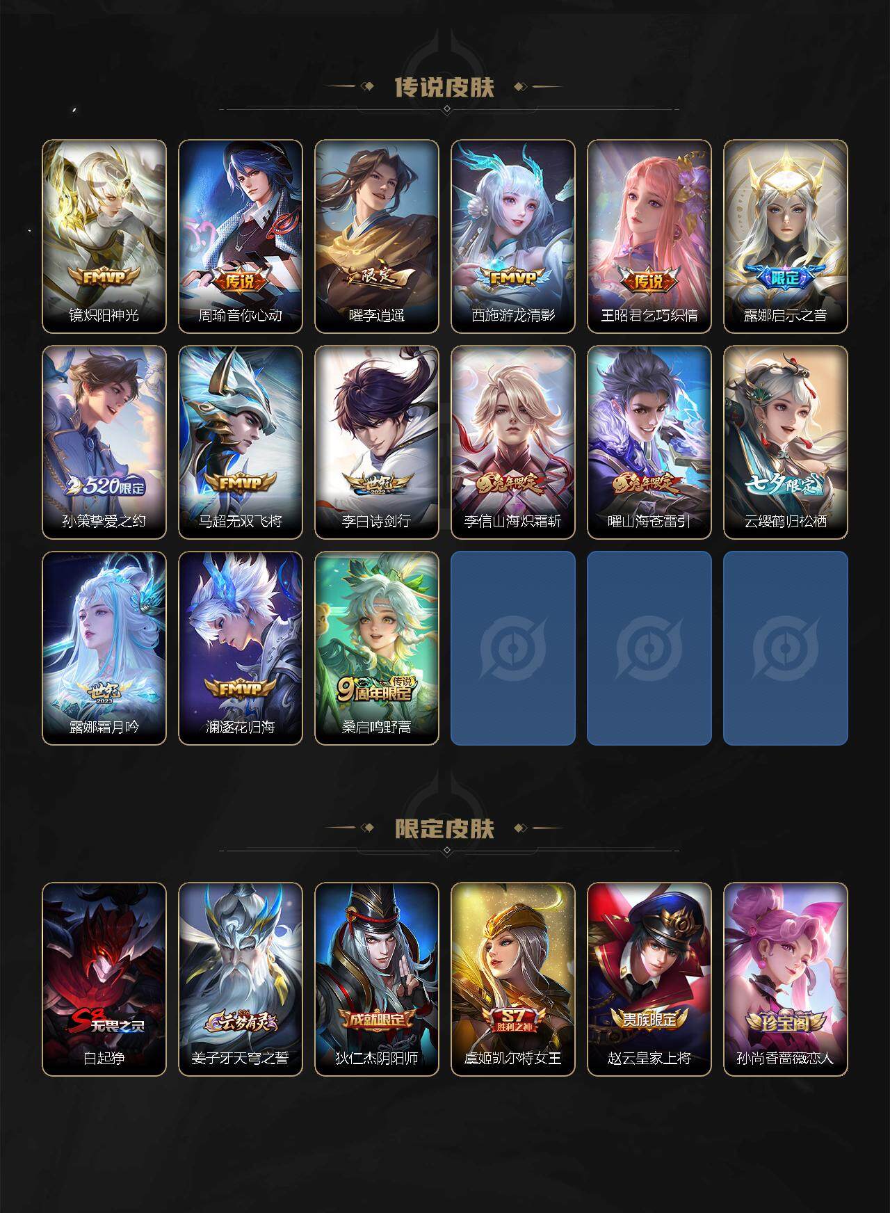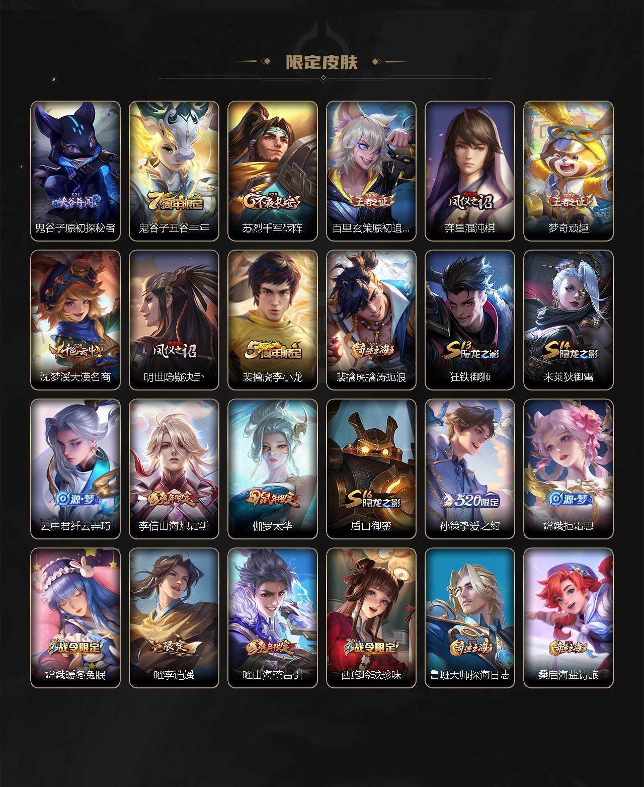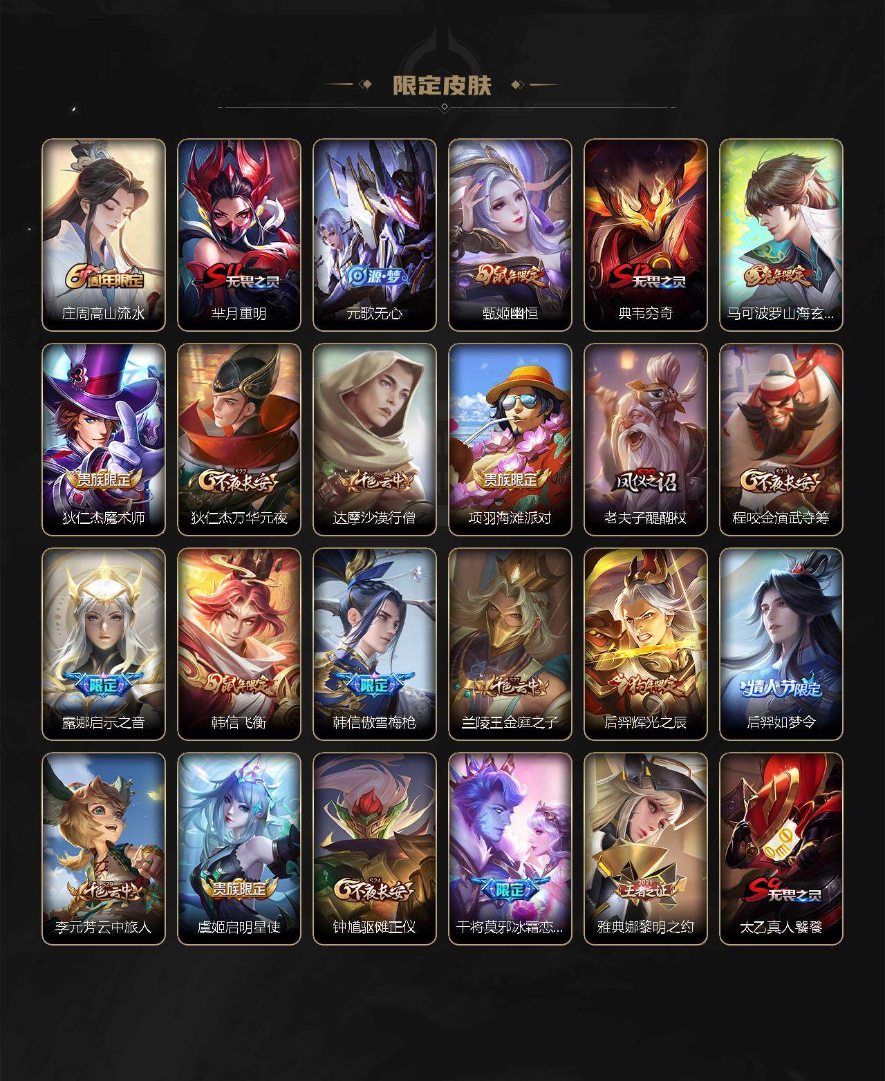 【限定皮肤】:白起狰,姜子牙天穹之誓,狄仁杰阴阳师,虞姬凯尔特女王,赵云皇家上将,孙尚香蔷薇恋人,庄周高山流水,芈月重明,元歌无心,甄姬幽恒,典韦穷奇,马可波罗山海玄木吟,狄仁杰魔术师,狄仁杰万华元夜,达摩沙漠行僧,项羽海滩派对,老夫子醍醐杖,程咬金演武夺筹,露娜启示之音,韩信飞衡,韩信傲雪梅枪,兰陵王金庭之子,后羿辉光之辰,后羿如梦令,李元芳云中旅人,虞姬启明星使,钟馗驱傩正仪,干将莫邪冰霜恋舞曲,雅典娜黎明之约,太乙真人饕餮,鬼谷子原初探秘者,鬼谷子五谷丰年,苏烈千军破阵,百里玄策原初追逐者,弈星混沌棋,梦奇顽趣,沈梦溪大漠名商,明世隐疑决卦,裴擒虎李小龙,裴擒虎擒涛扼浪,狂铁御狮,米莱狄御霄,云中君纤云弄巧,李信山海炽霜斩,伽罗太华,盾山御銮,孙策挚爱之约,嫦娥拒霜思,嫦娥暖冬兔眠,曜李逍遥 ,曜山海苍雷引,西施玲珑珍味,鲁班大师探海日志,桑启海盐诗旅,暃星界游侠,艾琳女武神,赵怀真鹤归松栖,云缨鹤归松栖,阿古朵江河有灵,张良古海寻踪,蒙犽百解令,蒙恬荣光圣徽,鬼谷子天穹祈灯,李白碎月剑心,刘邦剑破天穹,程咬金群星魔术团,韩信群星魔术团,项羽苍威无极