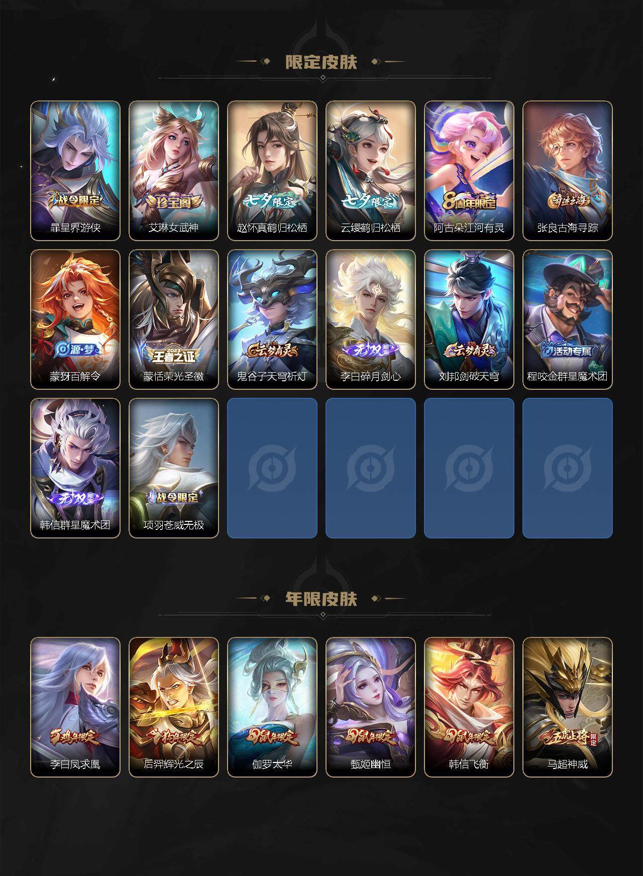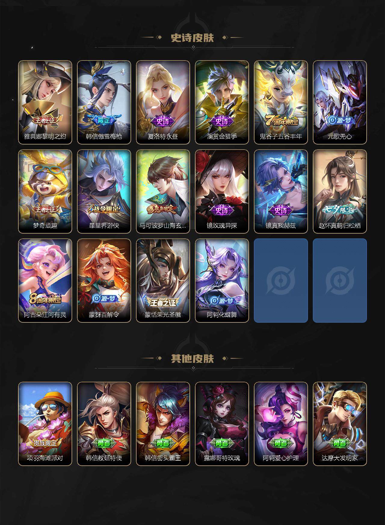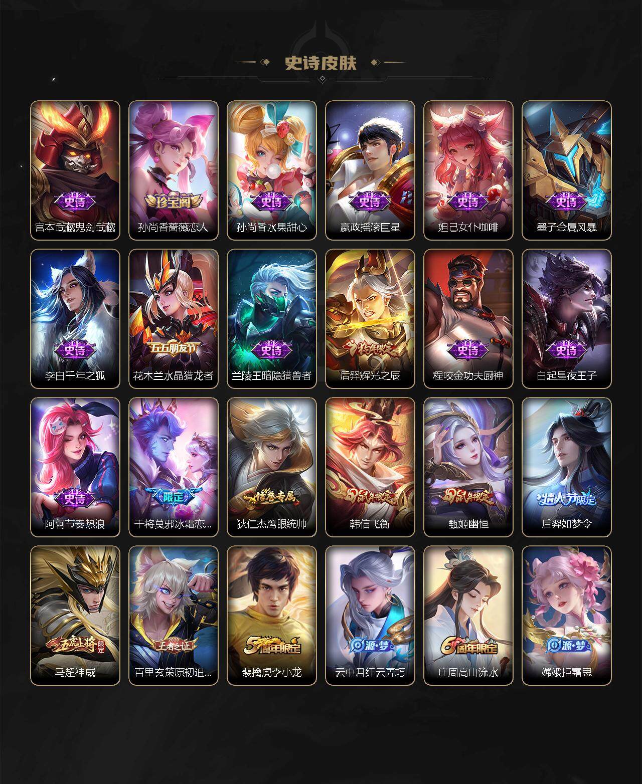 【限定皮肤】:白起狰,姜子牙天穹之誓,狄仁杰阴阳师,虞姬凯尔特女王,赵云皇家上将,孙尚香蔷薇恋人,庄周高山流水,芈月重明,元歌无心,甄姬幽恒,典韦穷奇,马可波罗山海玄木吟,狄仁杰魔术师,狄仁杰万华元夜,达摩沙漠行僧,项羽海滩派对,老夫子醍醐杖,程咬金演武夺筹,露娜启示之音,韩信飞衡,韩信傲雪梅枪,兰陵王金庭之子,后羿辉光之辰,后羿如梦令,李元芳云中旅人,虞姬启明星使,钟馗驱傩正仪,干将莫邪冰霜恋舞曲,雅典娜黎明之约,太乙真人饕餮,鬼谷子原初探秘者,鬼谷子五谷丰年,苏烈千军破阵,百里玄策原初追逐者,弈星混沌棋,梦奇顽趣,沈梦溪大漠名商,明世隐疑决卦,裴擒虎李小龙,裴擒虎擒涛扼浪,狂铁御狮,米莱狄御霄,云中君纤云弄巧,李信山海炽霜斩,伽罗太华,盾山御銮,孙策挚爱之约,嫦娥拒霜思,嫦娥暖冬兔眠,曜李逍遥 ,曜山海苍雷引,西施玲珑珍味,鲁班大师探海日志,桑启海盐诗旅,暃星界游侠,艾琳女武神,赵怀真鹤归松栖,云缨鹤归松栖,阿古朵江河有灵,张良古海寻踪,蒙犽百解令,蒙恬荣光圣徽,鬼谷子天穹祈灯,李白碎月剑心,刘邦剑破天穹,程咬金群星魔术团,韩信群星魔术团,项羽苍威无极