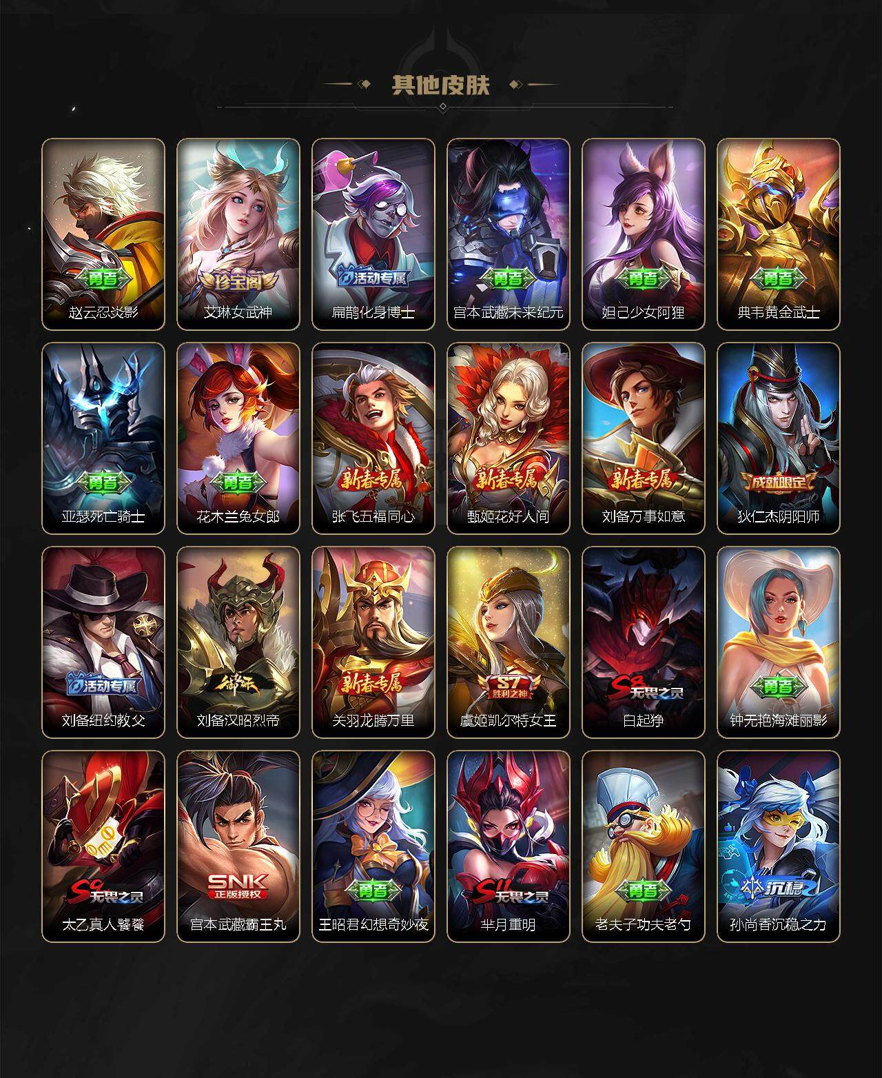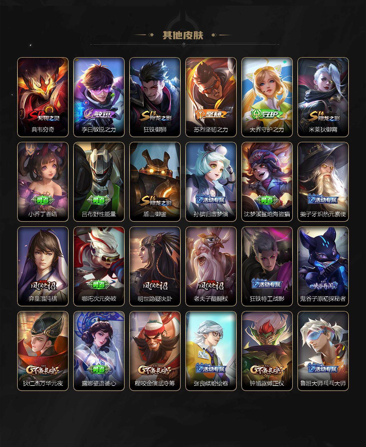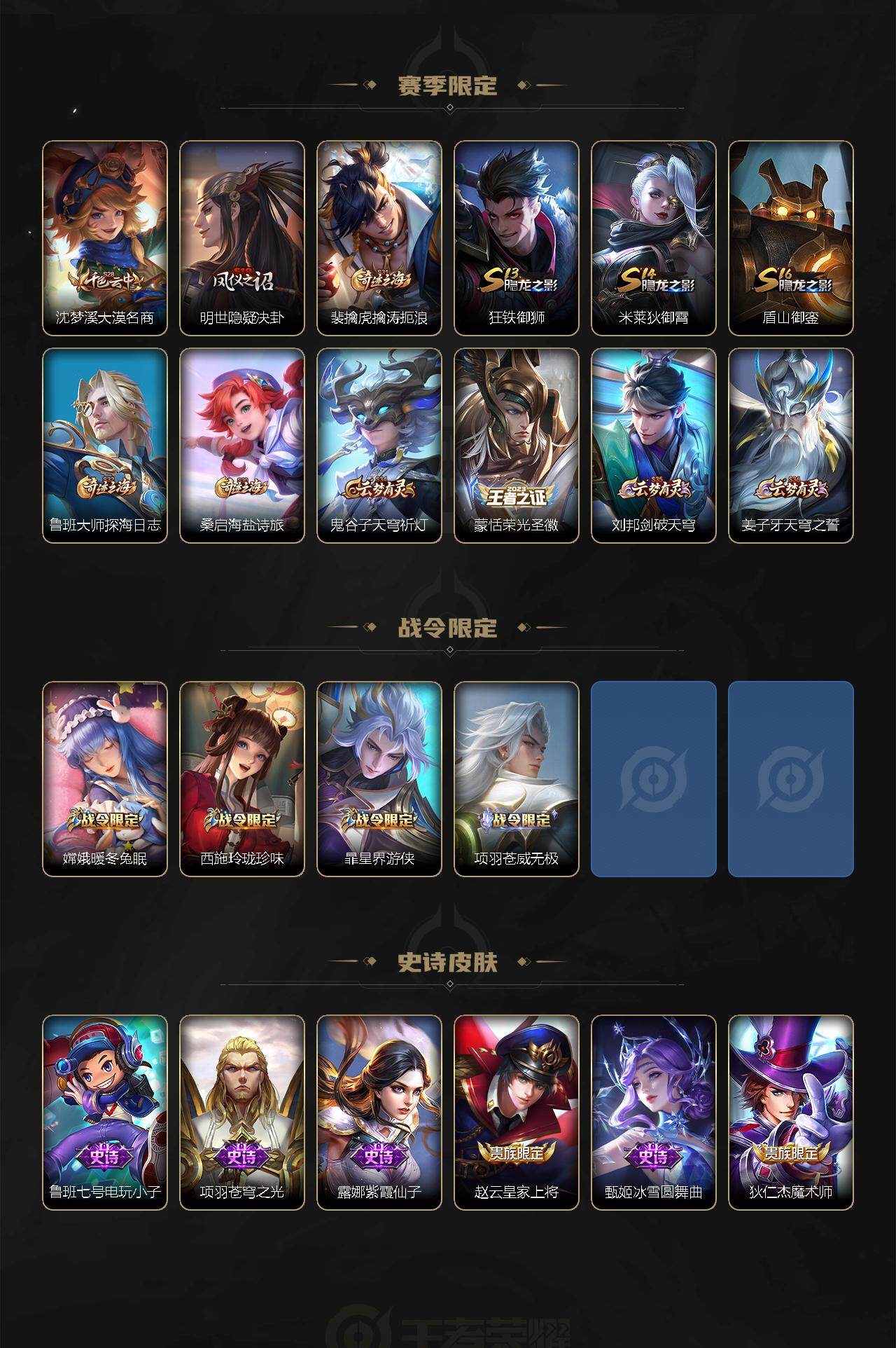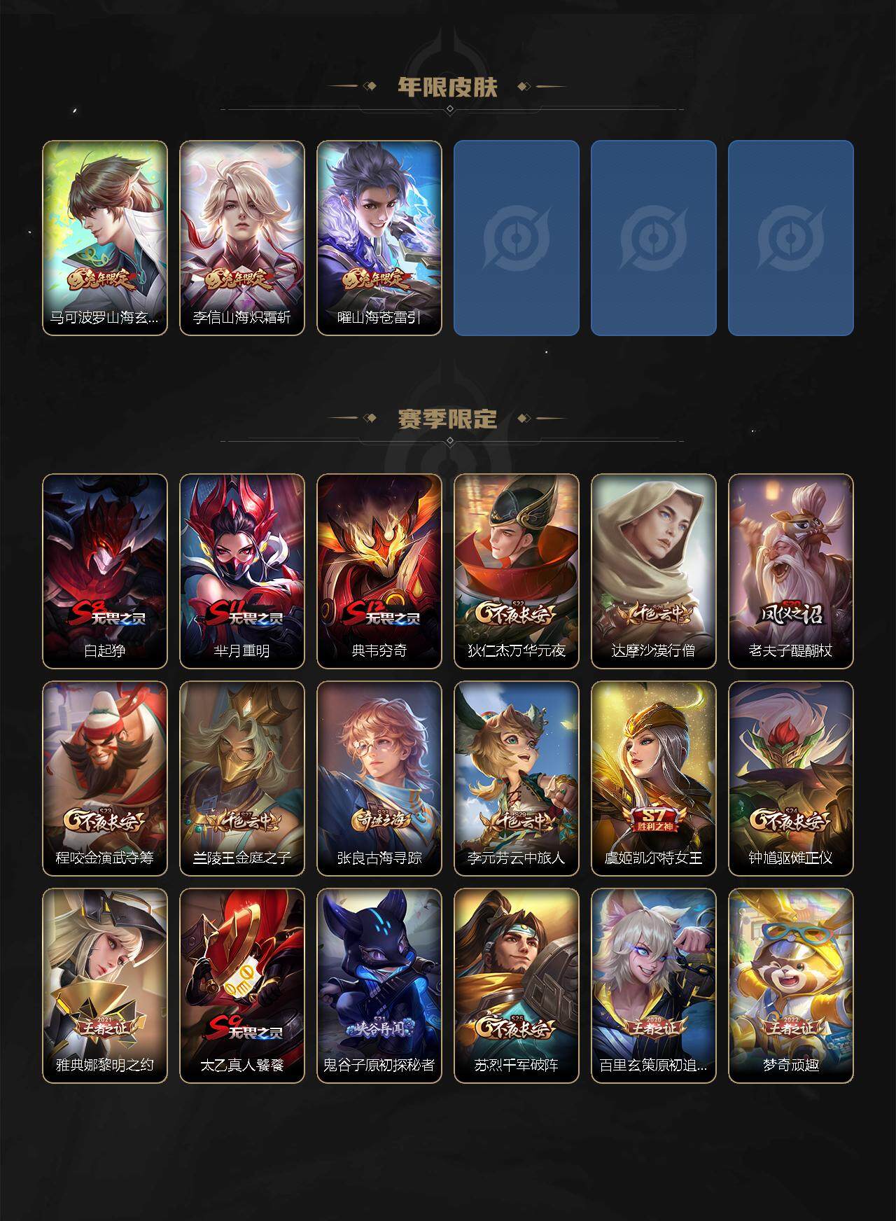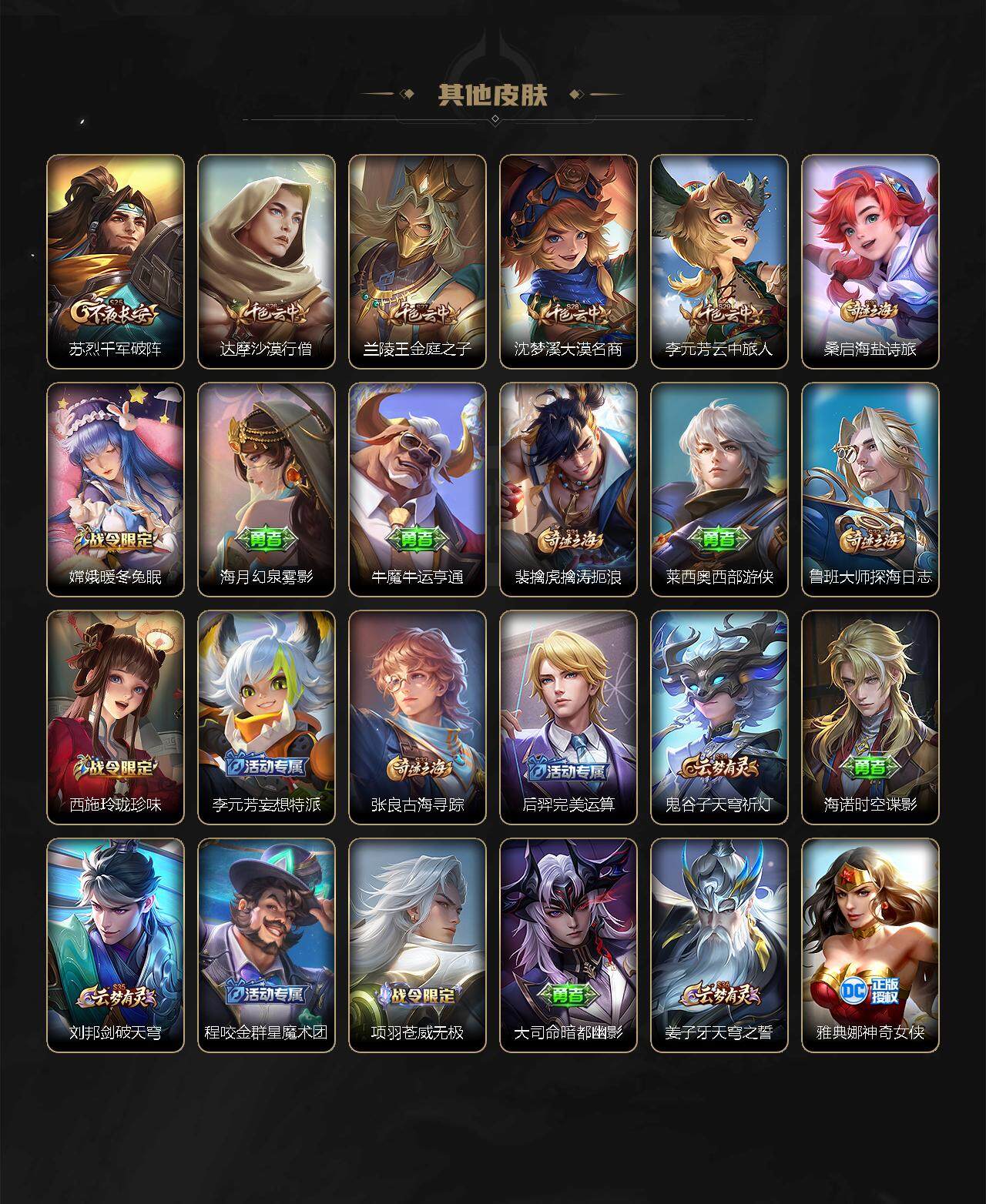 【赛季限定】:白起狰,芈月重明,典韦穷奇,狄仁杰万华元夜,达摩沙漠行僧,老夫子醍醐杖,程咬金演武夺筹,兰陵王金庭之子,张良古海寻踪,李元芳云中旅人,虞姬凯尔特女王,钟馗驱傩正仪,雅典娜黎明之约,太乙真人饕餮,鬼谷子原初探秘者,苏烈千军破阵,百里玄策原初追逐者,弈星混沌棋,梦奇顽趣,沈梦溪大漠名商,明世隐疑决卦,裴擒虎擒涛扼浪,