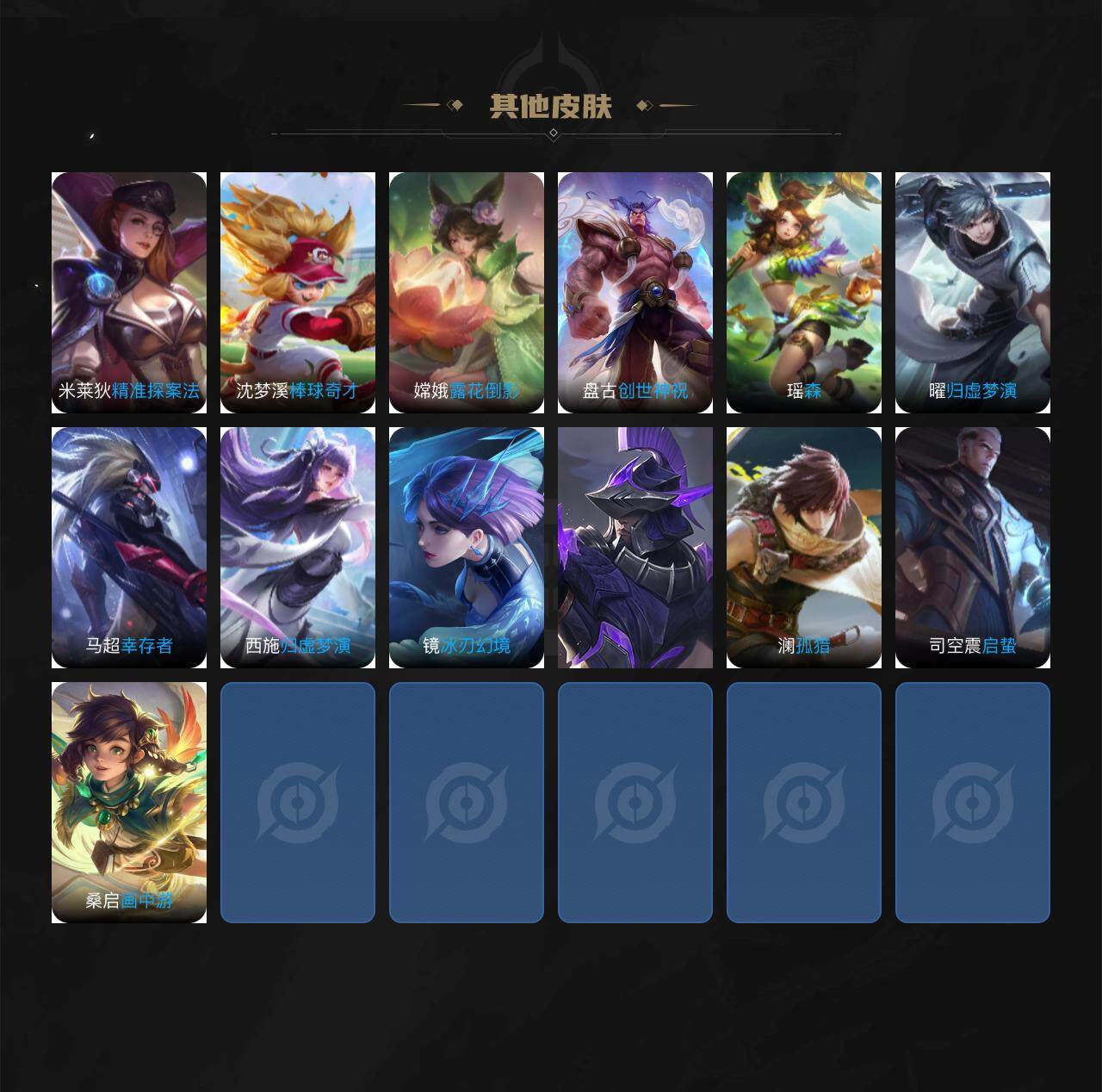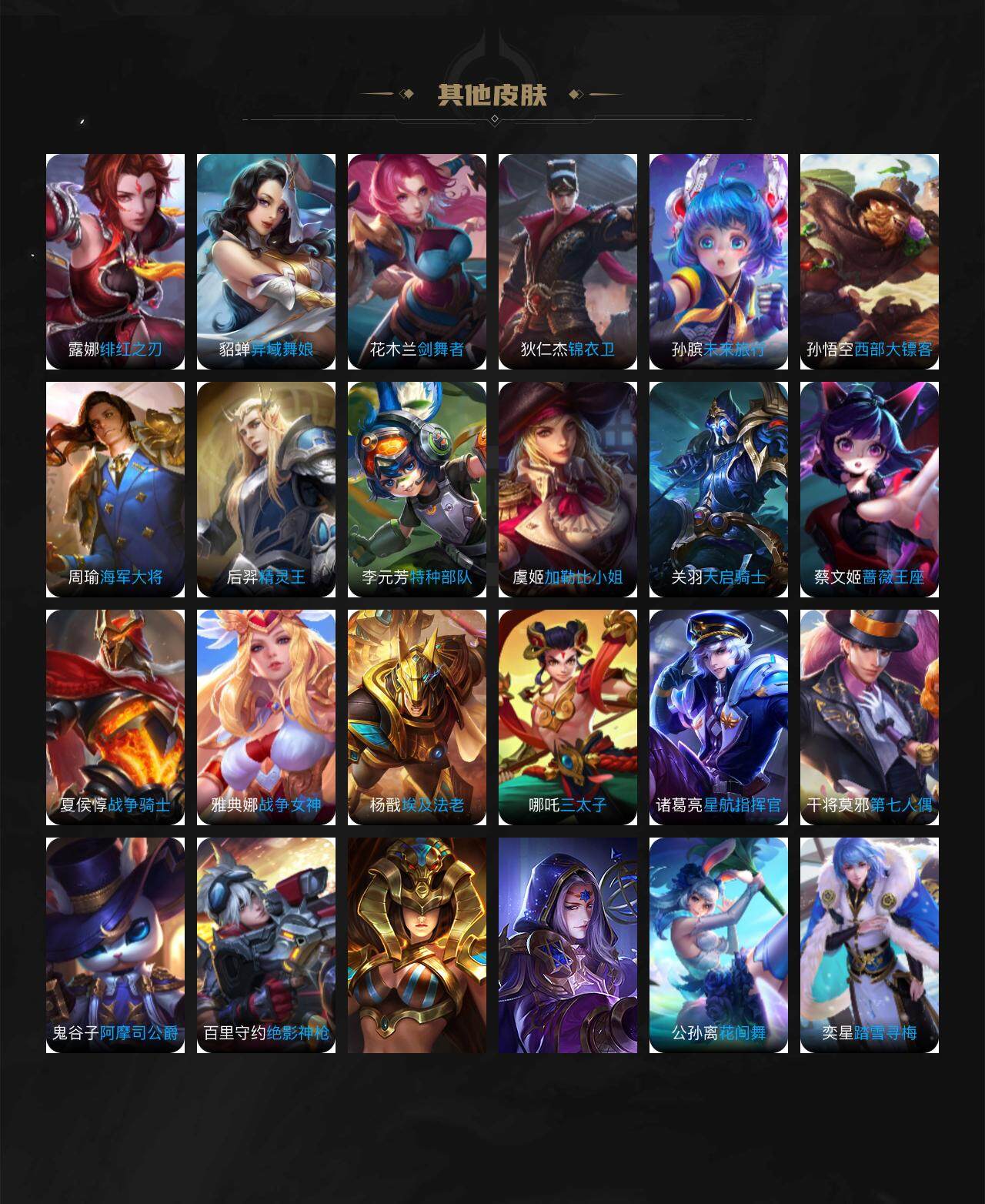虞姬凯尔特女王,白起狰,太乙真人饕餮,芈月重明,典韦穷奇,狂铁御狮,米莱狄御霄,盾山御銮,明世隐疑决卦,老夫子醍醐杖,鬼谷子原初探秘者,狄仁杰万华元夜,程咬金演武夺筹,钟馗驱傩正仪,苏烈千军破阵,弈星混沌棋,达摩沙漠行僧,兰陵王金庭之子,沈梦溪大漠名商,李元芳云中旅人,桑启海盐诗旅,裴擒虎擒涛扼浪,鲁班大师探海日志,张良古海寻踪,项羽苍威无极