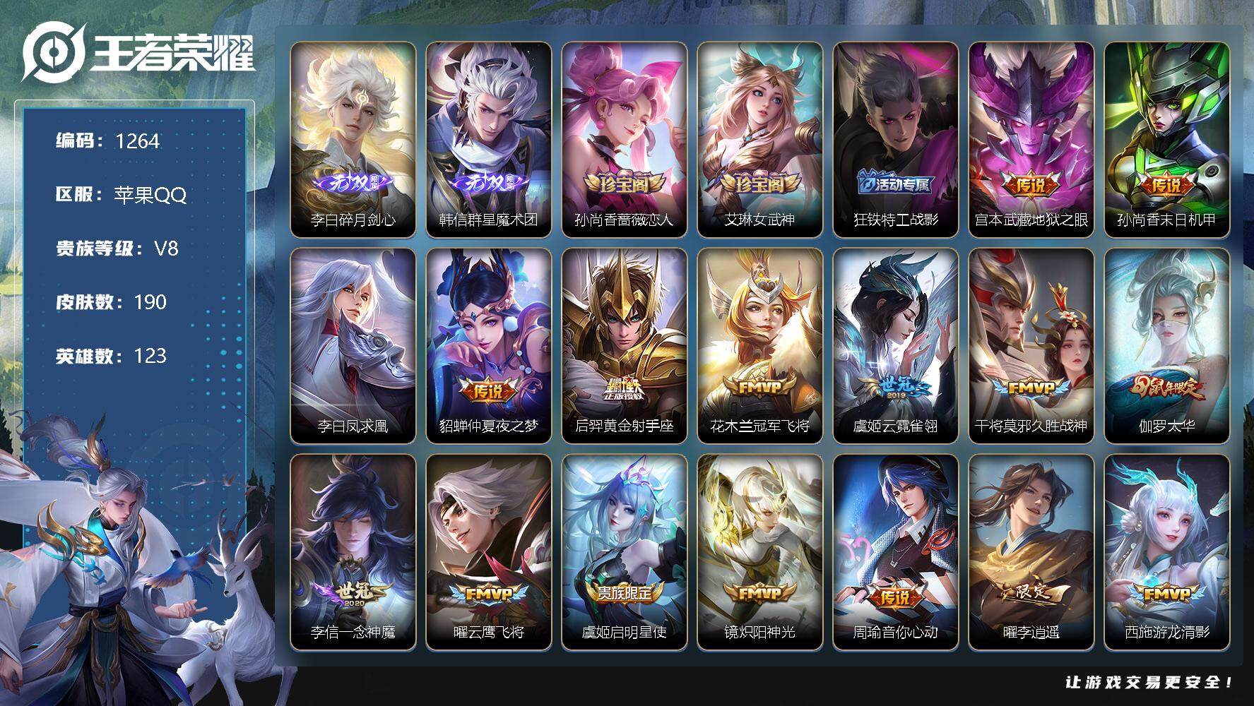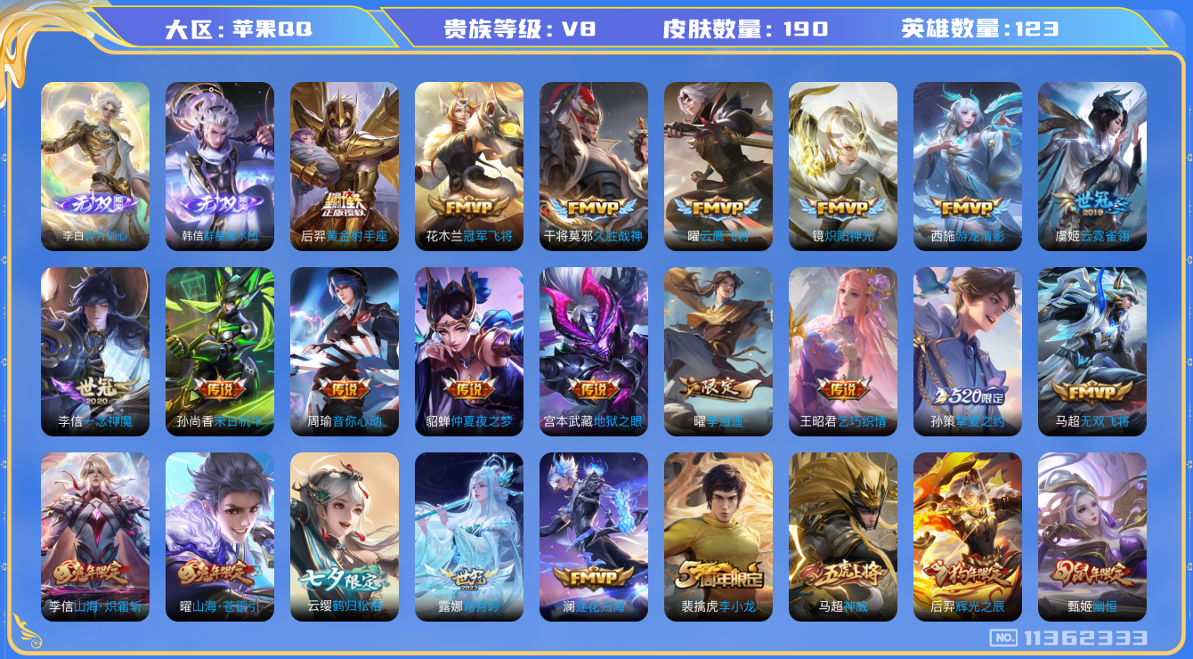 [11362333]【商品标题】:苹果Q-V8-永恒钻石III段位-123英雄-190皮肤-0典藏-0珍品无双-2无双-0珍品传说-27传说-46史诗