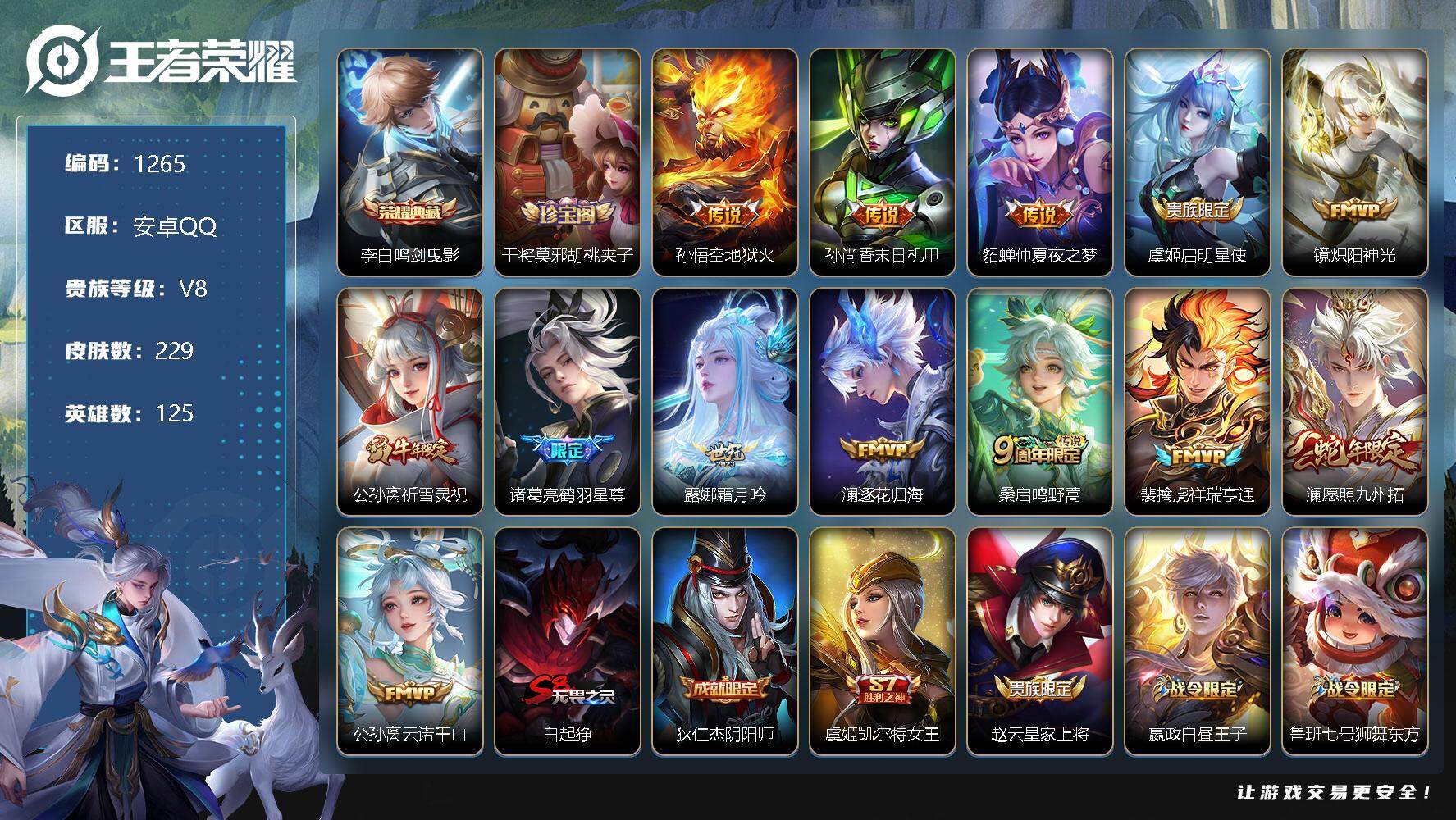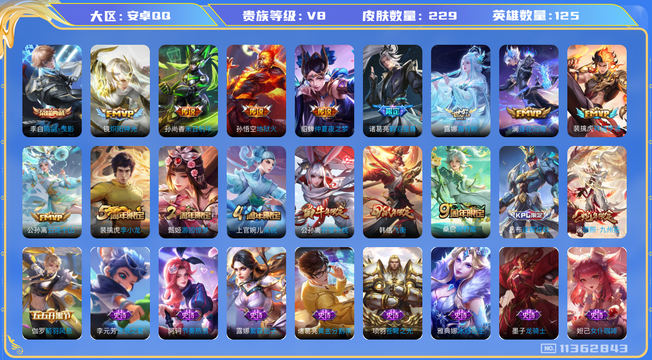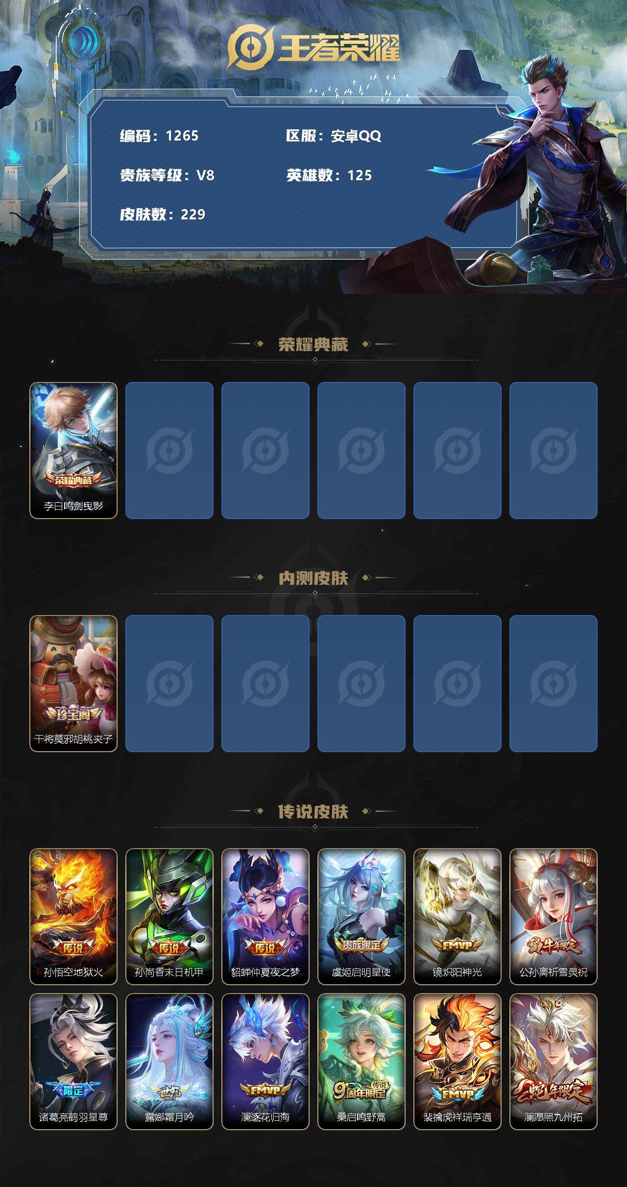[11362843]【商品标题】:安卓Q-V7-最强王者段位-125英雄-229皮肤-1典藏-0珍品无双-0无双-0珍品传说-13传说-46史诗
