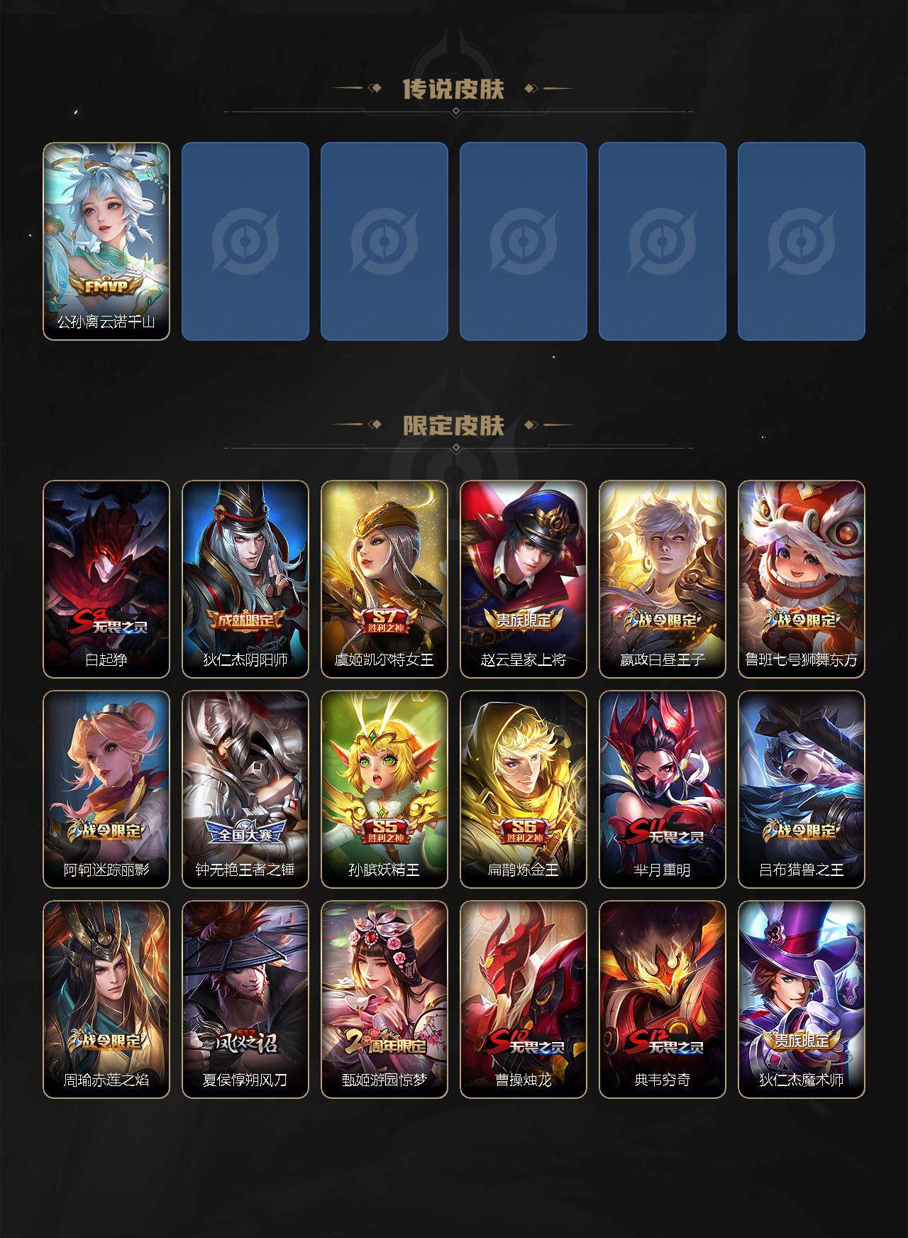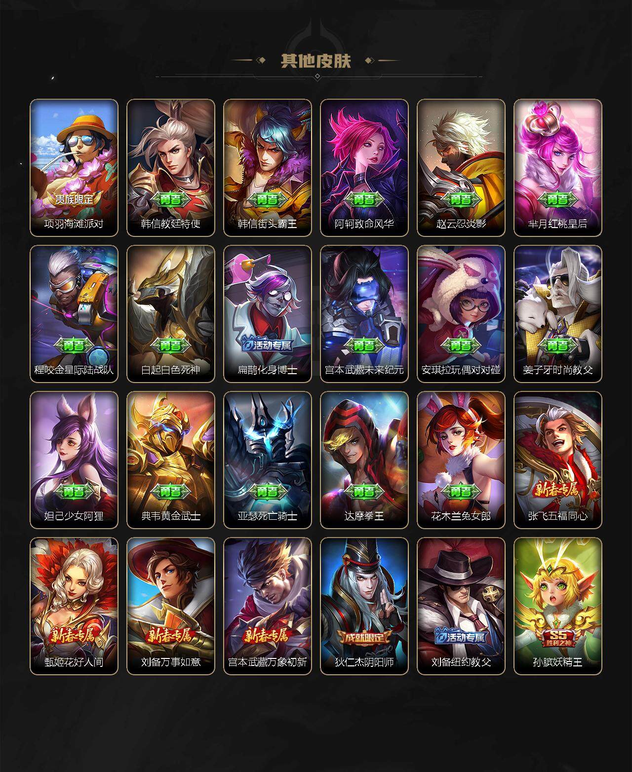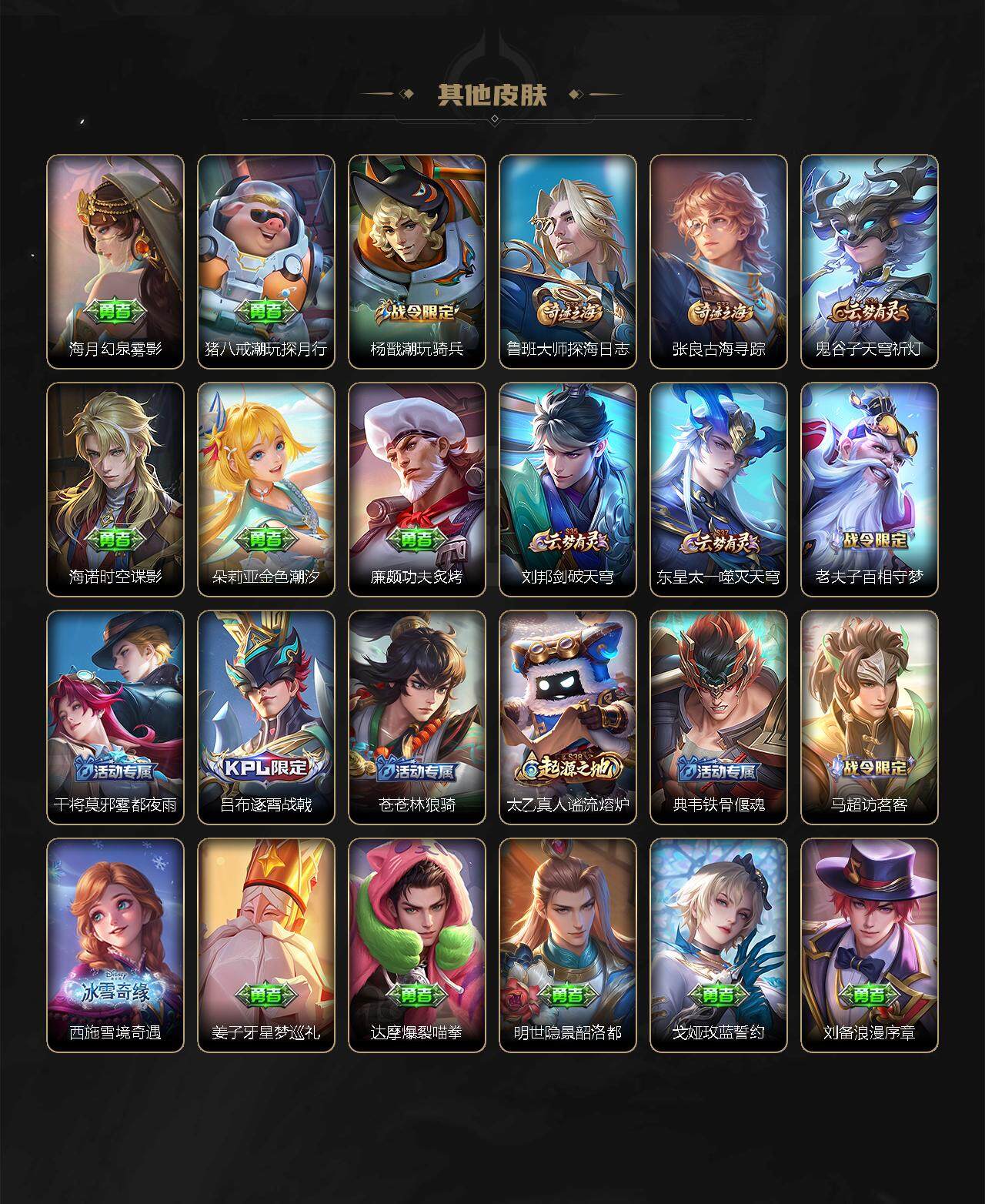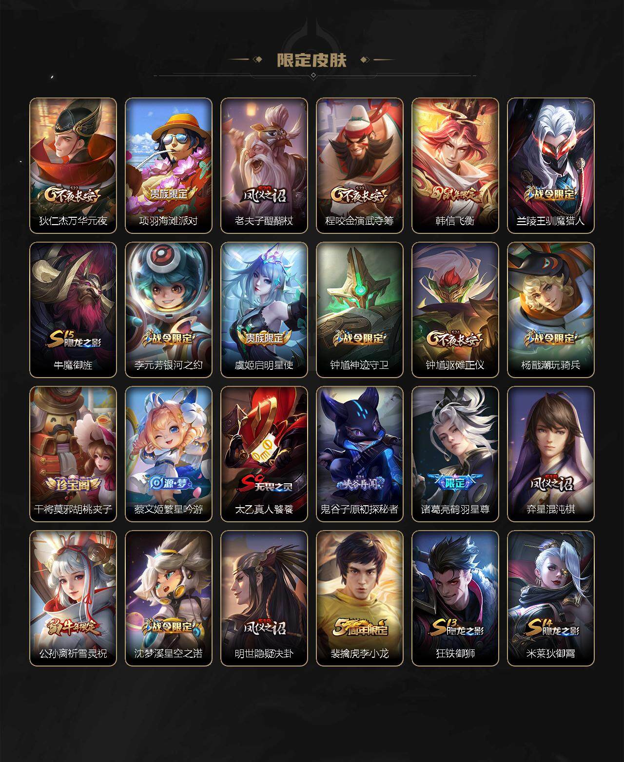 【限定皮肤】:白起狰,狄仁杰阴阳师,虞姬凯尔特女王,赵云皇家上将,嬴政白昼王子,鲁班七号狮舞东方,阿轲迷踪丽影,钟无艳王者之锤,孙膑妖精王,扁鹊炼金王,芈月重明,吕布猎兽之王,周瑜赤莲之焰,夏侯惇朔风刀,甄姬游园惊梦,曹操烛龙,典韦穷奇,狄仁杰魔术师,狄仁杰万华元夜,项羽海滩派对,老夫子醍醐杖,程咬金演武夺筹,韩信飞衡,兰陵王驯魔猎人,牛魔御旌,李元芳银河之约,虞姬启明星使,钟馗神迹守卫,钟馗驱傩正仪,杨戬潮玩骑兵,干将莫邪胡桃夹子,蔡文姬繁星吟游,太乙真人饕餮,鬼谷子原初探秘者,诸葛亮鹤羽星尊,弈星混沌棋,公孙离祈雪灵祝,沈梦溪星空之诺,明世隐疑决卦,裴擒虎李小龙,狂铁御狮,米莱狄御霄,盾山御銮,上官婉儿梁祝,鲁班大师探海日志,张良古海寻踪,鬼谷子天穹祈灯,刘邦剑破天穹