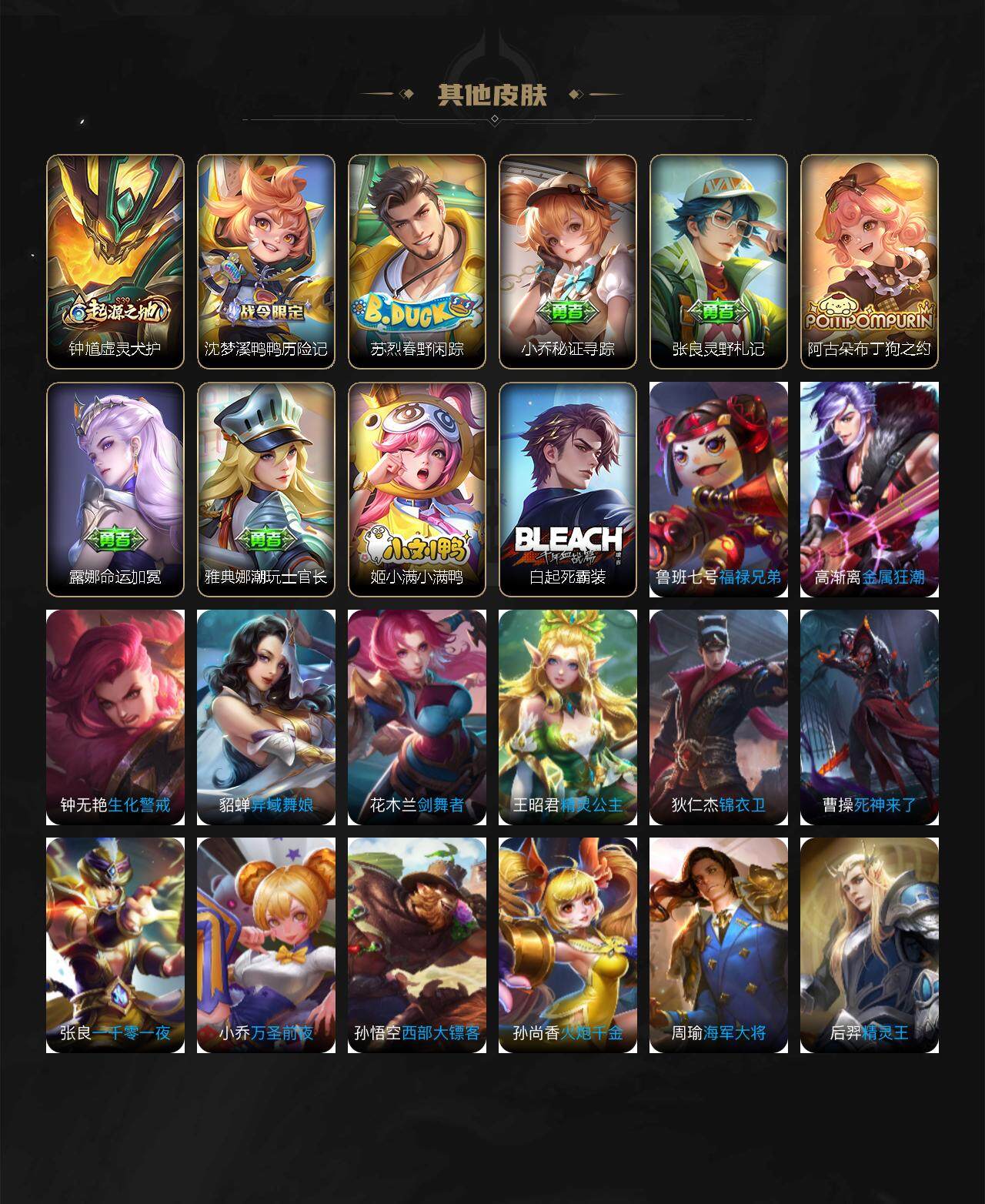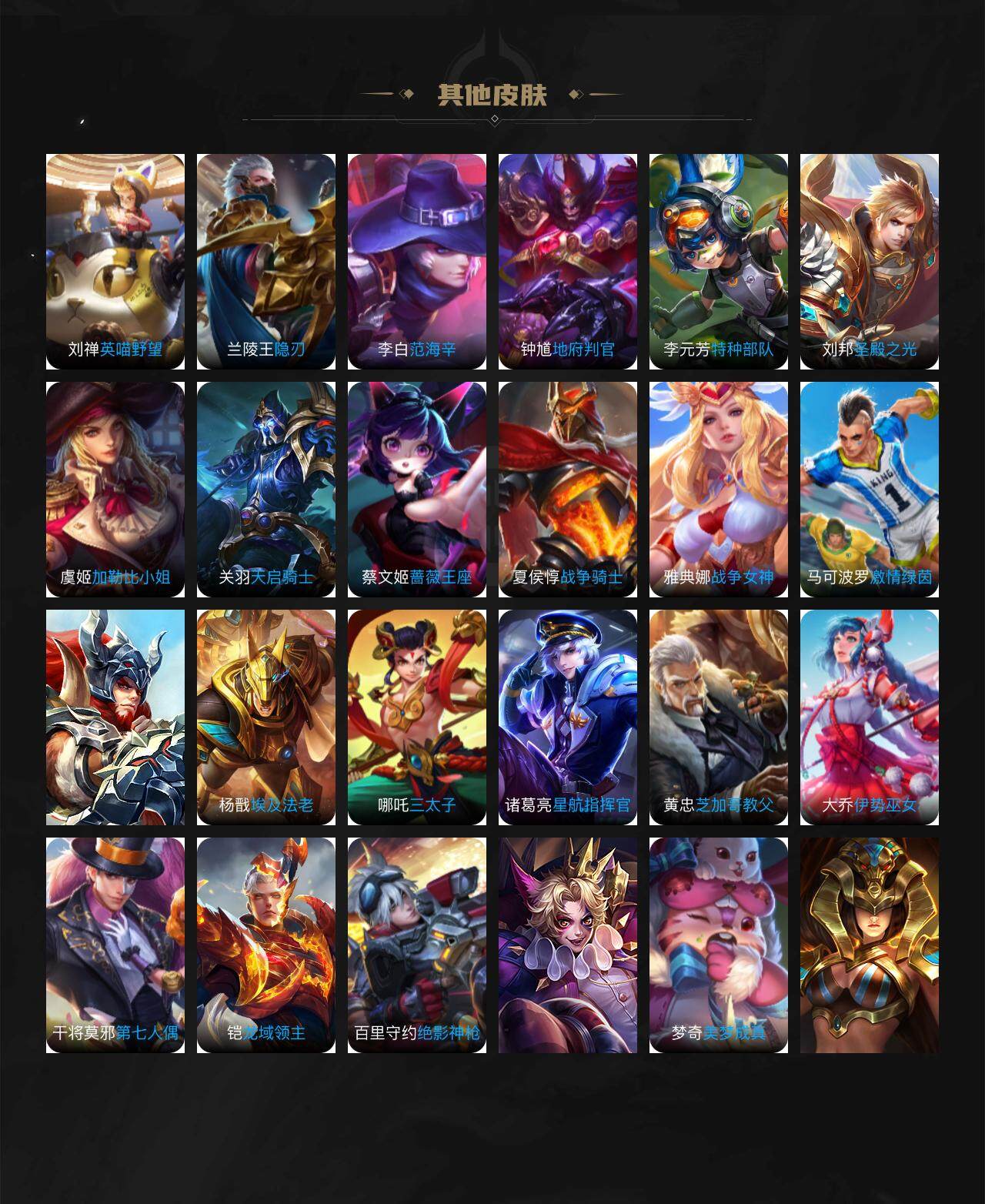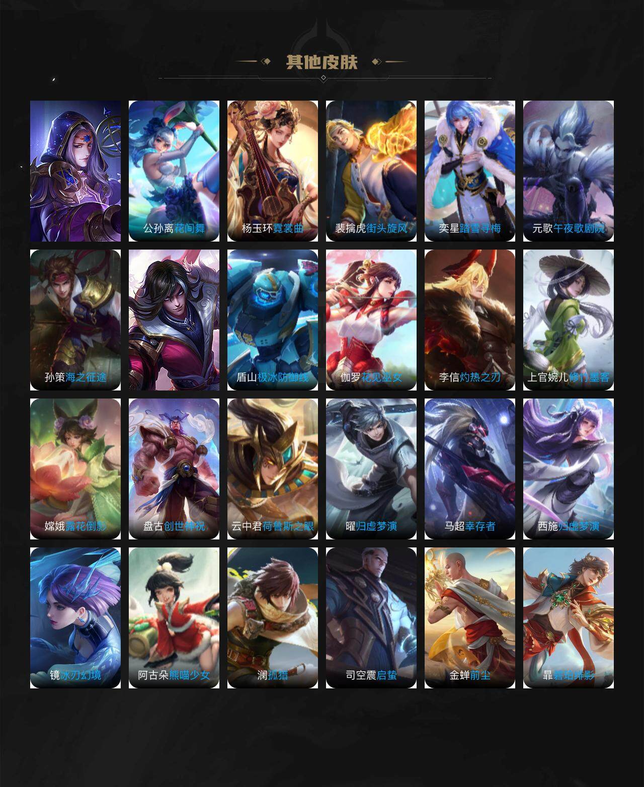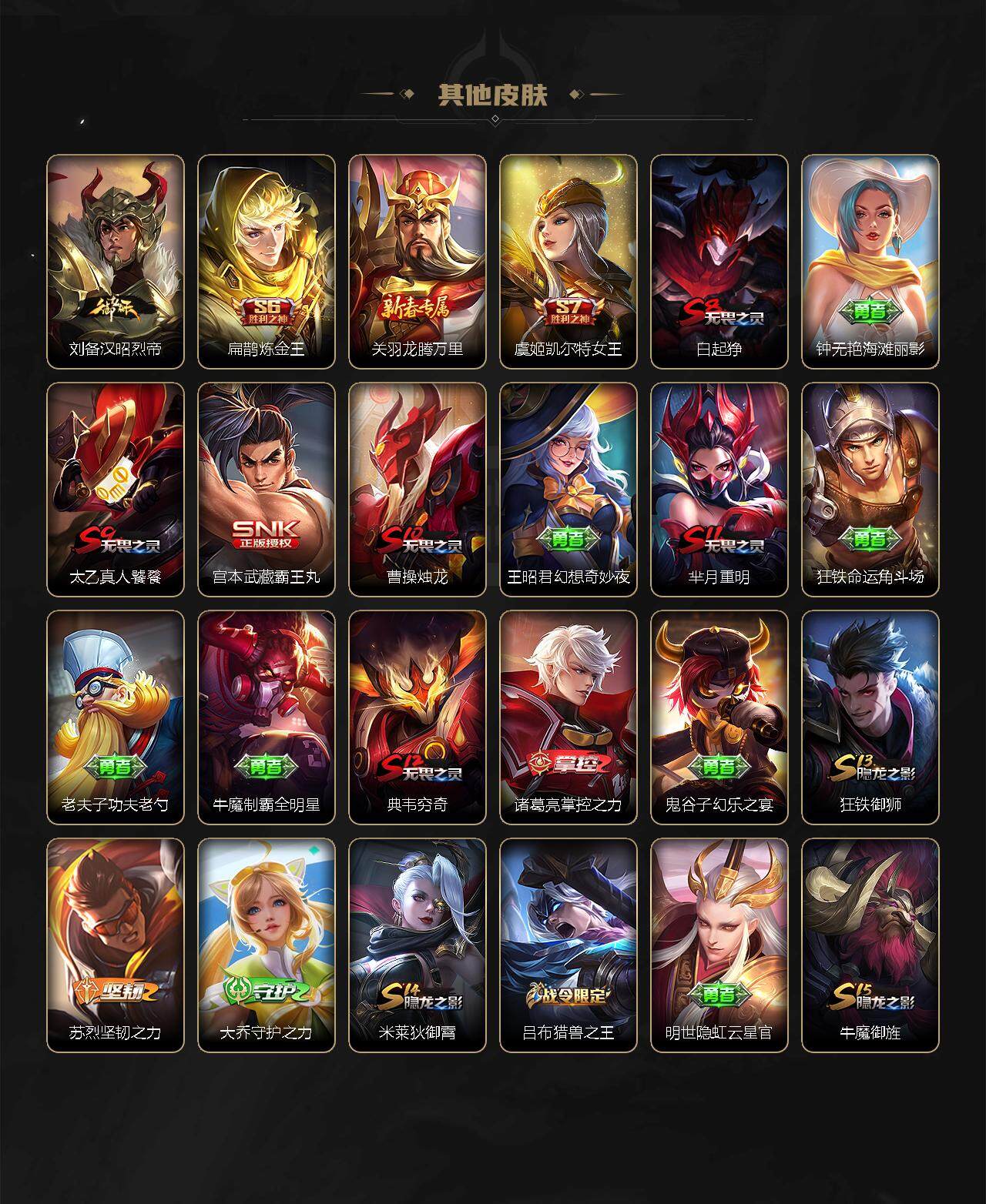 【限定皮肤】:白起狰,狄仁杰阴阳师,虞姬凯尔特女王,赵云皇家上将,嬴政白昼王子,鲁班七号狮舞东方,阿轲迷踪丽影,钟无艳王者之锤,孙膑妖精王,扁鹊炼金王,芈月重明,吕布猎兽之王,周瑜赤莲之焰,夏侯惇朔风刀,甄姬游园惊梦,曹操烛龙,典韦穷奇,狄仁杰魔术师,狄仁杰万华元夜,项羽海滩派对,老夫子醍醐杖,程咬金演武夺筹,韩信飞衡,兰陵王驯魔猎人,牛魔御旌,李元芳银河之约,虞姬启明星使,钟馗神迹守卫,钟馗驱傩正仪,杨戬潮玩骑兵,干将莫邪胡桃夹子,蔡文姬繁星吟游,太乙真人饕餮,鬼谷子原初探秘者,诸葛亮鹤羽星尊,弈星混沌棋,公孙离祈雪灵祝,沈梦溪星空之诺,明世隐疑决卦,裴擒虎李小龙,狂铁御狮,米莱狄御霄,盾山御銮,上官婉儿梁祝,鲁班大师探海日志,张良古海寻踪,鬼谷子天穹祈灯,刘邦剑破天穹