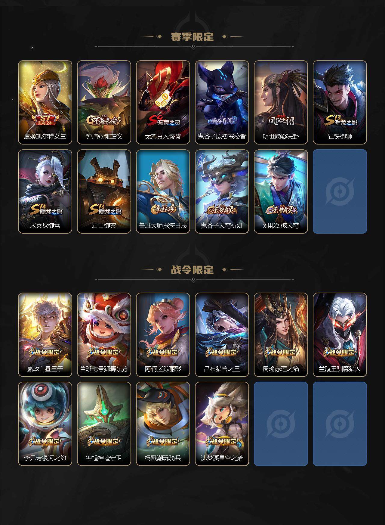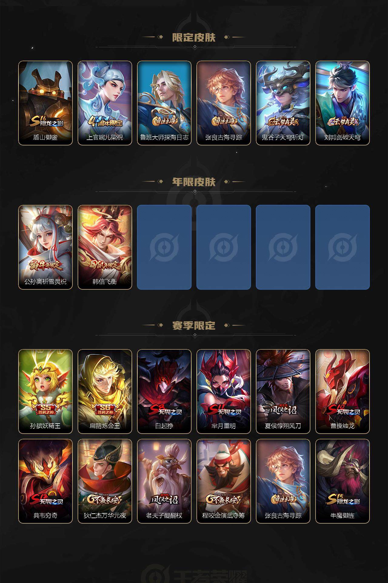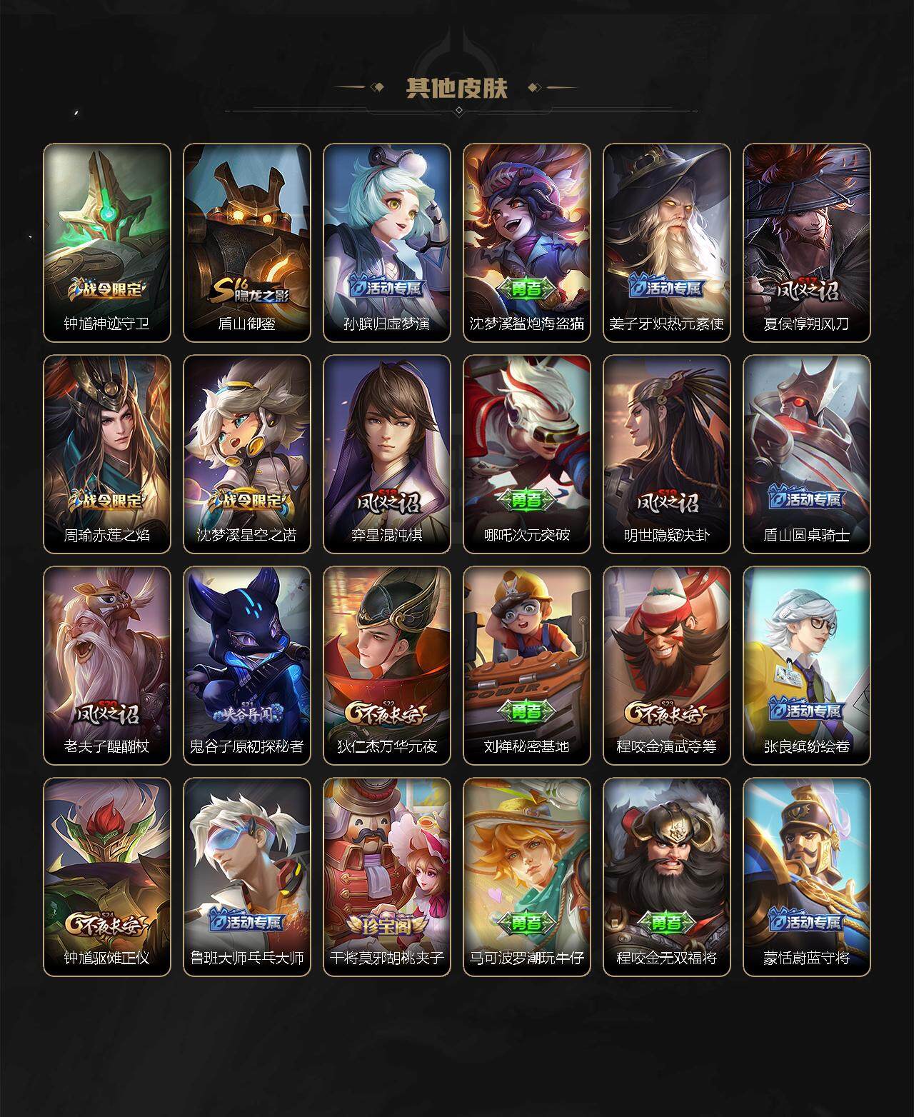 【赛季限定】:孙膑妖精王,扁鹊炼金王,白起狰,芈月重明,夏侯惇朔风刀,曹操烛龙,典韦穷奇,狄仁杰万华元夜,老夫子醍醐杖,程咬金演武夺筹,张良古海寻踪,牛魔御旌,虞姬凯尔特女王,钟馗驱傩正仪,太乙真人饕餮,鬼谷子原初探秘者,弈星混沌棋,明世隐疑决卦,狂铁御狮,米莱狄御霄,盾山御銮,鲁班大师探海日志,鬼谷子天穹祈灯,刘邦剑破天穹