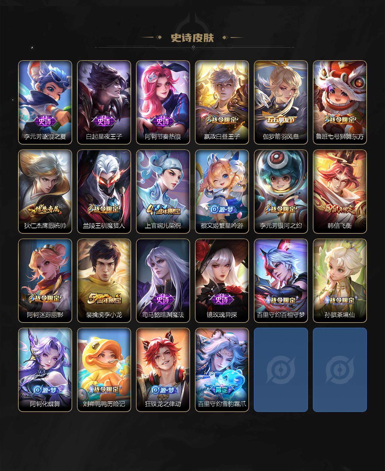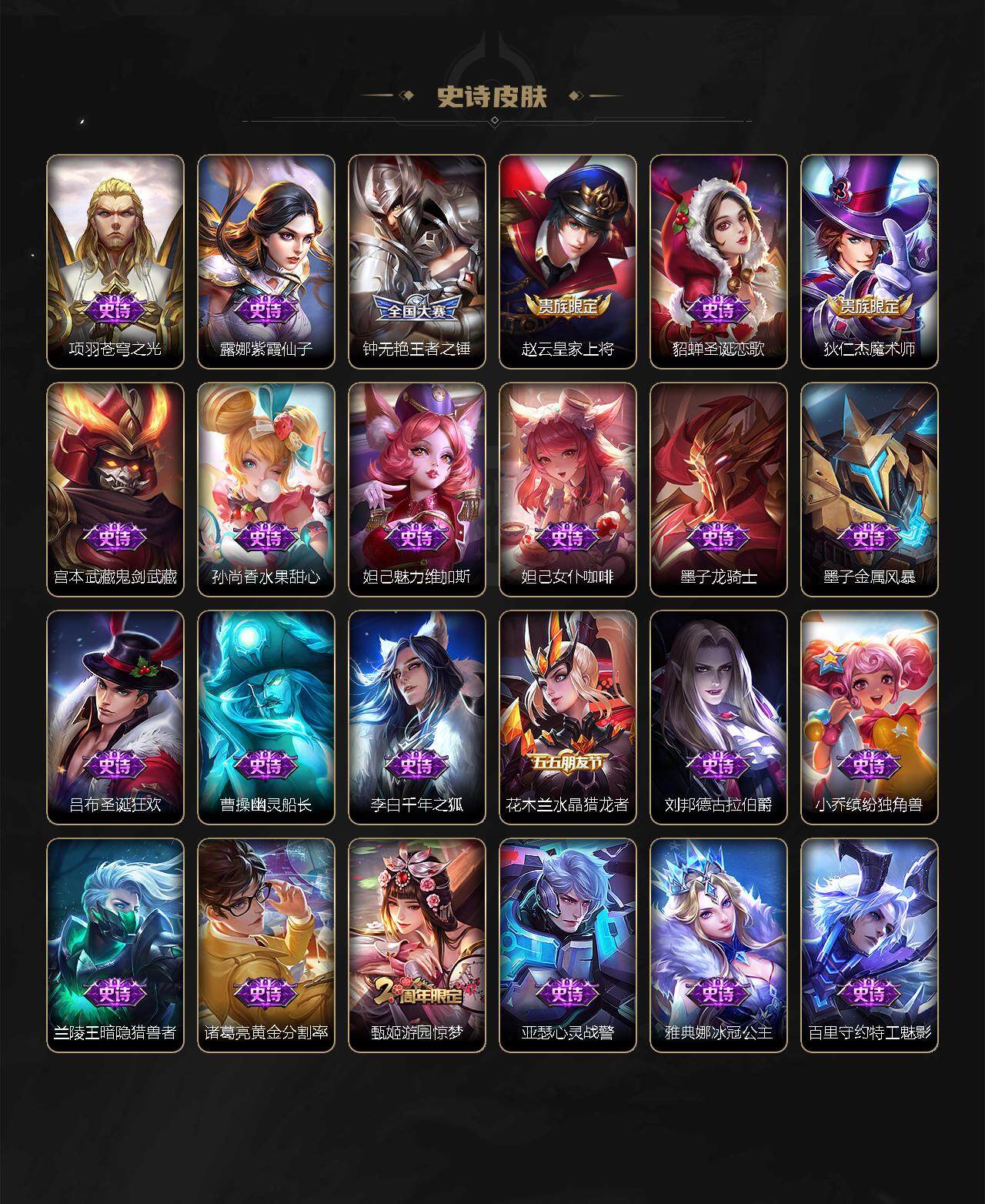 【史诗皮肤】:项羽苍穹之光,露娜紫霞仙子,钟无艳王者之锤,赵云皇家上将,貂蝉圣诞恋歌,狄仁杰魔术师,宫本武藏鬼剑武藏,孙尚香水果甜心,妲己魅力维加斯,妲己女仆咖啡,墨子龙骑士,墨子金属风暴,吕布圣诞狂欢,曹操幽灵船长,李白千年之狐,花木兰水晶猎龙者,刘邦德古拉伯爵,小乔缤纷独角兽,兰陵王暗隐猎兽者,诸葛亮黄金分割率,甄姬游园惊梦,亚瑟心灵战警,雅典娜冰冠公主,百里守约特工魅影,李元芳逐浪之夏,白起星夜王子,阿轲节奏热浪,嬴政白