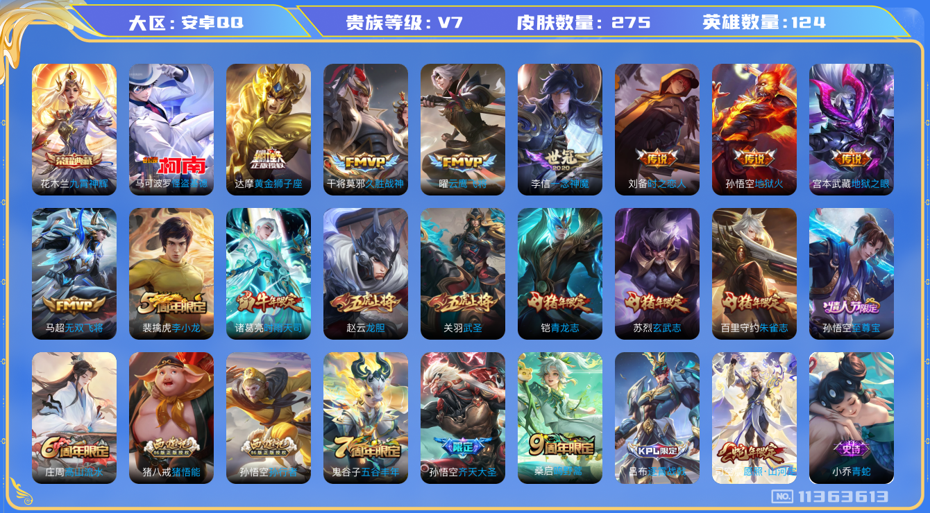 [11363613]【商品标题】:安卓Q-V7-至尊星耀II段位-124英雄-275皮肤-1典藏-0珍品无双-0无双-1珍品传说-13传说-77史诗