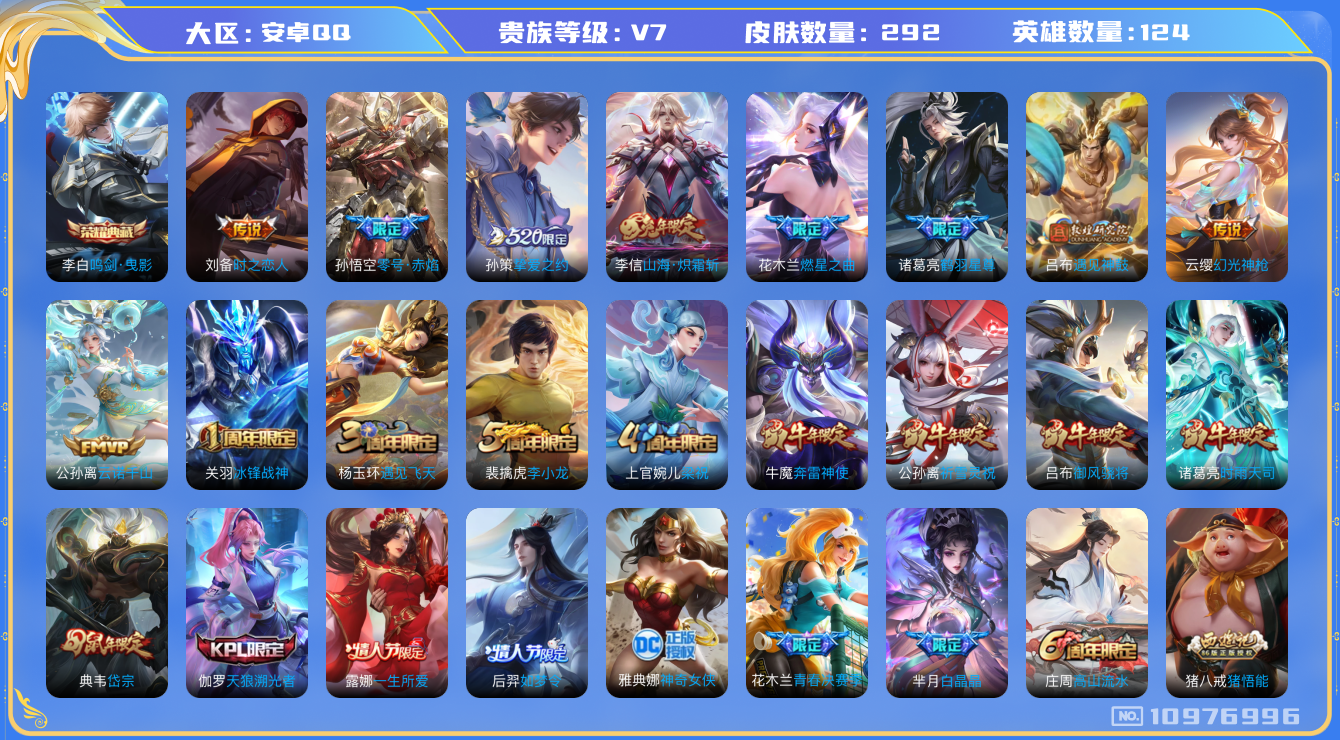 [10976996]【商品标题】:安卓Q-V7-至尊星耀V段位-124英雄-292皮肤-1典藏-0珍品无双-0无双-0珍品传说-16传说-79史诗