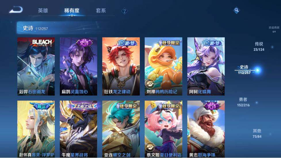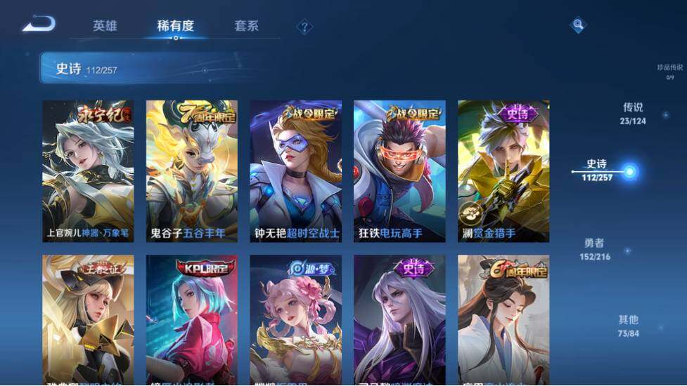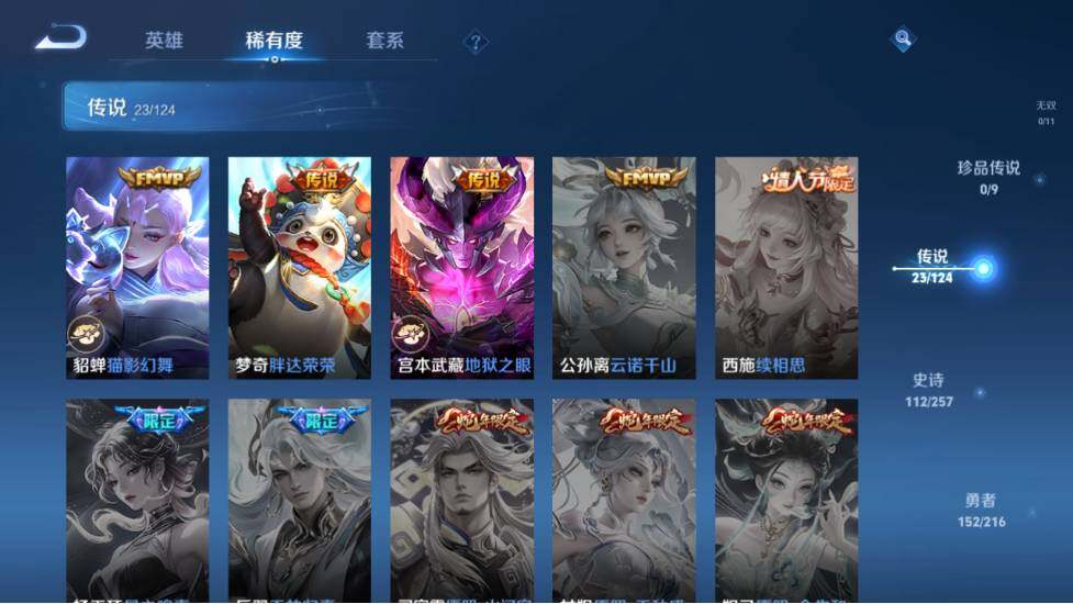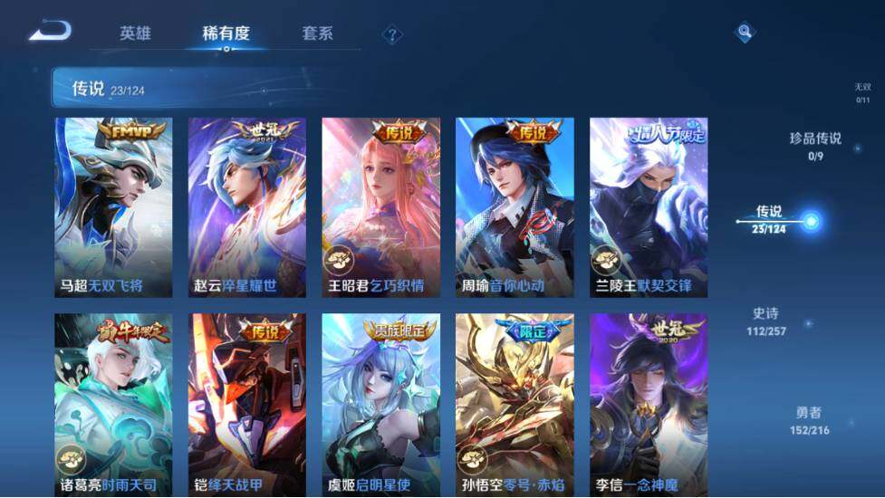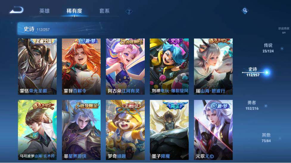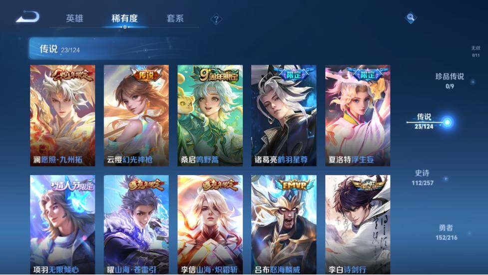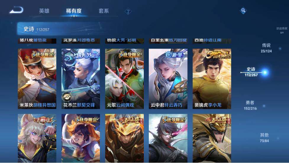 - PX_2101147-贵族等级: V7 英雄数: 117 皮肤数: 160 荣耀水晶: 神鉴启示录 无双皮: 雪境奇遇-甄姬 传说皮: 浮生妄,幻光神枪 限定皮: 李小龙,游园惊梦,梁祝,至尊宝,高山流水,孙行者,傲雪梅枪,五谷丰年,降魔,愿照·众生和,愿照·山河定,愿照·岁时盈