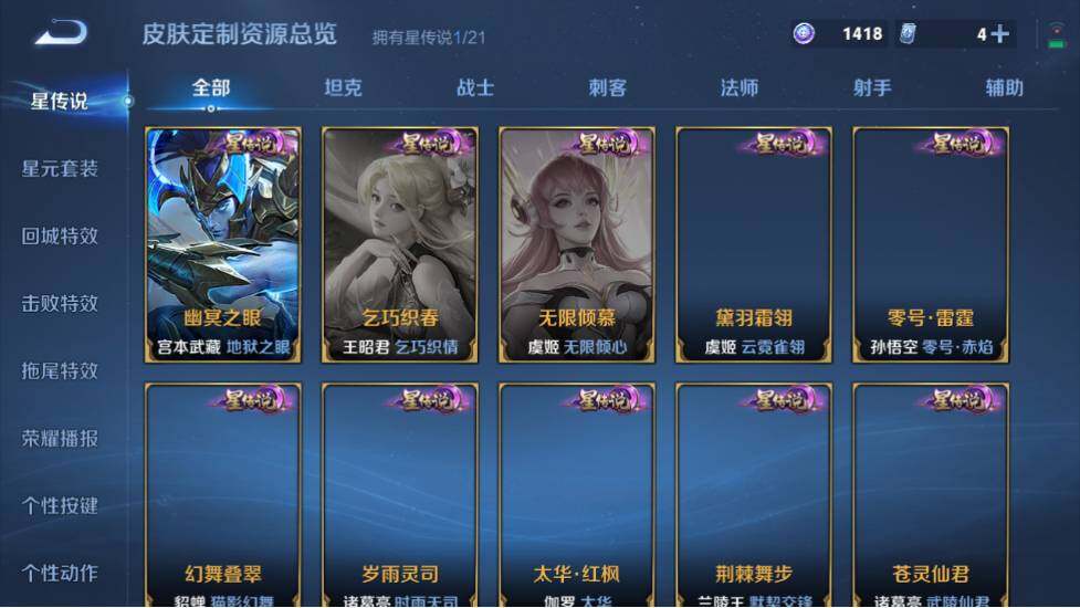 【传说皮肤】:宫本武藏地狱之眼,梦奇胖达荣荣,貂蝉猫影幻舞,李信一念神魔,孙悟空零号赤焰,虞姬启明星使,铠绛天战甲,诸葛亮时雨天司,兰陵王默契交锋,周瑜音你心动,王昭君乞巧织情,赵云淬星耀世,马超无双飞将,李白诗剑行,吕布怒海麟威,李信山海炽霜斩,曜山海苍雷引,项羽无限倾心,夏洛特浮生妄,诸葛亮鹤羽星尊,桑启鸣野蒿,云缨幻光神枪,澜愿照九州拓