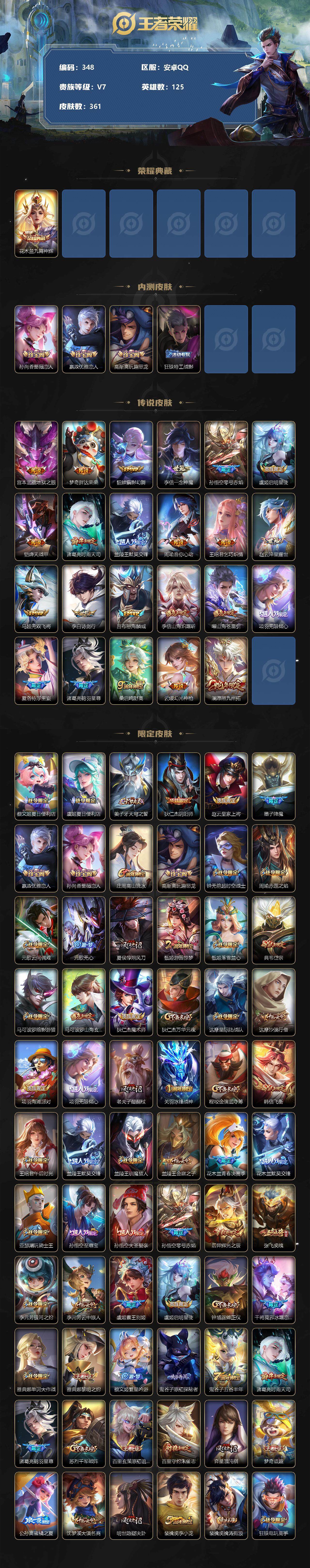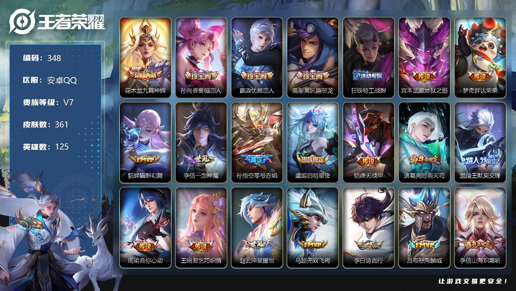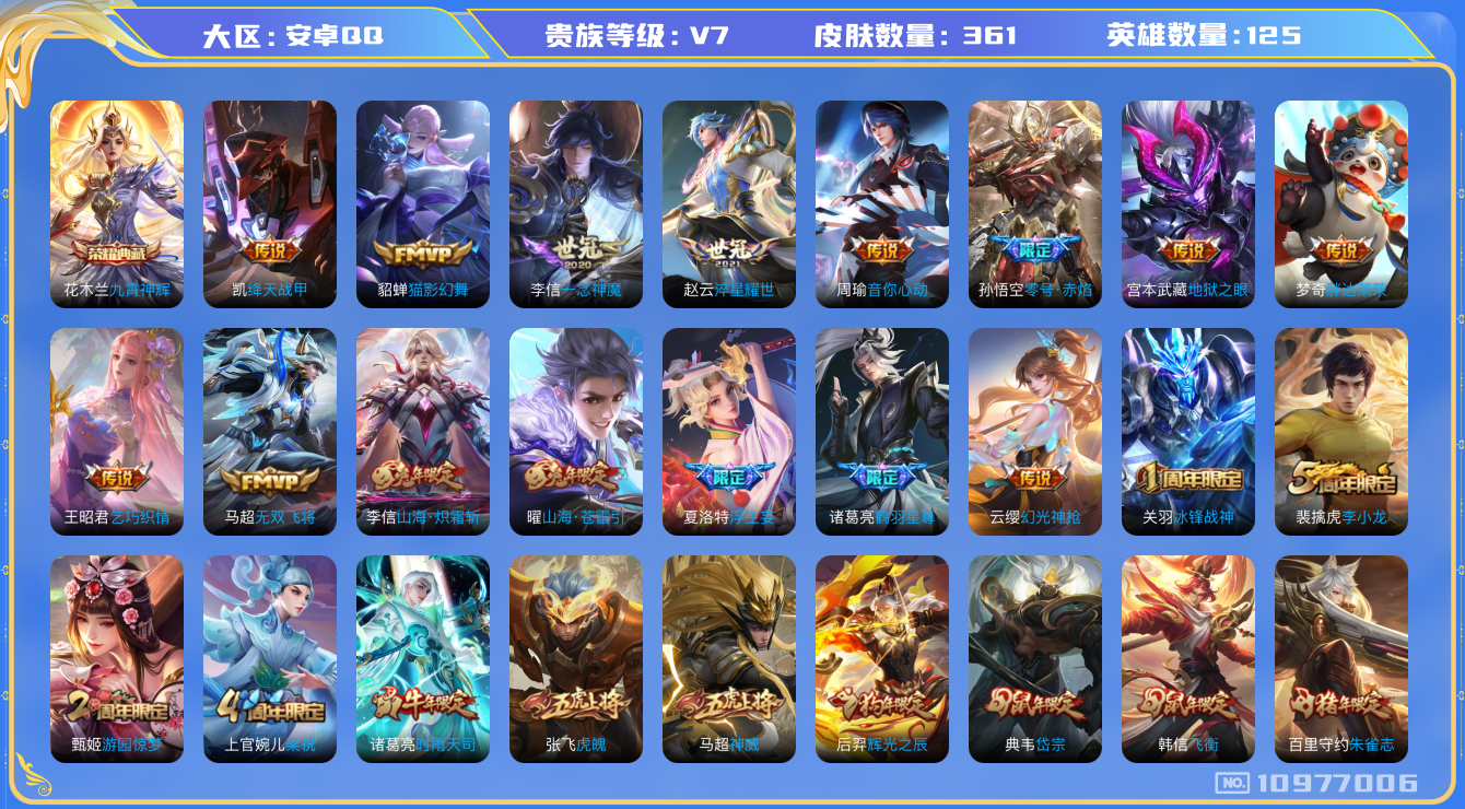 [10977006]【商品标题】:安卓Q-V7-至尊星耀V段位-125英雄-361皮肤-1典藏-0珍品无双-0无双-0珍品传说-23传说-112史诗