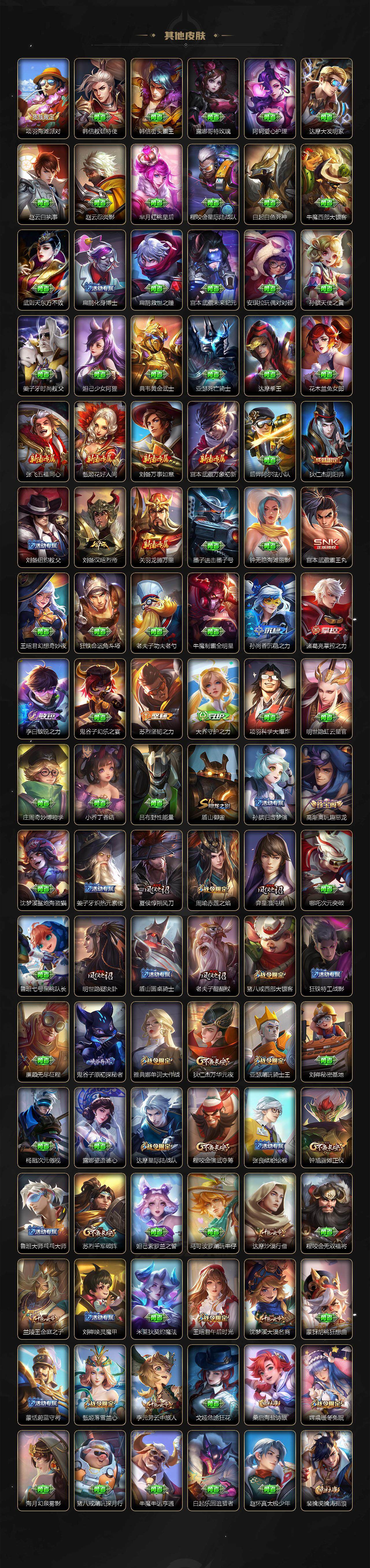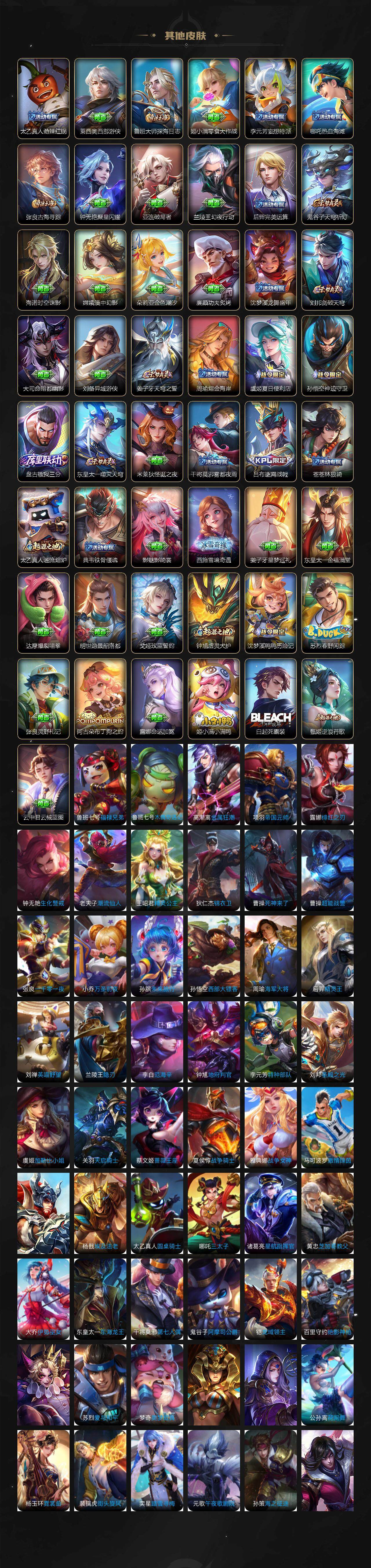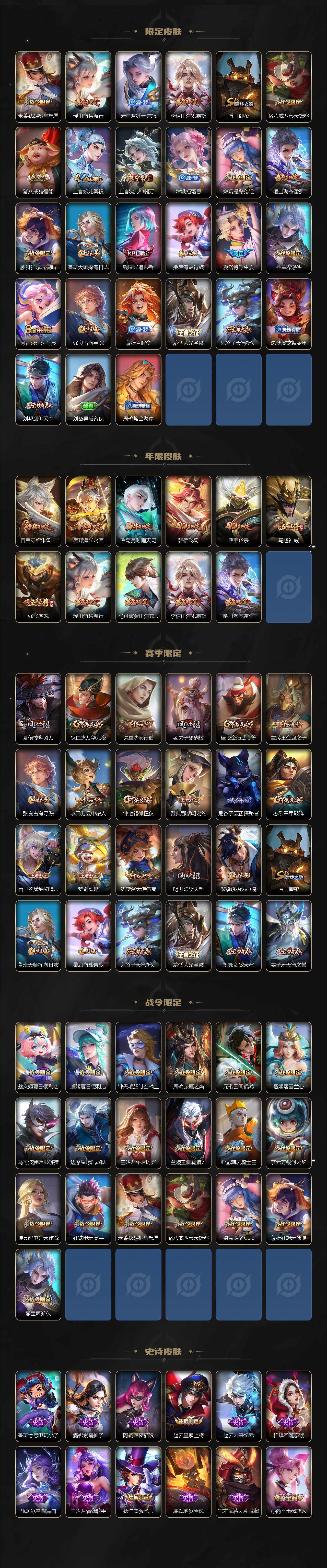 【限定皮肤】:蔡文姬夏日便利店,虞姬夏日便利店,姜子牙天穹之誓,狄仁杰阴阳师,赵云皇家上将,墨子降魔,嬴政优雅恋人,孙尚香蔷薇恋人,庄周高山流水,高渐离玩趣恶龙,钟无艳超时空战士,周瑜赤莲之焰,元歌云间偶戏,元歌无心,夏侯惇朔风刀,甄姬游园惊梦,甄姬落雪兰心,典韦岱宗,马可波罗暗影游猎,马可波罗山海玄木吟,狄仁杰魔术师,狄仁杰万华元夜,达摩星际陆战队,达摩沙漠行僧,项羽海滩派对,项羽无限倾心,老夫子醍醐杖,关羽冰锋战神,程咬金演武夺筹,韩信飞衡,王昭君午后时光,兰陵王默契交锋,兰陵王驯魔猎人,兰陵王金庭之子,花木兰青春决赛季,花木兰默契交锋,亚瑟潮玩骑士王,孙悟空至尊宝,孙悟空大圣娶亲,孙悟空零号赤焰,后羿辉光之辰,张飞虎魄,李元芳银河之约,李元芳云中旅人,虞姬霸王别姬,虞姬启明星使,钟馗驱傩正仪,干将莫邪冰霜恋舞曲,雅典娜单词大作战,雅典娜黎明之约,蔡文姬繁星吟游,鬼谷子原初探秘者,鬼谷子五谷丰年,诸葛亮时雨天司,诸葛亮鹤羽星尊,苏烈千军破阵,百里玄策原初追逐者,百里守约朱雀志,弈星混沌棋,梦奇顽趣,公孙离蜜橘之夏,沈梦溪大漠名商,明世隐疑决卦,裴擒虎李小龙,裴擒虎擒涛扼浪,狂铁电玩高手,米莱狄胡桃异想国,瑶山海碧波行,云中君纤云弄巧,李信山海炽霜斩,盾山御銮,猪八戒西部大镖客,猪八戒猪悟能,上官婉儿梁祝,上官婉儿神器万象笔,嫦娥拒霜思,嫦娥暖冬兔眠,曜山海苍雷引,蒙犽狂想玩偶喵,鲁班大师探海日志,镜匿光追影者,桑启海盐诗旅,夏洛特浮生妄,暃星界游侠,阿古朵江河有灵,张良古海寻踪,蒙犽百解令,蒙恬荣光圣徽,鬼谷子天穹祈灯,沈梦溪龙舞盛年,刘邦剑破天穹,刘备异域游侠,周瑜熔金海岸