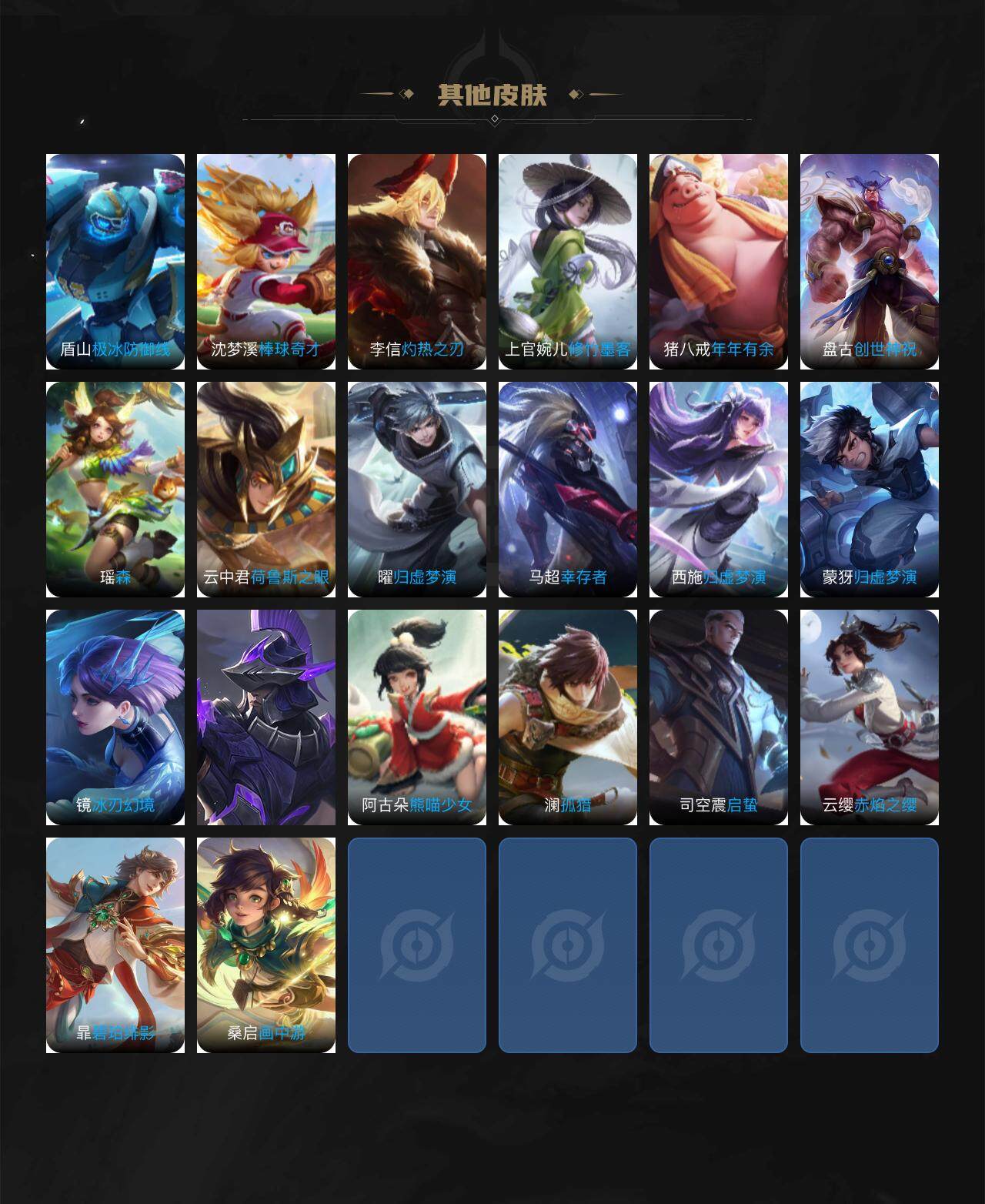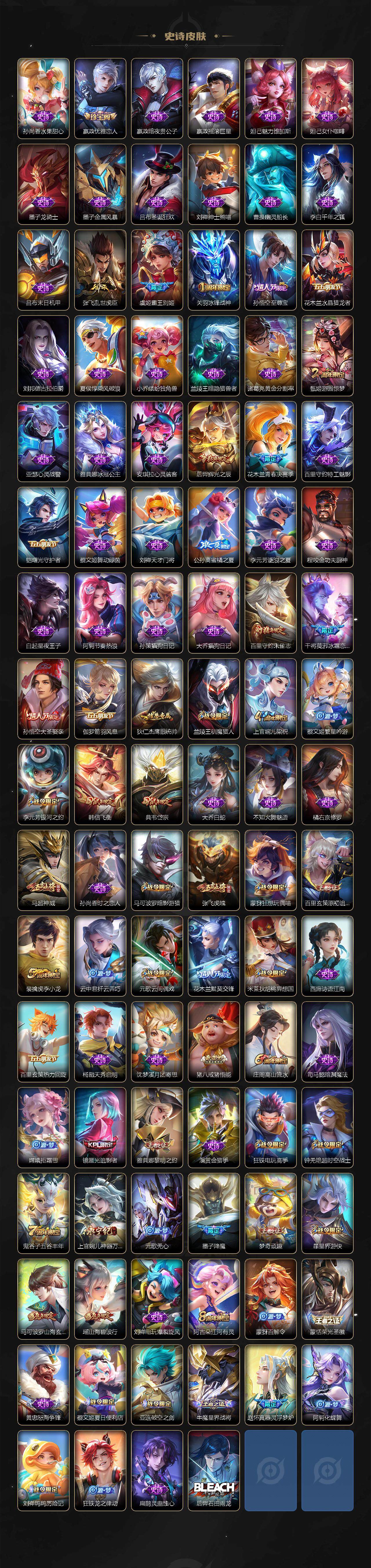 关羽冰锋战神,裴擒虎李小龙,上官婉儿梁祝,诸葛亮时雨天司,张飞虎魄,马超神威,后羿辉光之辰,典韦岱宗,韩信飞衡,百里守约朱雀志,虞姬霸王别姬,孙悟空大圣娶亲,花木兰默契交锋,兰陵王默契交锋,孙悟空至尊宝,干将莫邪冰霜恋舞曲,花木兰青春决赛季,公孙离蜜橘之夏,猪八戒猪悟能,镜匿光追影者,上官婉儿神器·万象笔,墨子降魔,李白诗剑行,马可波罗山海·玄木吟,瑶山海·碧波行,桑启鸣野蒿,澜愿照·九州拓