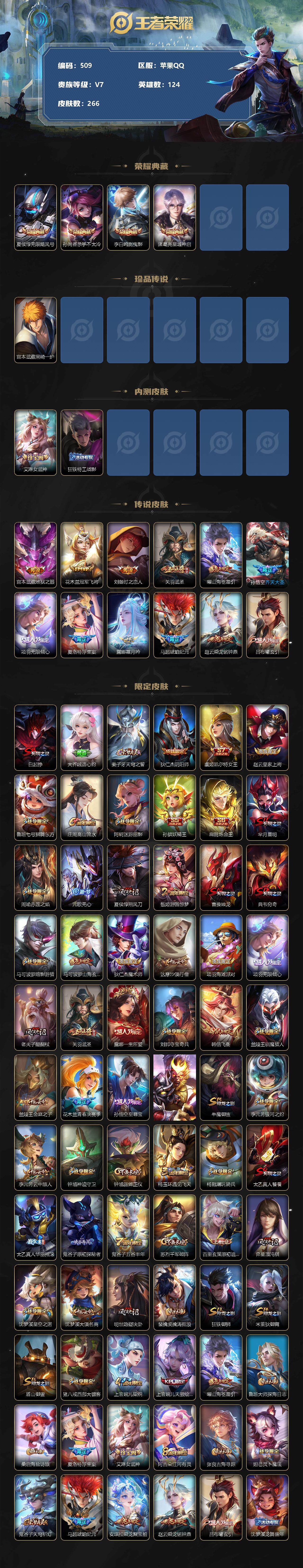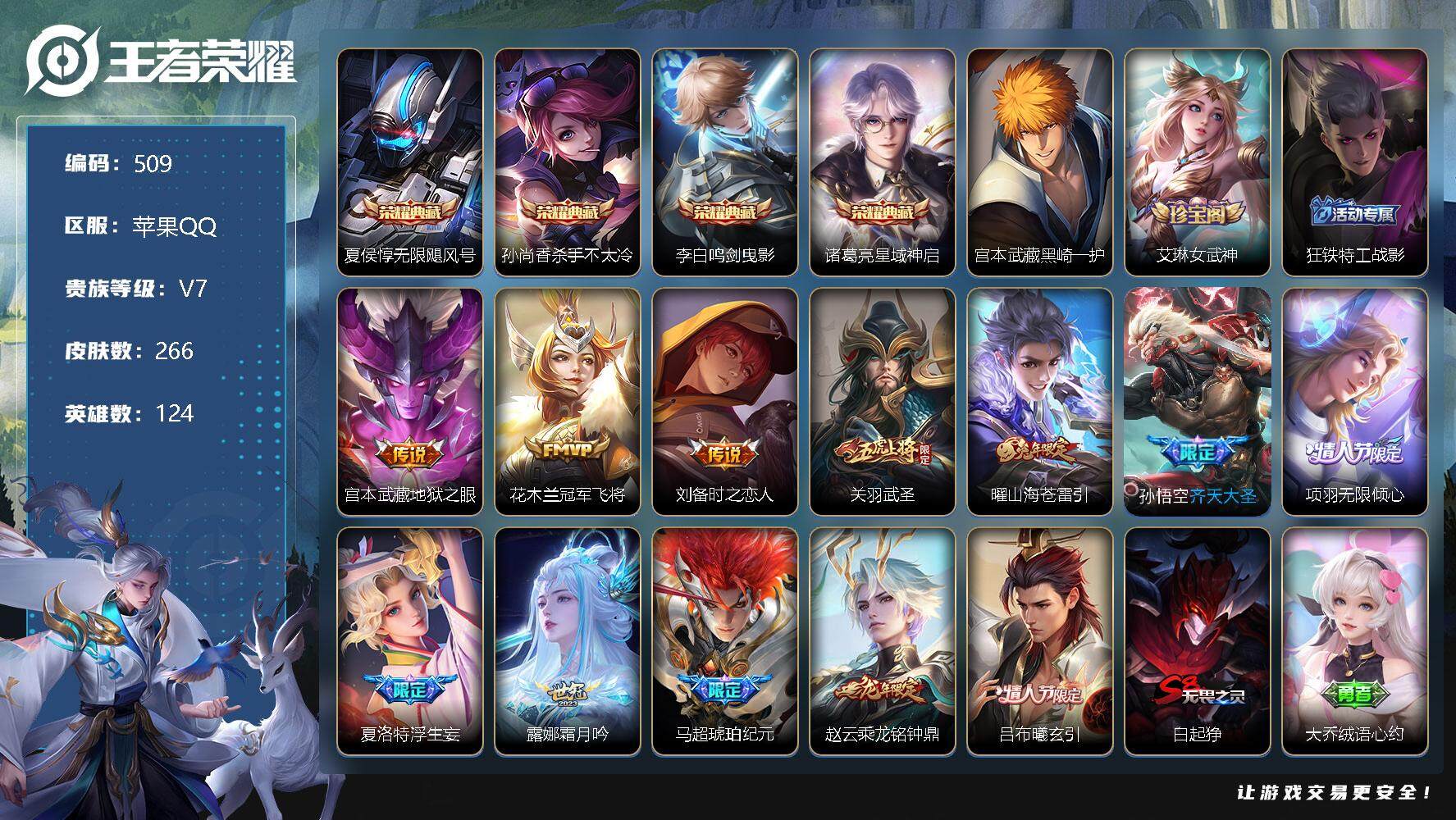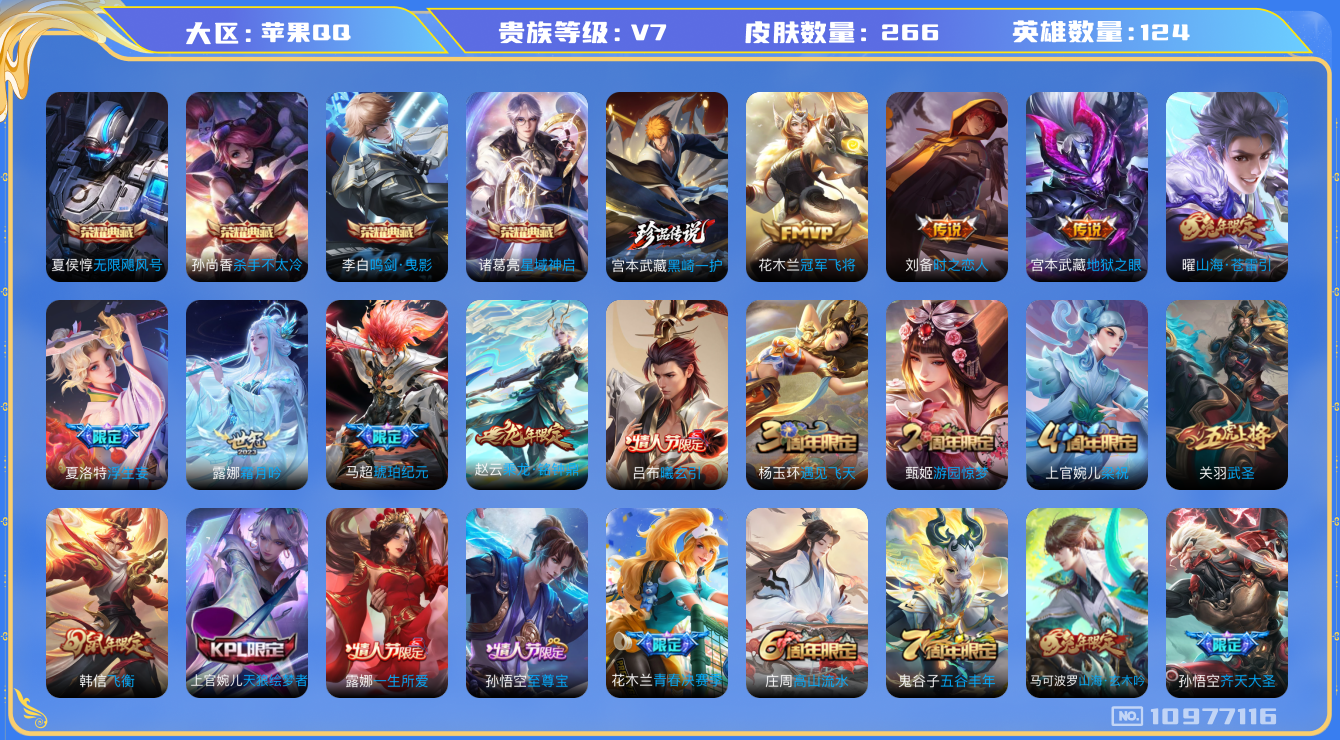 [10977116]【商品标题】:苹果Q-V7-永恒钻石II段位-124英雄-266皮肤-4典藏-0珍品无双-0无双-1珍品传说-12传说-58史诗