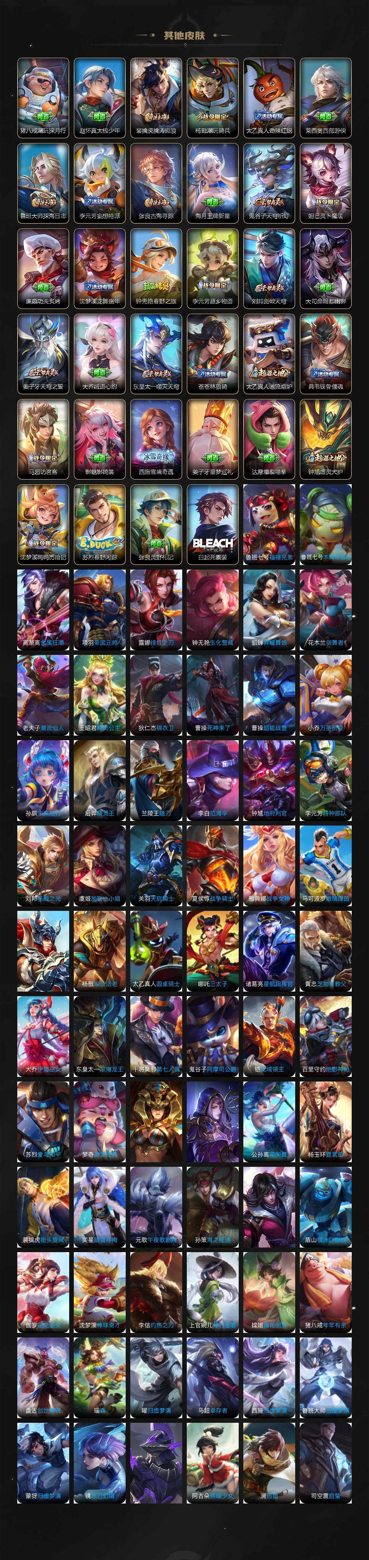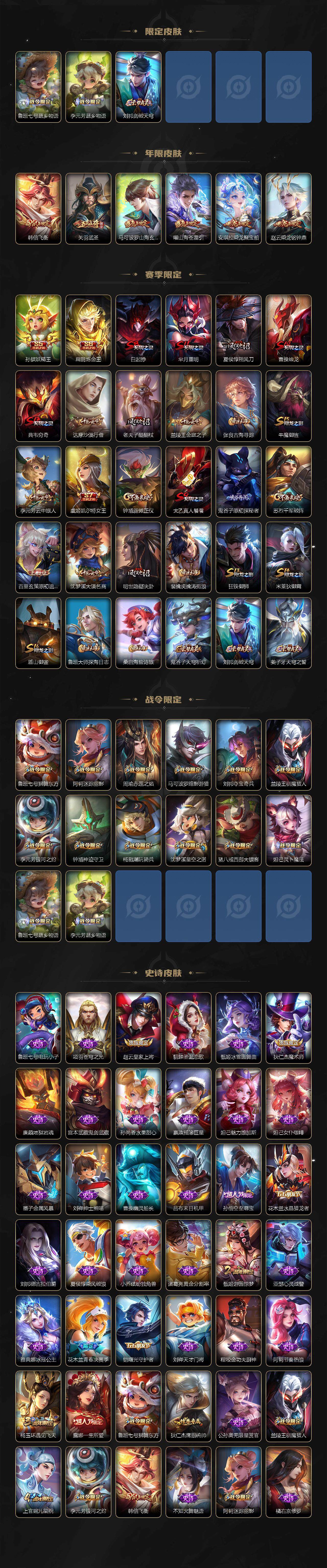 【限定皮肤】:白起狰,大乔绒语心约,姜子牙天穹之誓,狄仁杰阴阳师,虞姬凯尔特女王,赵云皇家上将,鲁班七号狮舞东方,庄周高山流水,阿轲迷踪丽影,孙膑妖精王,扁鹊炼金王,芈月重明,周瑜赤莲之焰,元歌无心,夏侯惇朔风刀,甄姬游园惊梦,曹操烛龙,典韦穷奇,马可波罗暗影游猎,马可波罗山海玄木吟,狄仁杰魔术师,达摩沙漠行僧,项羽海滩派对,项羽无限倾心,老夫子醍醐杖,关羽武圣,露娜一生所爱,刘邦夺宝奇兵,韩信飞衡,兰陵王驯魔猎人,兰陵王金庭之子,花木兰青春决赛季,孙悟空至尊宝,孙悟空齐天大圣,牛魔御旌,李元芳银河之约,李元芳云中旅人,钟馗神迹守卫,钟馗驱傩正仪,杨玉环遇见飞天,杨戬潮玩骑兵,太乙真人饕餮,太乙真人华丽摇滚,鬼谷子原初探秘者,鬼谷子五谷丰年,苏烈千军破阵,百里玄策原初追逐者,弈星混沌棋,沈梦溪星空之诺,沈梦溪大漠名商,明世隐疑决卦,裴擒虎擒涛扼浪,狂铁御狮,米莱狄御霄,盾山御銮,猪八戒西部大镖客,上官婉儿梁祝,上官婉儿天狼绘梦者,曜山海苍雷引,鲁班大师探海日志,桑启海盐诗旅,夏洛特浮生妄,艾琳女武神,阿古朵江河有灵,张良古海寻踪,妲己灵卜魔法,鬼谷子天穹祈灯,马超琥珀纪元,安琪拉乘龙聚宝船,赵云乘龙铭钟鼎,吕布曦玄引,沈梦溪龙舞盛年,鲁班七号蔬乡物语,李元芳蔬乡物语,刘邦剑破天穹