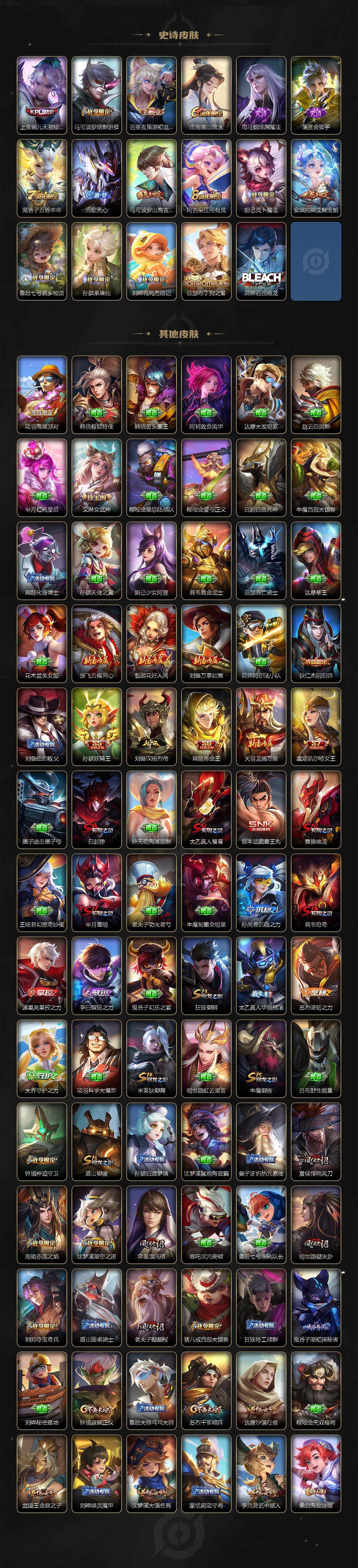 - PX_2103122-Q/最强王者/215皮肤/121英雄/0典藏/0珍品无双/0无双/0珍品传说/9传说/52史诗/7稀有英雄 【9 传说皮肤】李逍遥 曜,仲夏夜之梦 貂蝉,炽阳神光 镜,黄金狮子座 达摩,霜北刀 夏侯惇,冥王哈迪斯 铠,心动手记 朵莉亚,幻光神枪 云缨,鸣野蒿 桑启, 【52 史诗皮肤】末日机甲 吕布,白昼王子 嬴政,时之奇旅 妲己,冰霜恋舞曲 干将莫邪,狮舞东方 鲁班七号,