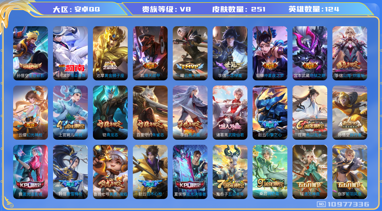 [10977336]【商品标题】:安卓Q-V8-永恒钻石V段位-124英雄-251皮肤-1典藏-0珍品无双-0无双-1珍品传说-13传说-74史诗
