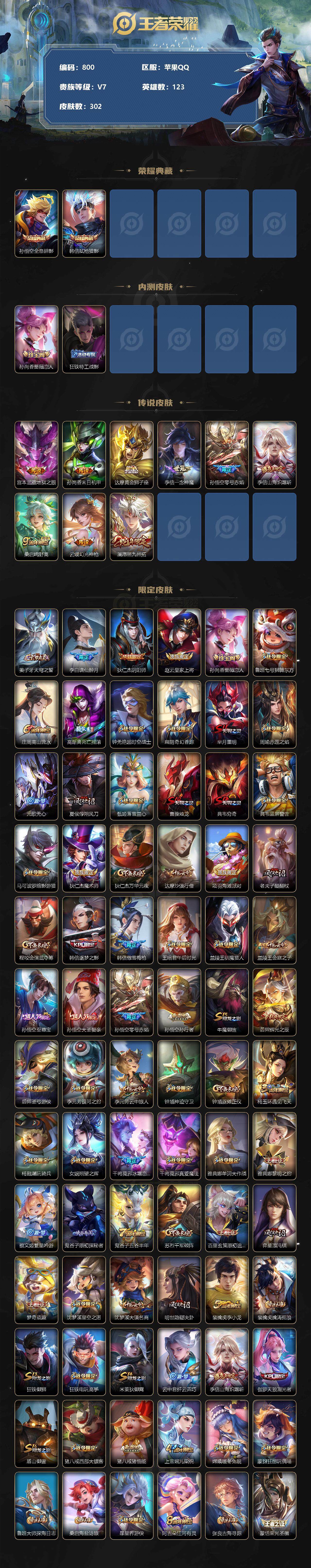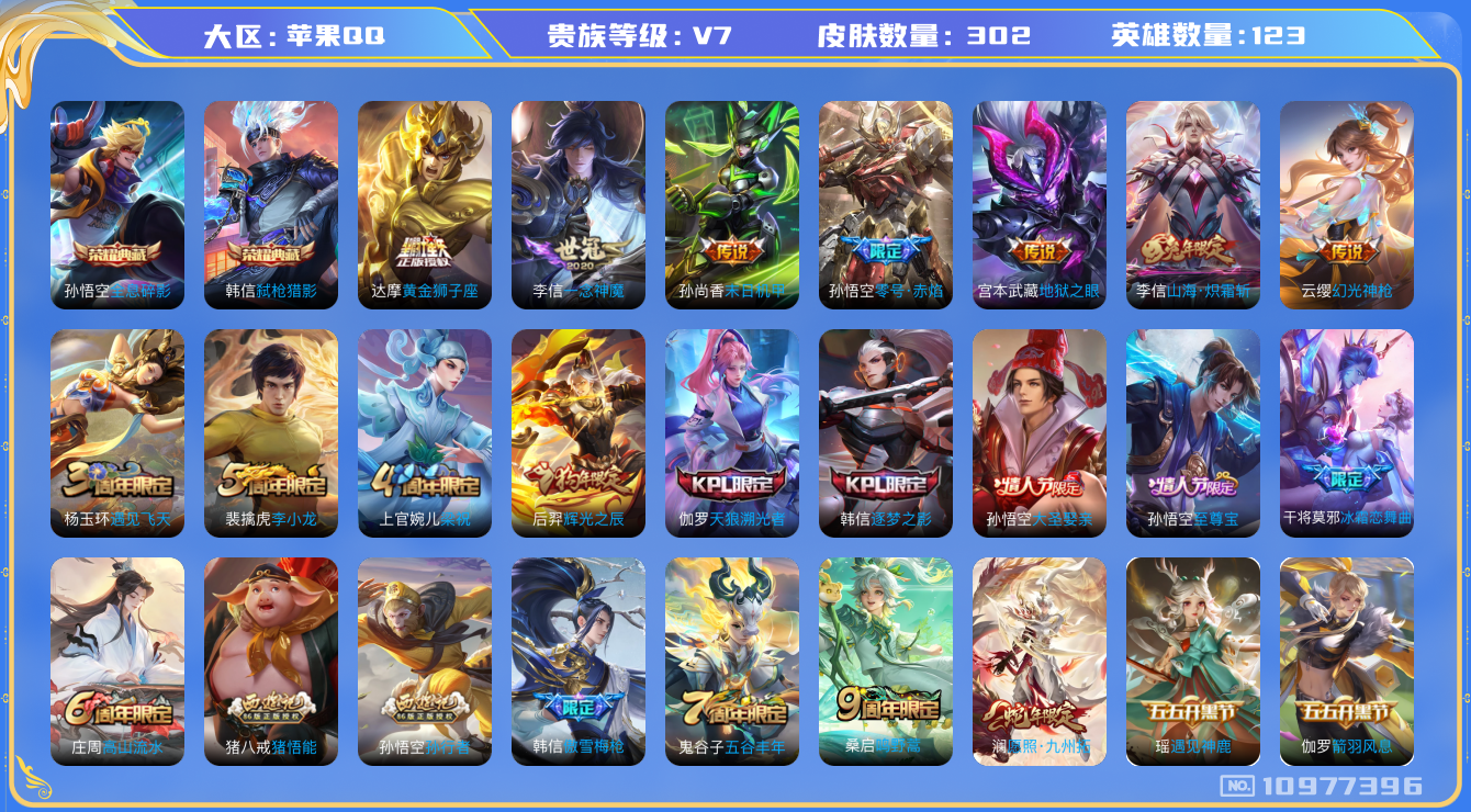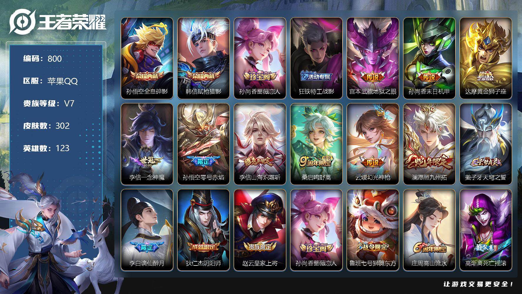 [10977396]【商品标题】:苹果Q-V7-至尊星耀IV段位-123英雄-302皮肤-2典藏-0珍品无双-0无双-0珍品传说-9传说-81史诗