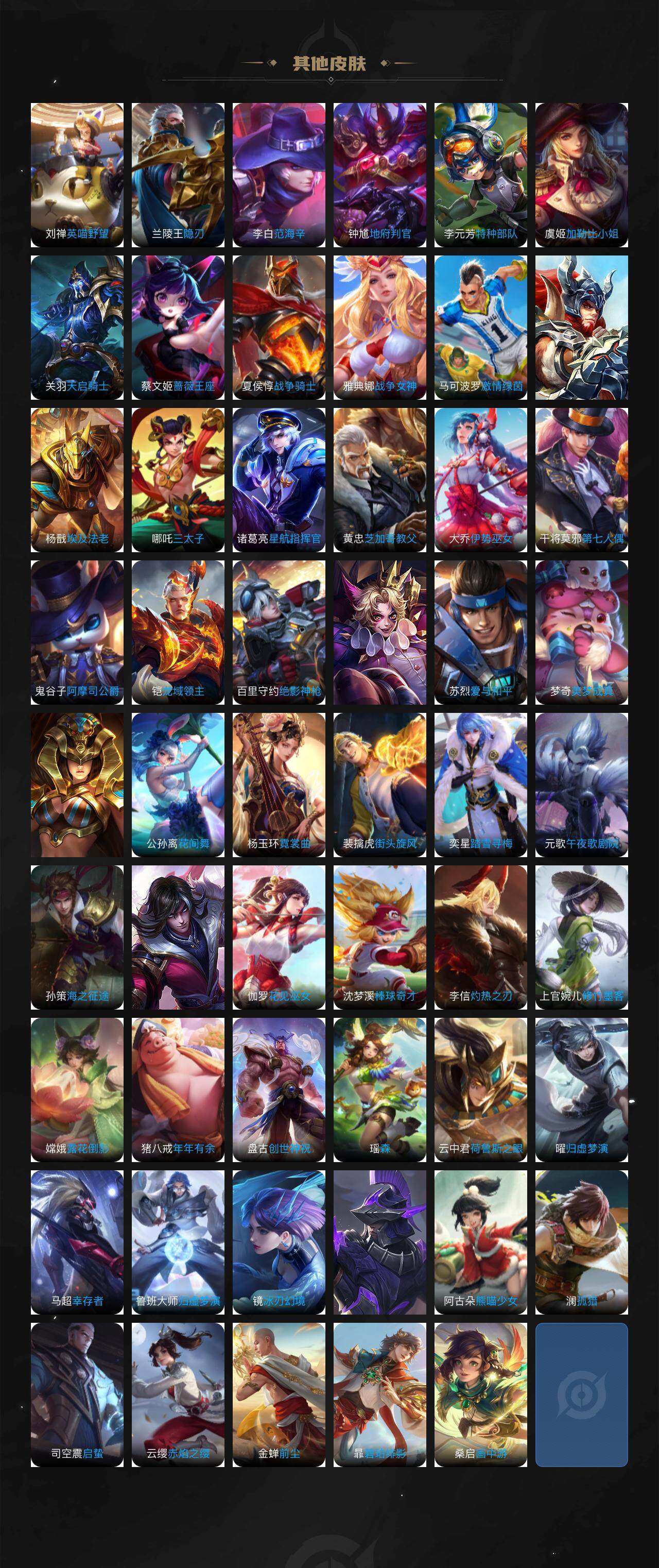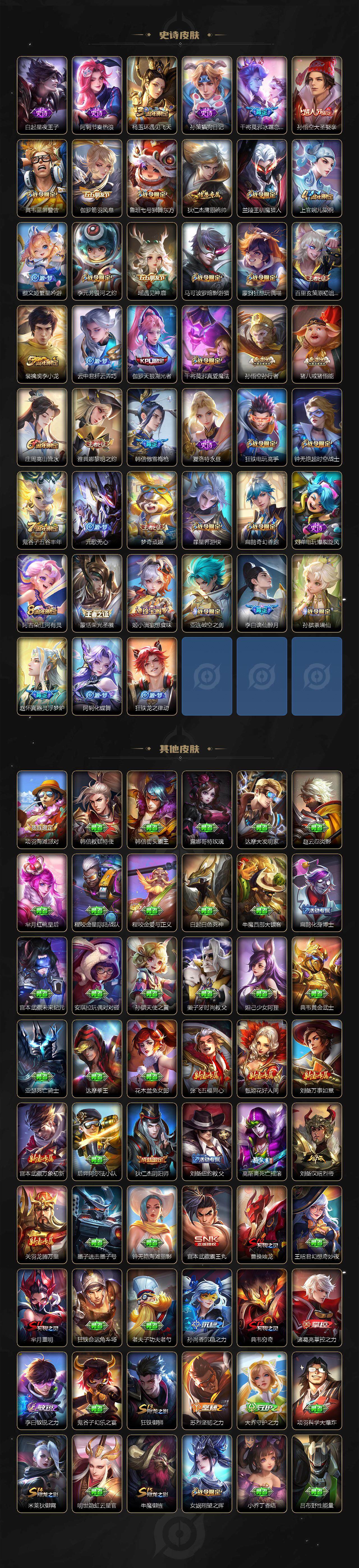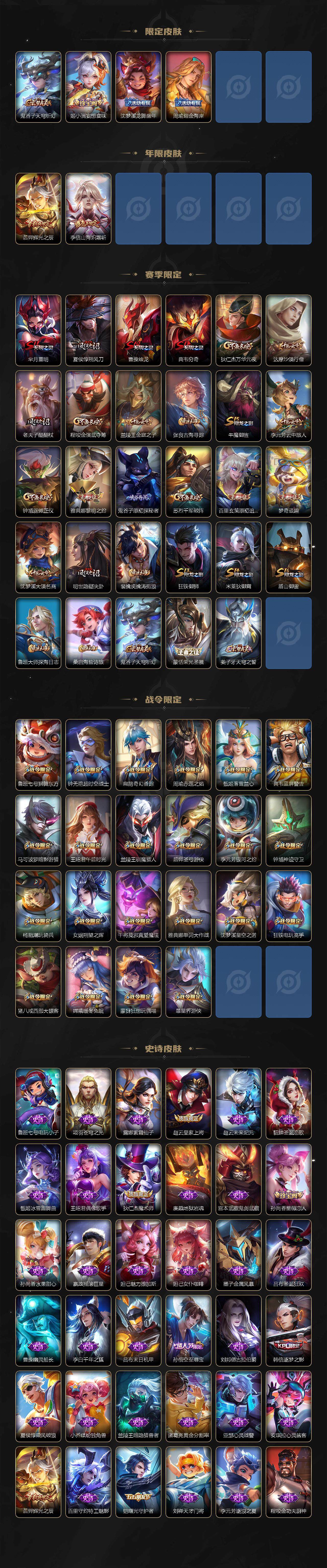 【限定皮肤】:姜子牙天穹之誓,李白谪仙醉月,狄仁杰阴阳师,赵云皇家上将,孙尚香蔷薇恋人,鲁班七号狮舞东方,庄周高山流水,高渐离死亡摇滚,钟无艳超时空战士,扁鹊奇幻香踪,芈月重明,周瑜赤莲之焰,元歌无心,夏侯惇朔风刀,甄姬落雪兰心,曹操烛龙,典韦穷奇,典韦蓝屏警告,马可波罗暗影游猎,狄仁杰魔术师,狄仁杰万华元夜,达摩沙漠行僧,项羽海滩派对,老夫子醍醐杖,程咬金演武夺筹,韩信逐梦之影,韩信傲雪梅枪,王昭君午后时光,兰陵王驯魔猎人,兰陵王金庭之子,孙悟空至尊宝,孙悟空大圣娶亲,孙悟空零号赤焰,孙悟空孙行者,牛魔御旌,后羿辉光之辰,后羿圣弓游侠,李元芳银河之约,李元芳云中旅人,钟馗神迹守卫,钟馗驱傩正仪,杨玉环遇见飞天,杨戬潮玩骑兵,女娲朔望之晖,干将莫邪冰霜恋舞曲,干将莫邪真爱魔法,雅典娜单词大作战,雅典娜黎明之约,蔡文姬繁星吟游,鬼谷子原初探秘者,鬼谷子五谷丰年,苏烈千军破阵,百里玄策原初追逐者,弈星混沌棋,梦奇顽趣,沈梦溪星空之诺,沈梦溪大漠名商,明世隐疑决卦,裴擒虎李小龙,裴擒虎擒涛扼浪,狂铁御狮,狂铁电玩高手,米莱狄御霄,云中君纤云弄巧,李信山海炽霜斩,伽罗天狼溯光者,盾山御銮,猪八戒西部大镖客,猪八戒猪悟能,上官婉儿梁祝,嫦娥暖冬兔眠,蒙犽狂想玩偶喵,鲁班大师探海日志,桑启海盐诗旅,暃星界游侠,阿古朵江河有灵,张良古海寻踪,蒙恬荣光圣徽,鬼谷子天穹祈灯,姬小满妄想食味,沈梦溪龙舞盛年,周瑜熔金海岸