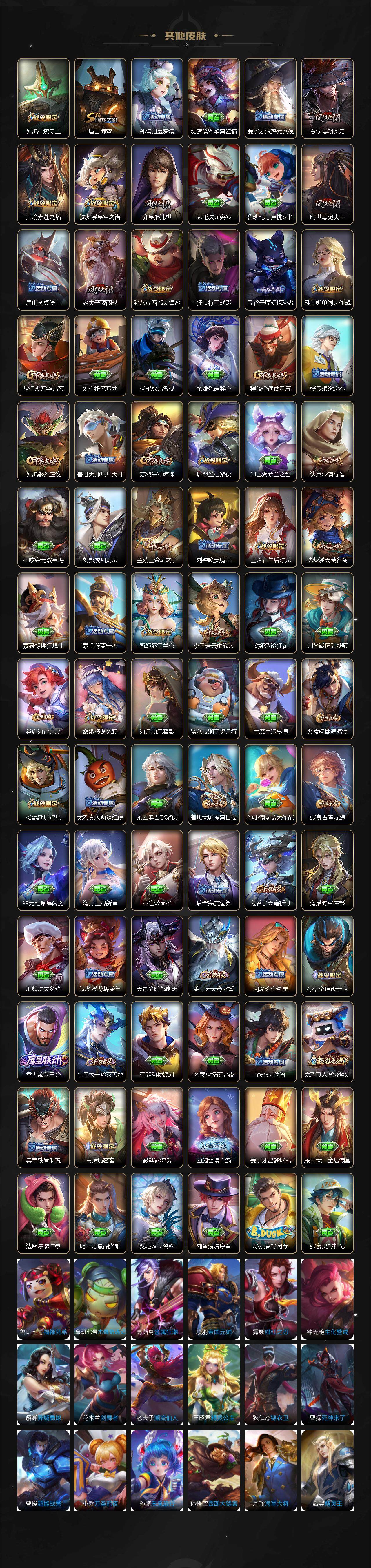 瑶遇见神鹿,伽罗箭羽风息,李元芳逐浪之夏,孙策猫狗日记,阿轲节奏热浪,露娜紫霞仙子,诸葛亮黄金分割率,王昭君偶像歌手,项羽苍穹之光,吕布末日机甲,鲁班七号电玩小子,嬴政摇滚巨星,刘禅天才门将,白起星夜王子,安琪拉心灵骇客,程咬金功夫厨神,刘邦德古拉伯爵,兰陵王暗隐猎兽者,曹操幽灵船长,宫本武藏鬼剑武藏,亚瑟心灵战警,廉颇地狱岩魂,小乔缤纷独角兽,夏侯惇乘风破浪,铠曙光守护者,墨子金属风暴,百里玄策原初追逐者,吕布圣诞狂欢,貂蝉圣诞恋歌,百里守约特工魅影,雅典娜黎明之约,李白千年之狐,夏洛特永昼,刘禅电玩·爆裂旋风,李白谪仙醉月,赵怀真器灵·浮梦炉