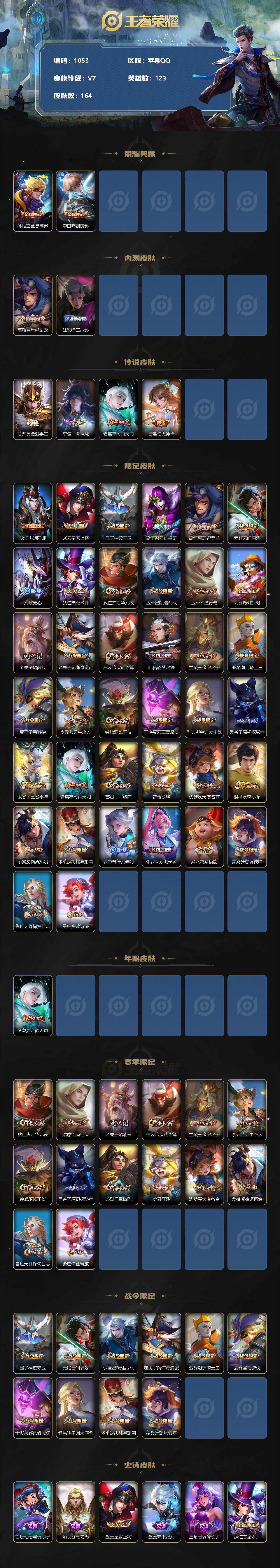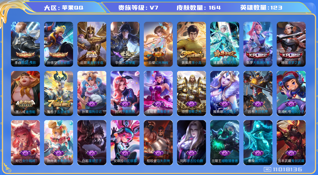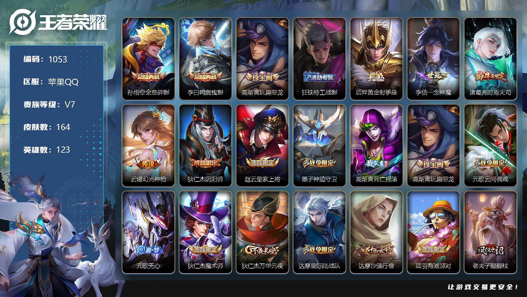 [11018136]【商品标题】:苹果Q-V0-至尊星耀IV段位-123英雄-164皮肤-2典藏-0珍品无双-0无双-0珍品传说-4传说-46史诗