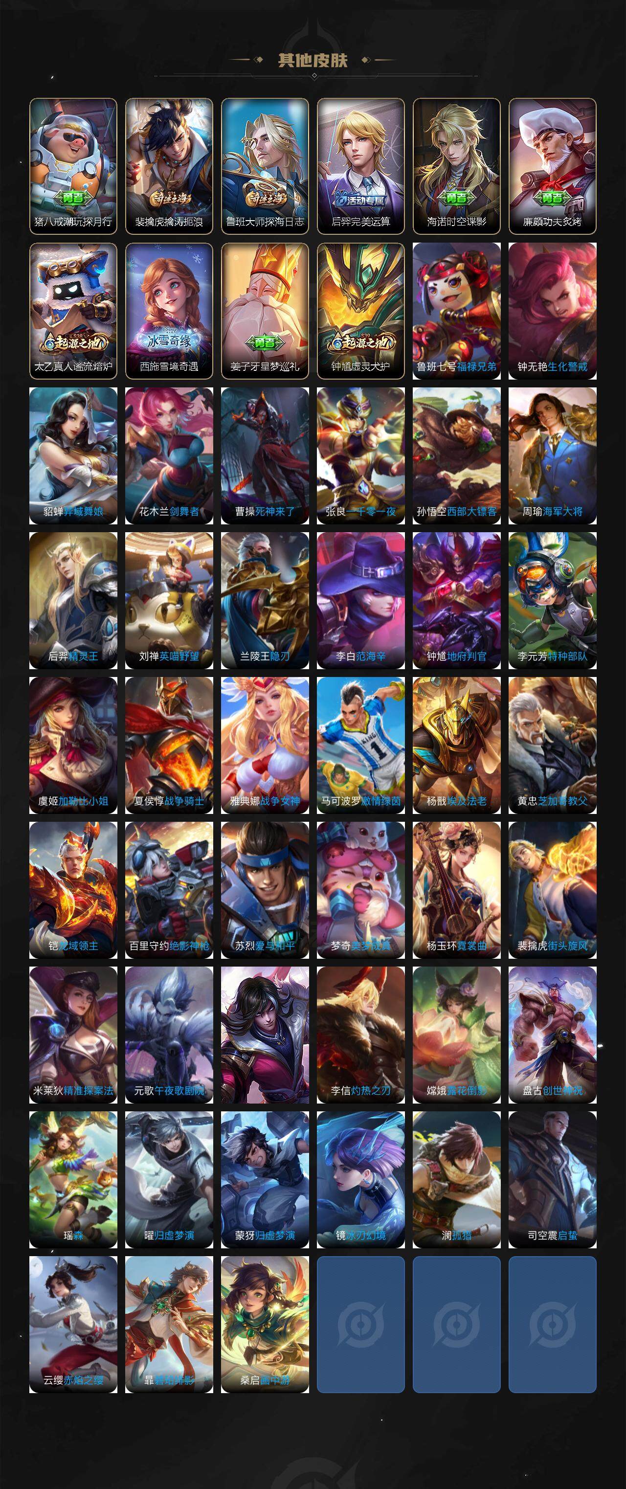 【史诗皮肤】:鲁班七号电玩小子,项羽苍穹之光,赵云皇家上将,赵云未来纪元,王昭君偶像歌手,狄仁杰魔术师,廉颇地狱岩魂,宫本武藏鬼剑武藏,孙尚香水果甜心,妲己魅力维加斯,妲己女仆咖啡,墨子金属风暴,吕布圣诞狂欢,曹操幽灵船长,吕布末日机甲,刘邦德古拉伯爵,韩信逐梦之影,夏侯惇乘风破浪,小乔缤纷独角兽,兰陵王暗隐猎兽者,亚瑟心灵战警,雅典娜冰冠公主,安琪拉心灵骇客,百里守约特工魅影,铠曙光守护者,程咬金功夫厨神,白起星夜王子,阿轲节奏热浪,孙策猫狗日记,狄仁杰鹰眼统帅,蒙犽狂想玩偶喵,裴擒虎李小龙,云中君纤云弄巧,元歌云间偶戏,米莱狄胡桃异想国,老夫子航海奇遇记,伽罗天狼溯光者,干将莫邪真爱魔法,沈梦溪月团寄思,钟馗乐园奇幻夜,猪八戒猪悟能,鬼谷子五谷丰年,元歌无心,梦奇顽趣,弈